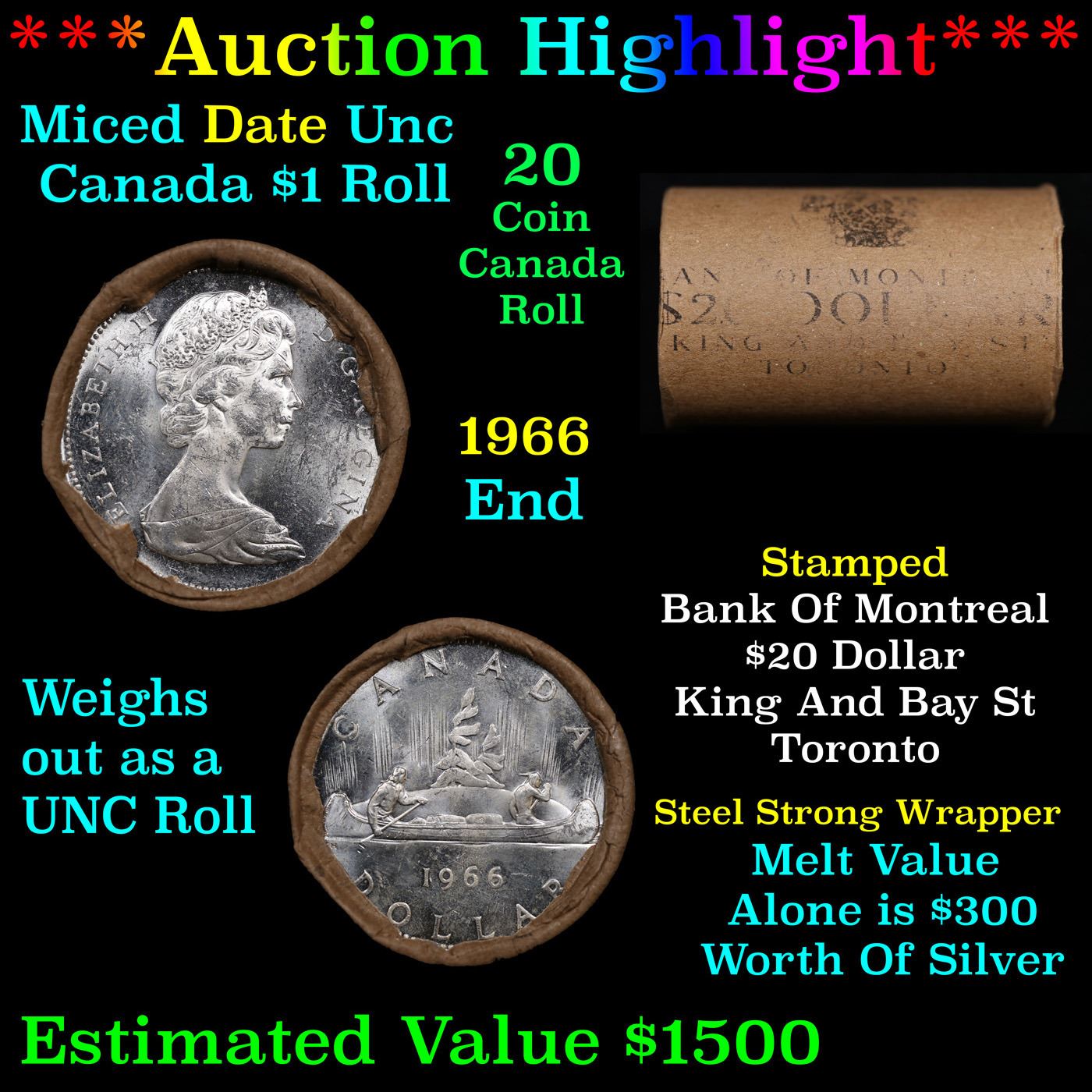 ***Auction Highlight*** Full $20 Bank of Montreal Roll of Silver Mix date with 1966 Ends, Canadian Dollar with Queen Elizabeth II, 20 Coins in total.. This roll is held in an old Bank of Montreal, King and Bay St, Toronto Wrapper with Tight Shotgun Ends, all appear to be GEM or higher. Had not been check for types.