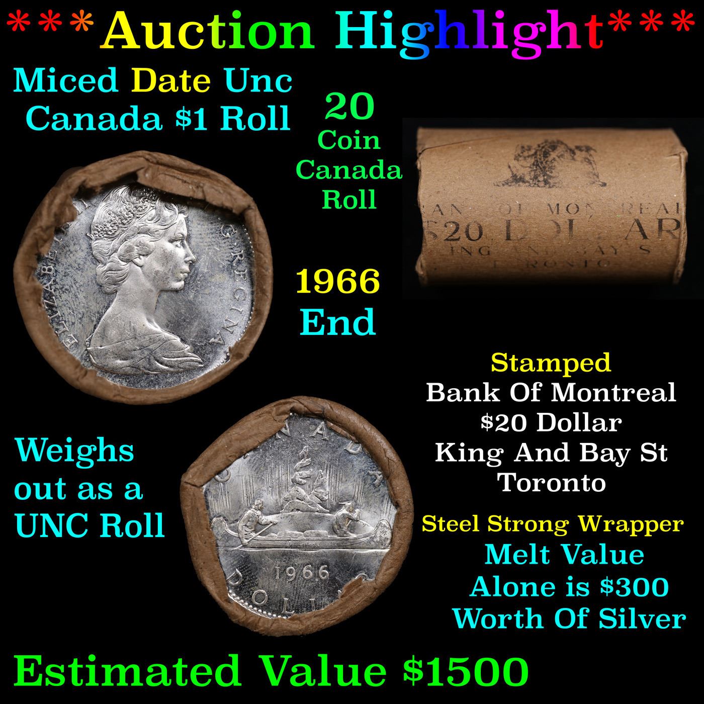 ***Auction Highlight*** Full $20 Bank of Montreal Roll of Silver Mix date with 1966 Ends, Canadian Dollar with Queen Elizabeth II, 20 Coins in total.. This roll is held in an old Bank of Montreal, King and Bay St, Toronto Wrapper with Tight Shotgun Ends, all appear to be GEM or higher. Had not been check for types.