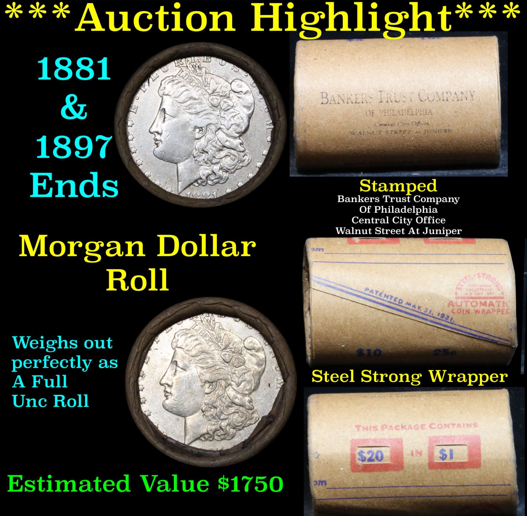 ***Auction Highlight*** Full Morgan/Peace silver dollar roll $20, 1881 & 1897 ends Mixed dates . This roll is held in an old Steel strong wrapper, patented 1921, stamped "Bankers Trust Company of PhiladelphiaÓ, Walnut Street at Juniper. This roll contains 20 Morgan and/or Peace Silver Dollars. The coins may range from circulated to uncirculated. Any condition is possible. The Dates may range from 1878 to 1935. Better dates/mint marks & conditions may be found but should not be expected. We have weighed the roll and can assure you that it is both 20 Silver Dollars and that it is not an uncirculated roll as the weight comes in slightly under the 534.60 grams that a fully uncirculated roll would weigh. We recently Acquired a huge Estate Hoard of these Rolls.