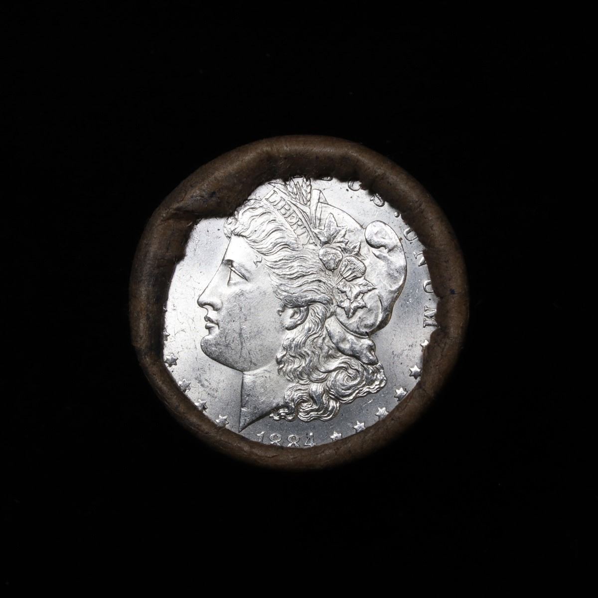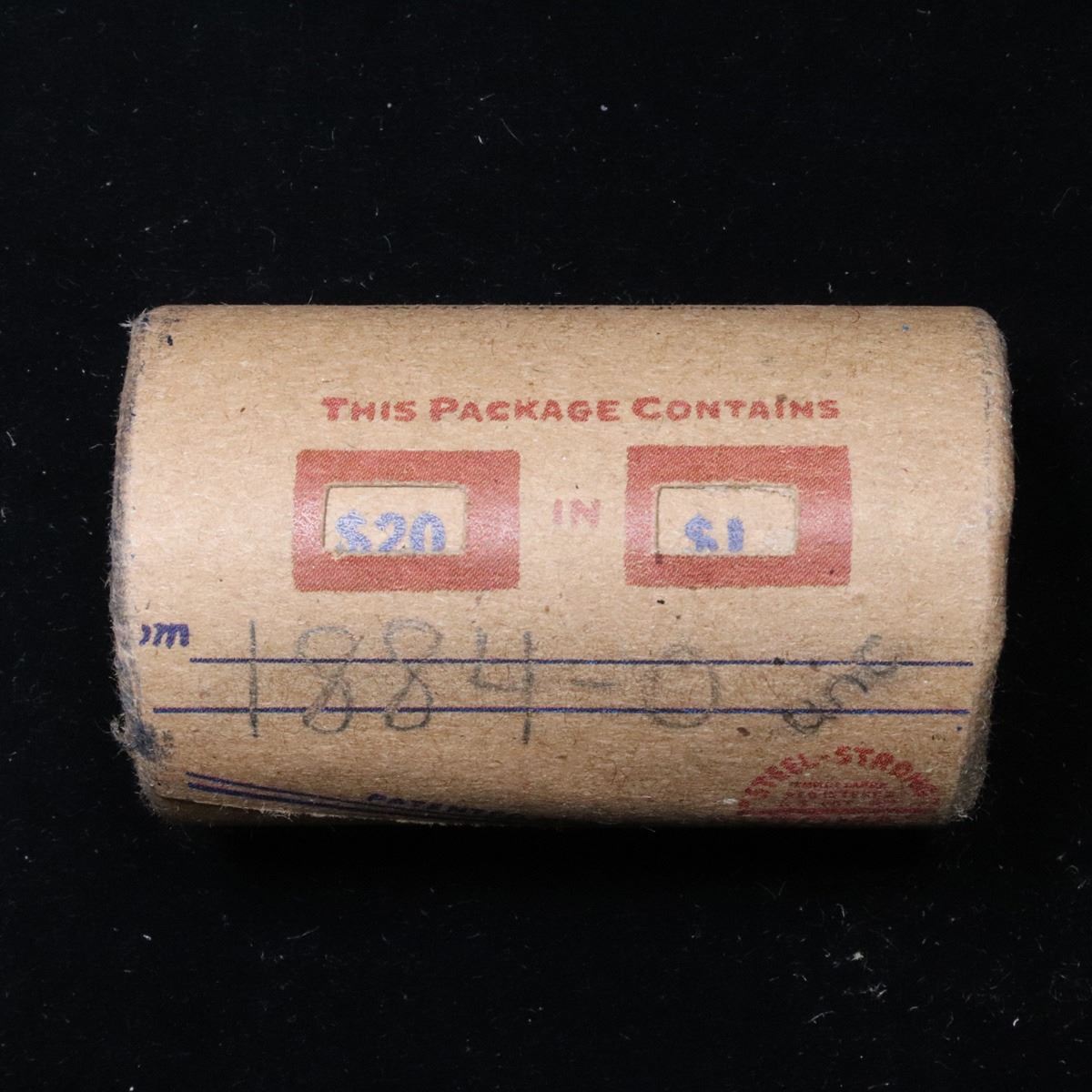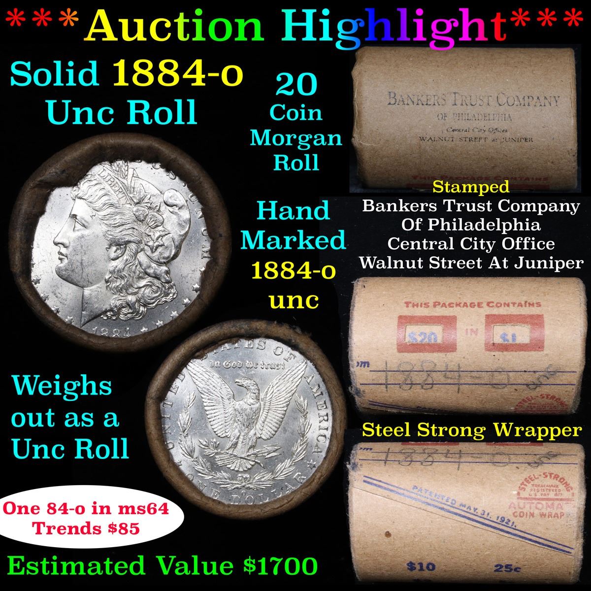 ***Auction Highlight*** Full UNCIRCULATED solid date 1884-o Morgan silver $1 roll, 20 coins . This roll is held in an old Steel strong wrapper, patented 1921, stamped "Bankers Trust Company of PhiladelphiaÓ, Walnut Street at Juniper. This roll contains 20, UNCIRCULATED 1884-o Morgan silver Dollars. The coins may range from Unc to Gem++ with the average being ms64. This is a PQ original bank roll hand marked 1884-o Unc. We have weighed the roll and can assure you that it weighs perfectly at 534.60 grams and is an UNCIRCULATED roll and that all 20 coins are 1884-o. We recently Acquired a large Estate Hoard of solid date Rolls. Trends lists ms64 at $85.