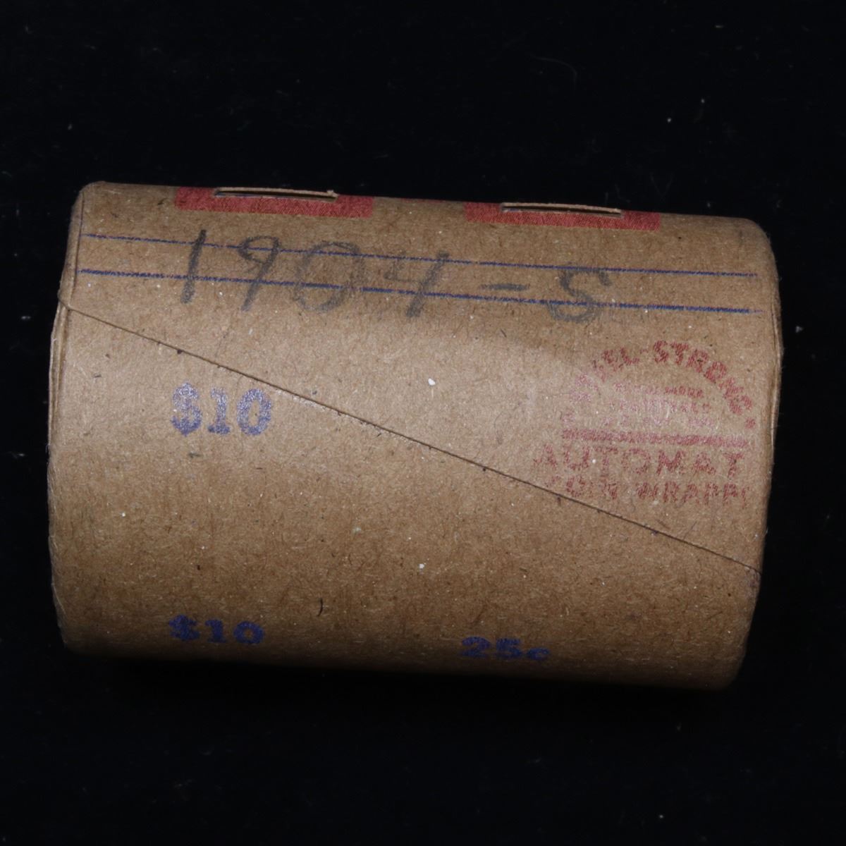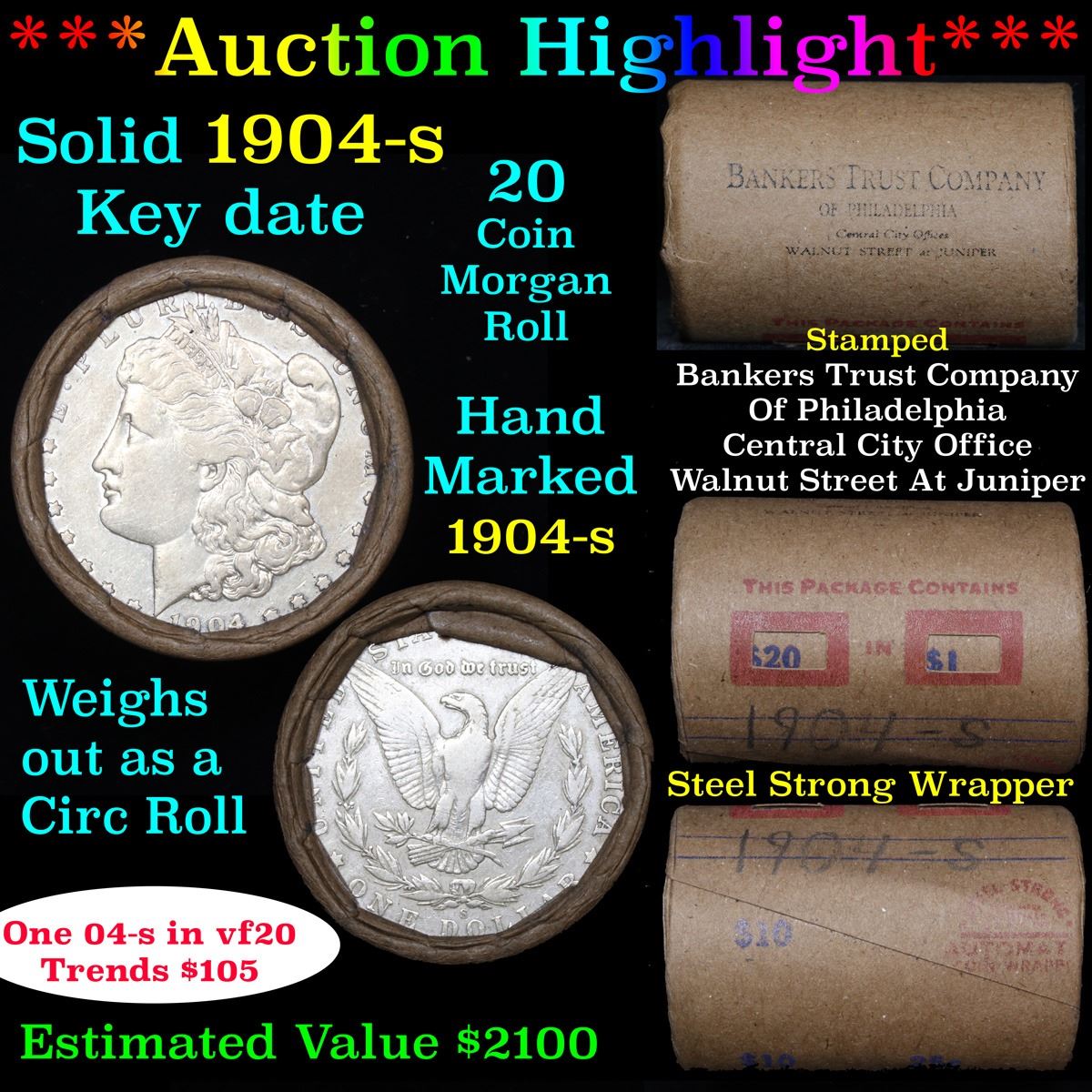 ***Auction Highlight*** Full solid Better date 1904-s Morgan silver dollar roll, 20 coins. This roll is held in an old Steel strong wrapper, patented 1921, stamped "Bankers Trust Company of Philadelphia, Walnut Street at Juniper. This roll contains 20, 1904-s Morgan silver Dollars. The coins may range from circulated to uncirculated. Any condition is possible. We have weighed the roll and can assure you that it is 20 Silver Dollars, that all 20 are 1904-s and that it is not an uncirculated roll as the weight comes in slightly under the 534.60 grams that a fully uncirculated roll would weigh. We recently Acquired a large Estate Hoard of solid date Rolls. Trends lists au50 at $615, xf40 at $260, vf20 at $105, f12 at $66, vg8 at $51, g4 at $40.