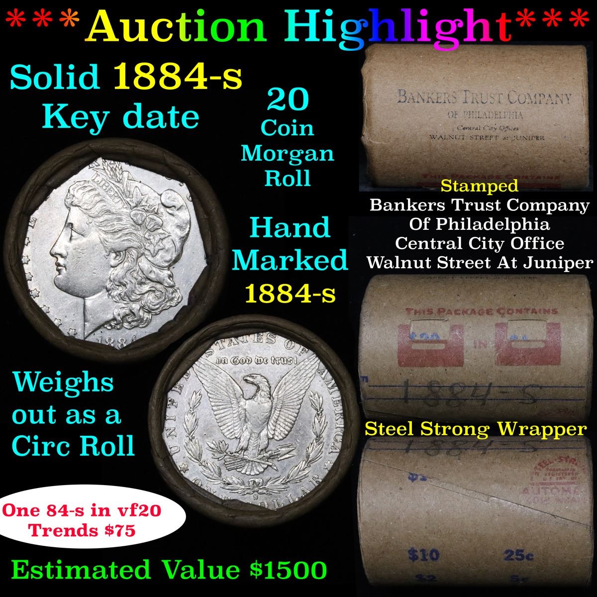 ***Auction Highlight*** Full solid Key date 1884-s Morgan silver dollar roll, 20 coins (fc)