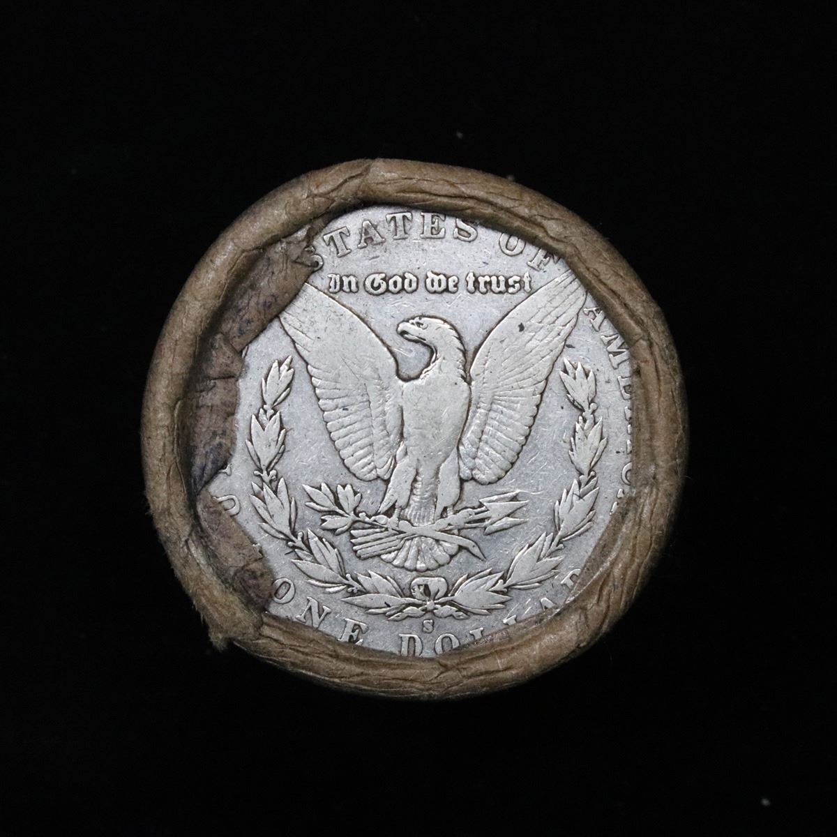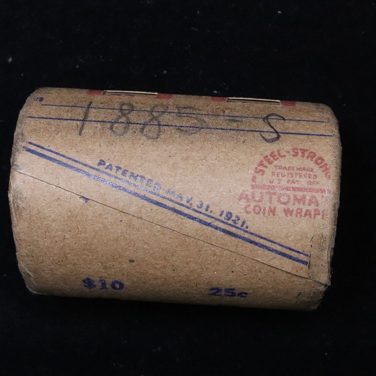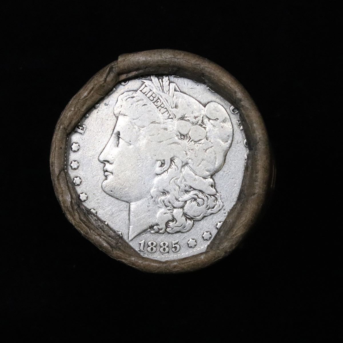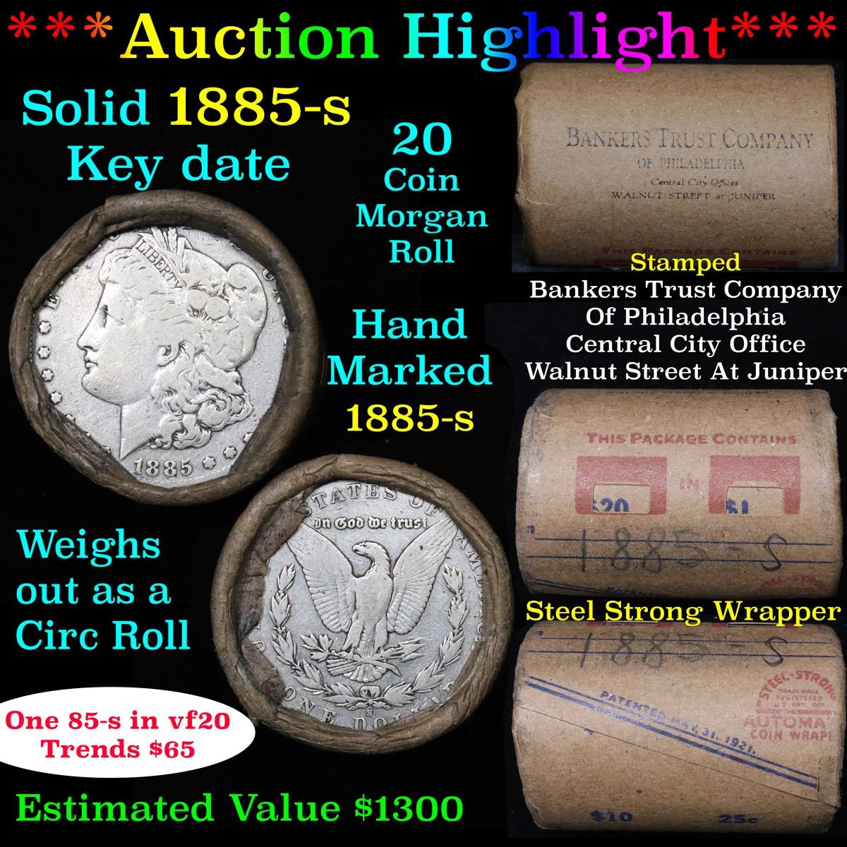 ***Auction Highlight*** Full solid Key date 1885-s Morgan silver dollar roll, 20 coins . .. This roll is held in an old Steel strong wrapper, patented 1921, stamped "Bankers Trust Company of Philadelphia, Walnut Street at Juniper. This roll contains 20, 1885-s Morgan silver Dollars. The coins may range from circulated to uncirculated. Any condition is possible. We have weighed the roll and can assure you that it is 20 Silver Dollars, that all 20 are 1885-s and that it is not an uncirculated roll as the weight comes in slightly under the 534.60 grams that a fully uncirculated roll would weigh. We recently Acquired a large Estate Hoard of solid date Rolls. Trends lists au50 at $110, xf40 at $80, vf20 at $65, f12 at $45, vg8 at $40, g4 at $35.