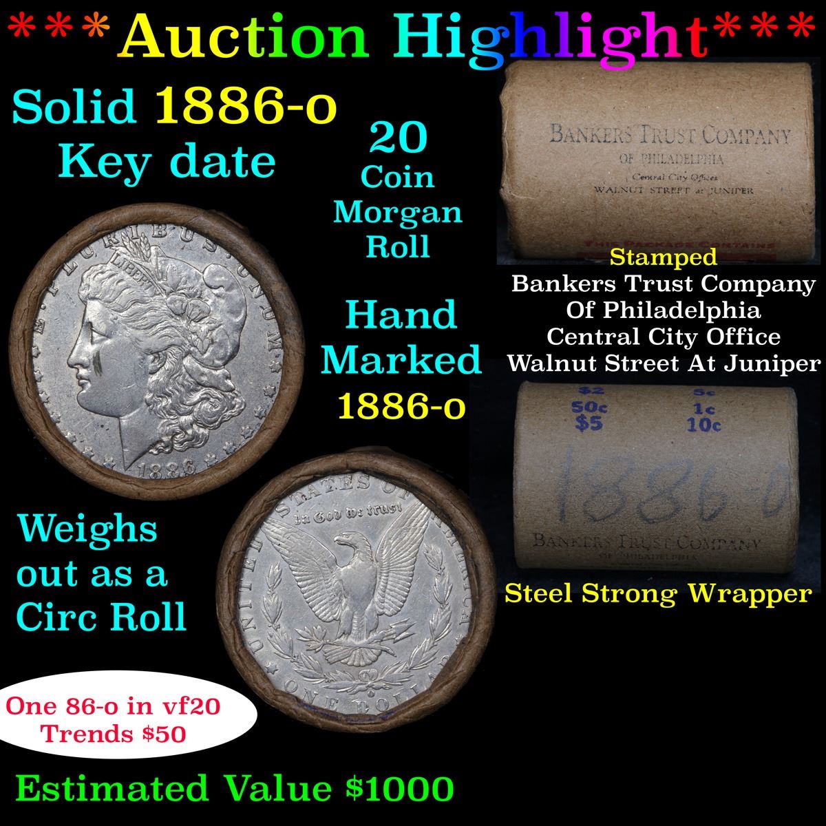 ***Auction Highlight*** Full solid Key date 1886-o Morgan silver dollar roll, 20 coins . .. This roll is held in an old Steel strong wrapper, patented 1921, stamped "Bankers Trust Company of Philadelphia, Walnut Street at Juniper. This roll contains 20, 1886-o Morgan silver Dollars. The coins may range from circulated to uncirculated. Any condition is possible. We have weighed the roll and can assure you that it is 20 Silver Dollars, that all 20 are 1886-o and that it is not an uncirculated roll as the weight comes in slightly under the 534.60 grams that a fully uncirculated roll would weigh. We recently Acquired a large Estate Hoard of solid date Rolls. Trends lists au50 at $85, xf40 at $55, vf20 at $50, f12 at $40, vg8 at $38, g4 at $35.