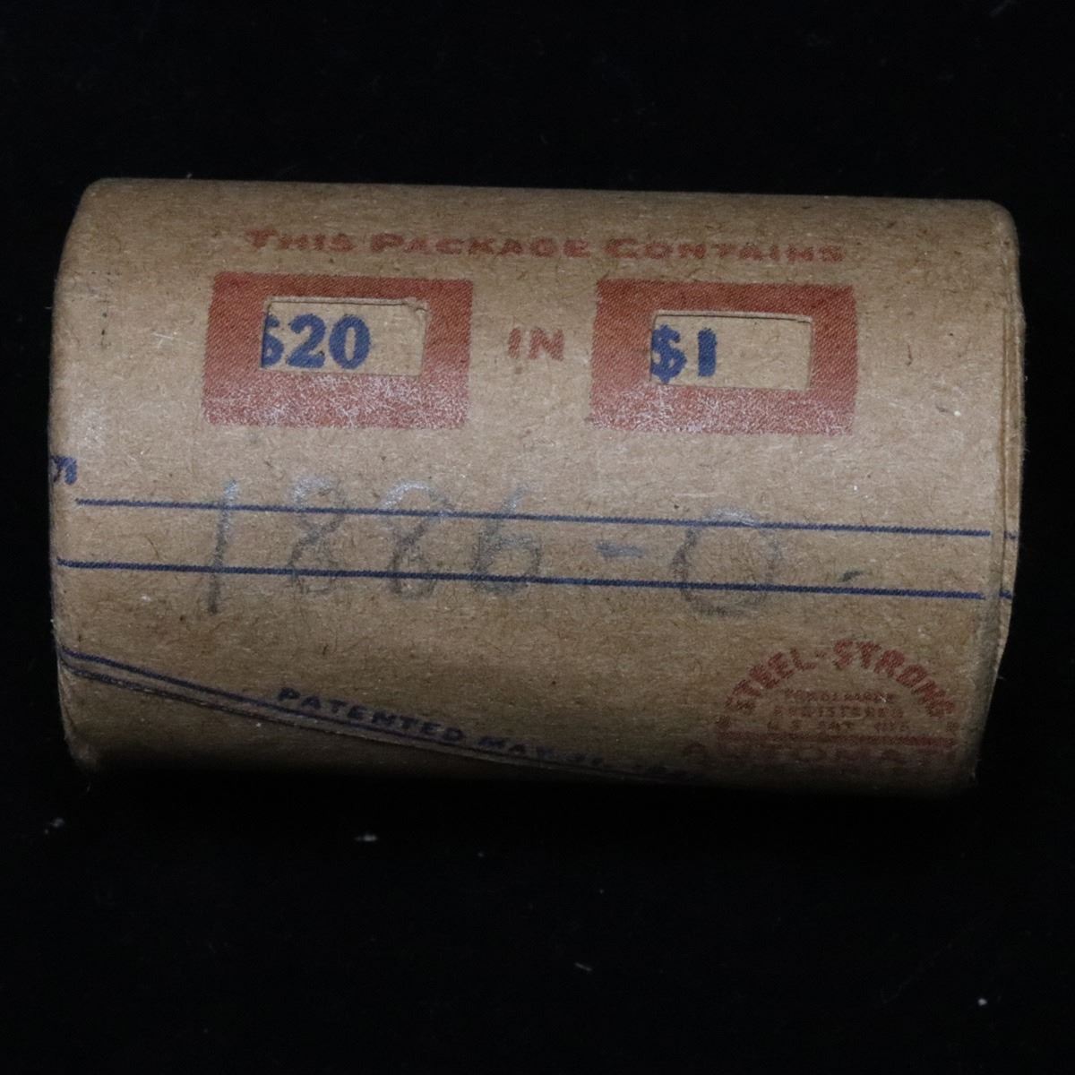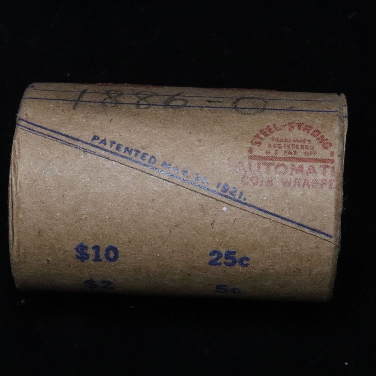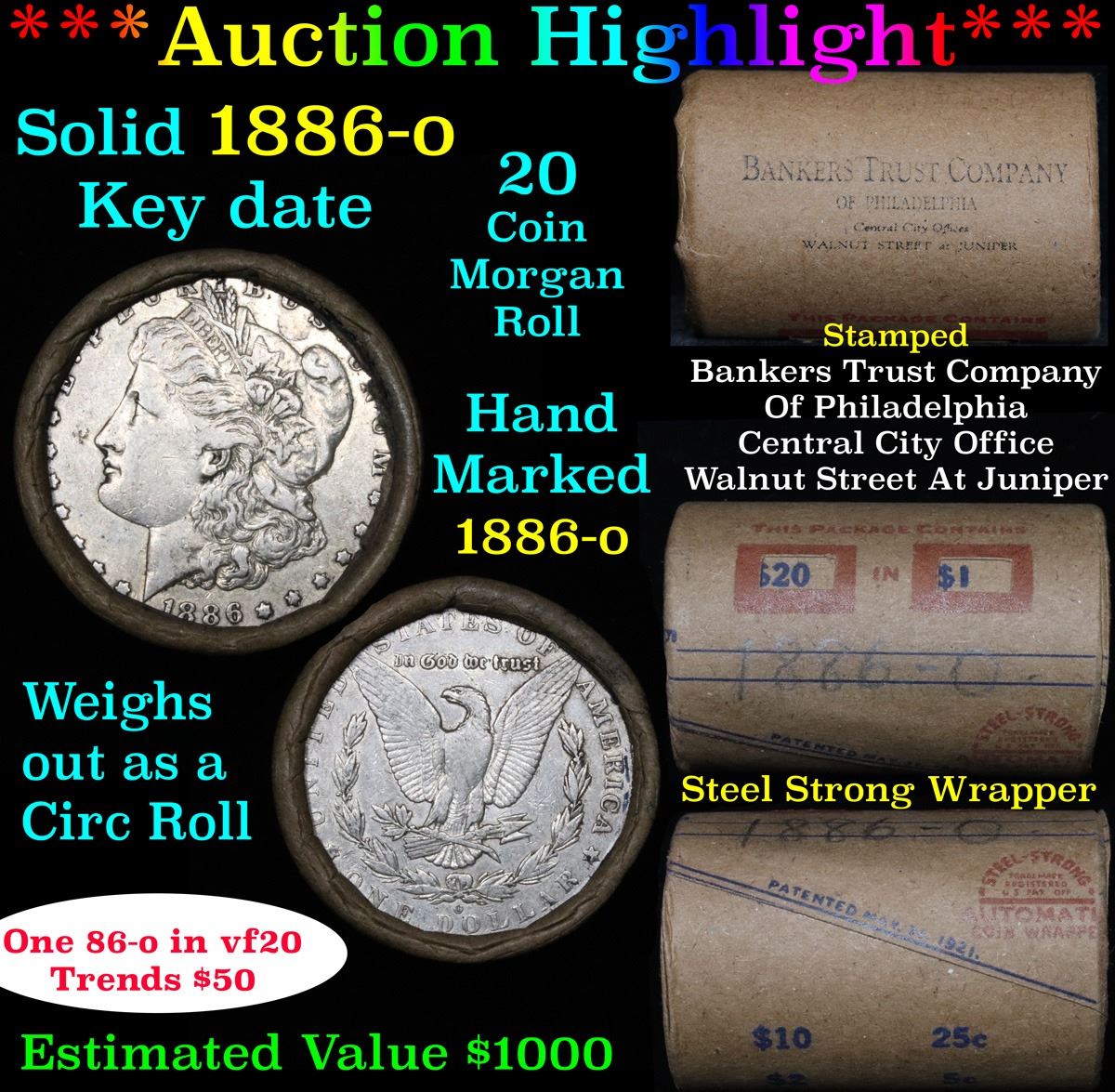 ***Auction Highlight*** Full solid Key date 1886-o Morgan silver dollar roll, 20 coins . .. This roll is held in an old Steel strong wrapper, patented 1921, stamped "Bankers Trust Company of Philadelphia, Walnut Street at Juniper. This roll contains 20, 1886-o Morgan silver Dollars. The coins may range from circulated to uncirculated. Any condition is possible. We have weighed the roll and can assure you that it is 20 Silver Dollars, that all 20 are 1886-o and that it is not an uncirculated roll as the weight comes in slightly under the 534.60 grams that a fully uncirculated roll would weigh. We recently Acquired a large Estate Hoard of solid date Rolls. Trends lists au50 at $85, xf40 at $55, vf20 at $50, f12 at $40, vg8 at $38, g4 at $35.