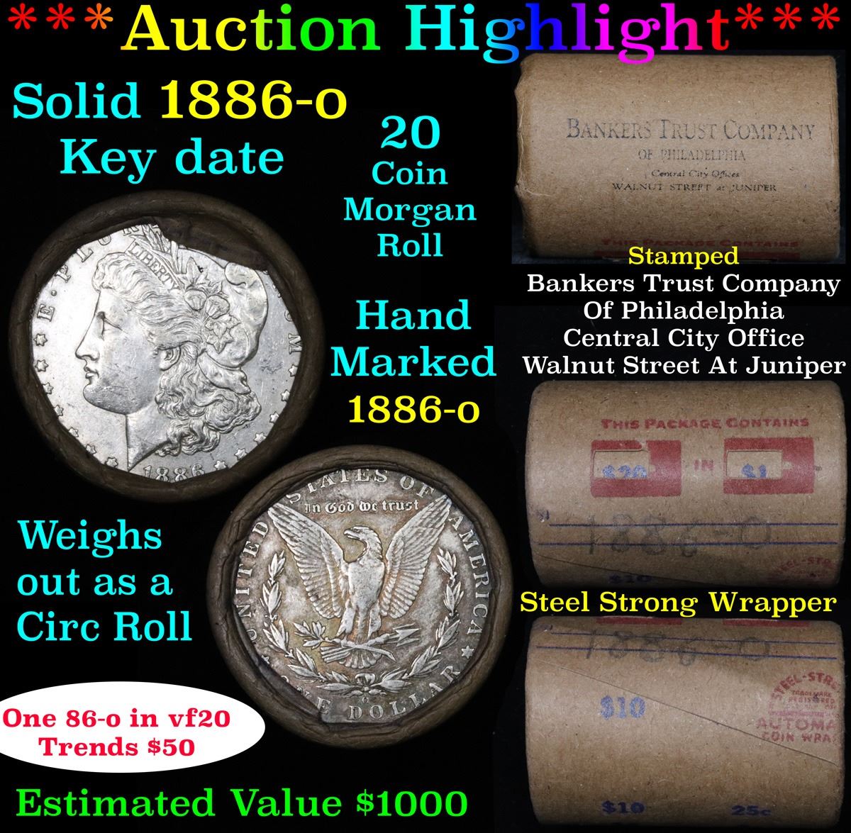 ***Auction Highlight*** Full solid Key date 1886-o Morgan silver dollar roll, 20 coins.        This roll is held in an old Steel strong wrapper, patented 1921, stamped "Bankers Trust Company of Philadelphia, Walnut Street at Juniper. This roll contains 20, 1886-o Morgan silver Dollars. The coins may range from circulated to uncirculated. Any condition is possible. We have weighed the roll and can assure you that it is 20 Silver Dollars, that all 20 are 1886-o and that it is not an uncirculated roll as the weight comes in slightly under the 534.60 grams that a fully uncirculated roll would weigh.  We recently Acquired a large Estate Hoard of solid date Rolls.  Trends lists au50 at $85, xf40 at $55, vf20 at $50, f12 at $40, vg8 at $38, g4 at $35.