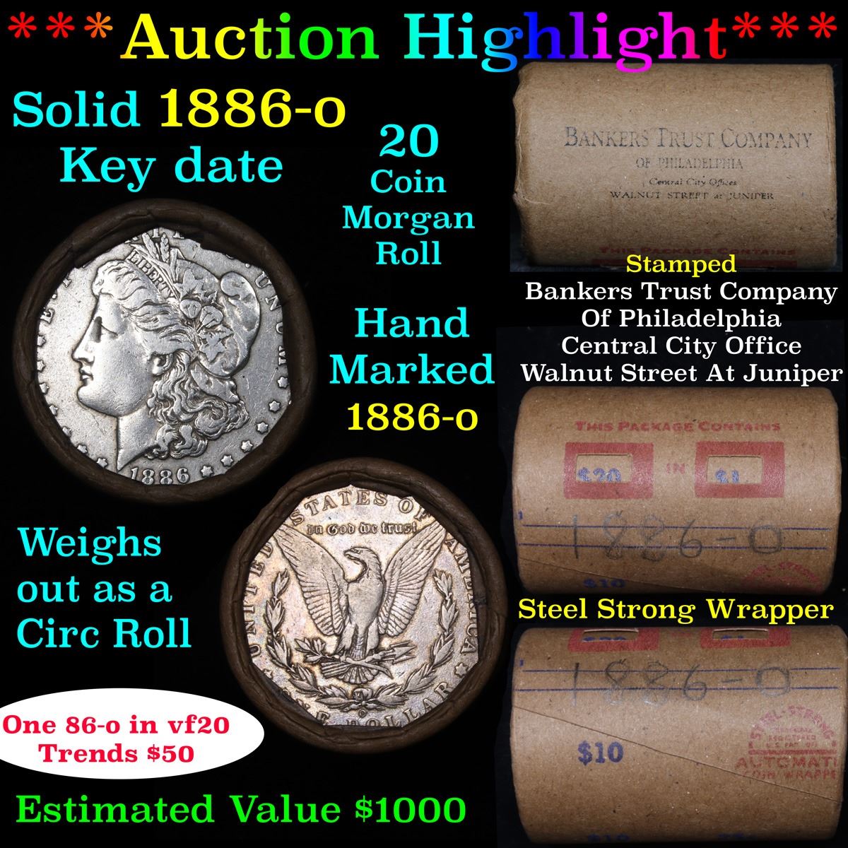 ***Auction Highlight*** Full solid Key date 1886-o Morgan silver dollar roll, 20 coins. This roll is held in an old Steel strong wrapper, patented 1921, stamped "Bankers Trust Company of Philadelphia, Walnut Street at Juniper. This roll contains 20, 1886-o Morgan silver Dollars. The coins may range from circulated to uncirculated. Any condition is possible. We have weighed the roll and can assure you that it is 20 Silver Dollars, that all 20 are 1886-o and that it is not an uncirculated roll as the weight comes in slightly under the 534.60 grams that a fully uncirculated roll would weigh. We recently Acquired a large Estate Hoard of solid date Rolls. Trends lists au50 at $85, xf40 at $55, vf20 at $50, f12 at $40, vg8 at $38, g4 at $35.