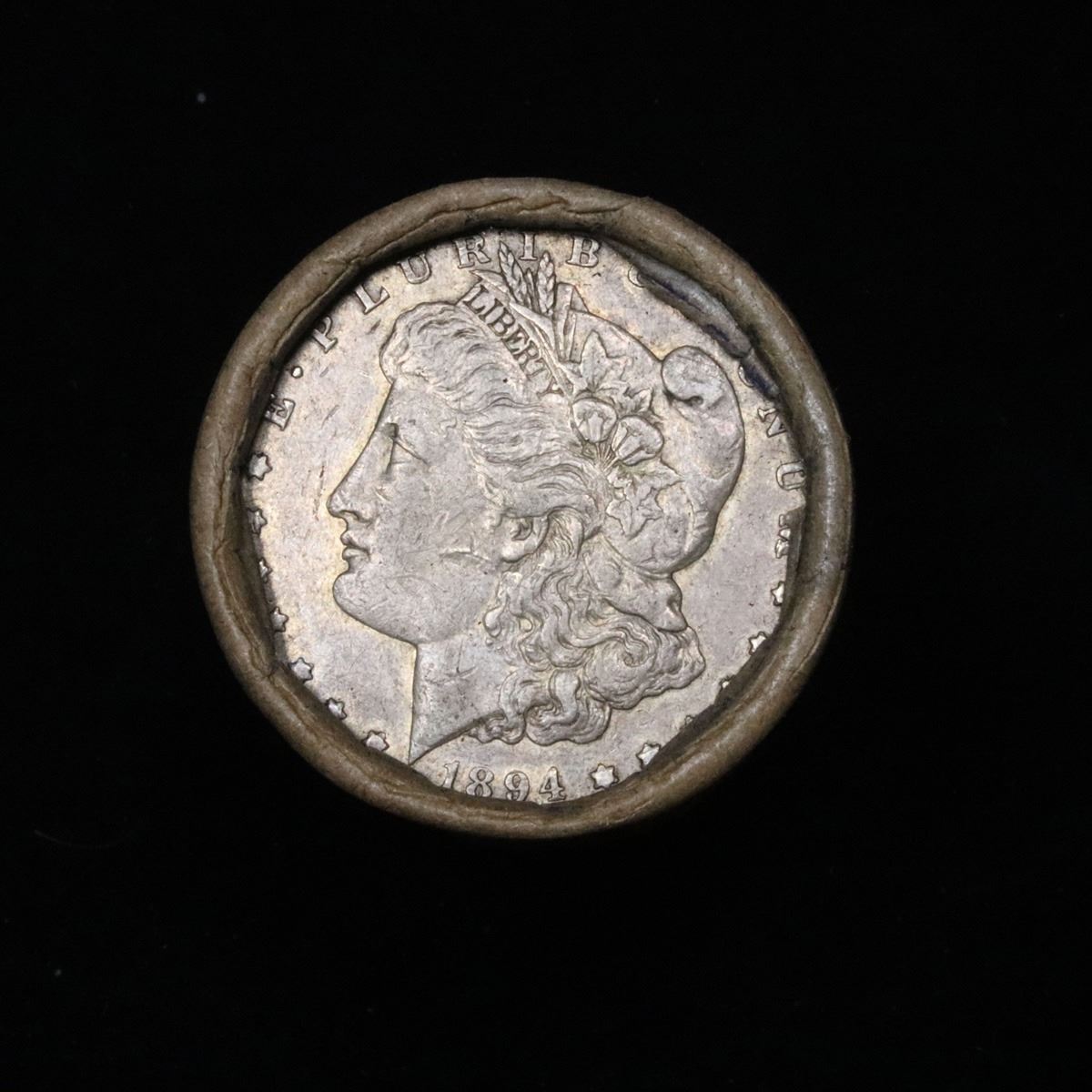 ***Auction Highlight*** Full solid Key date 1894-o Morgan silver dollar roll, 20 coins. This roll is held in an old Steel strong wrapper, patented 1921, stamped "Bankers Trust Company of Philadelphia, Walnut Street at Juniper. This roll contains 20, 1894-o Morgan silver Dollars. The coins may range from circulated to uncirculated. Any condition is possible. We have weighed the roll and can assure you that it is 20 Silver Dollars, that all 20 are 1894-o and that it is not an uncirculated roll as the weight comes in slightly under the 534.60 grams that a fully uncirculated roll would weigh. We recently Acquired a large Estate Hoard of solid date Rolls. Trends lists au50 at $185, xf40 at $135, vf20 at $90, f12 at $60, vg8 at $55, g4 at $45.