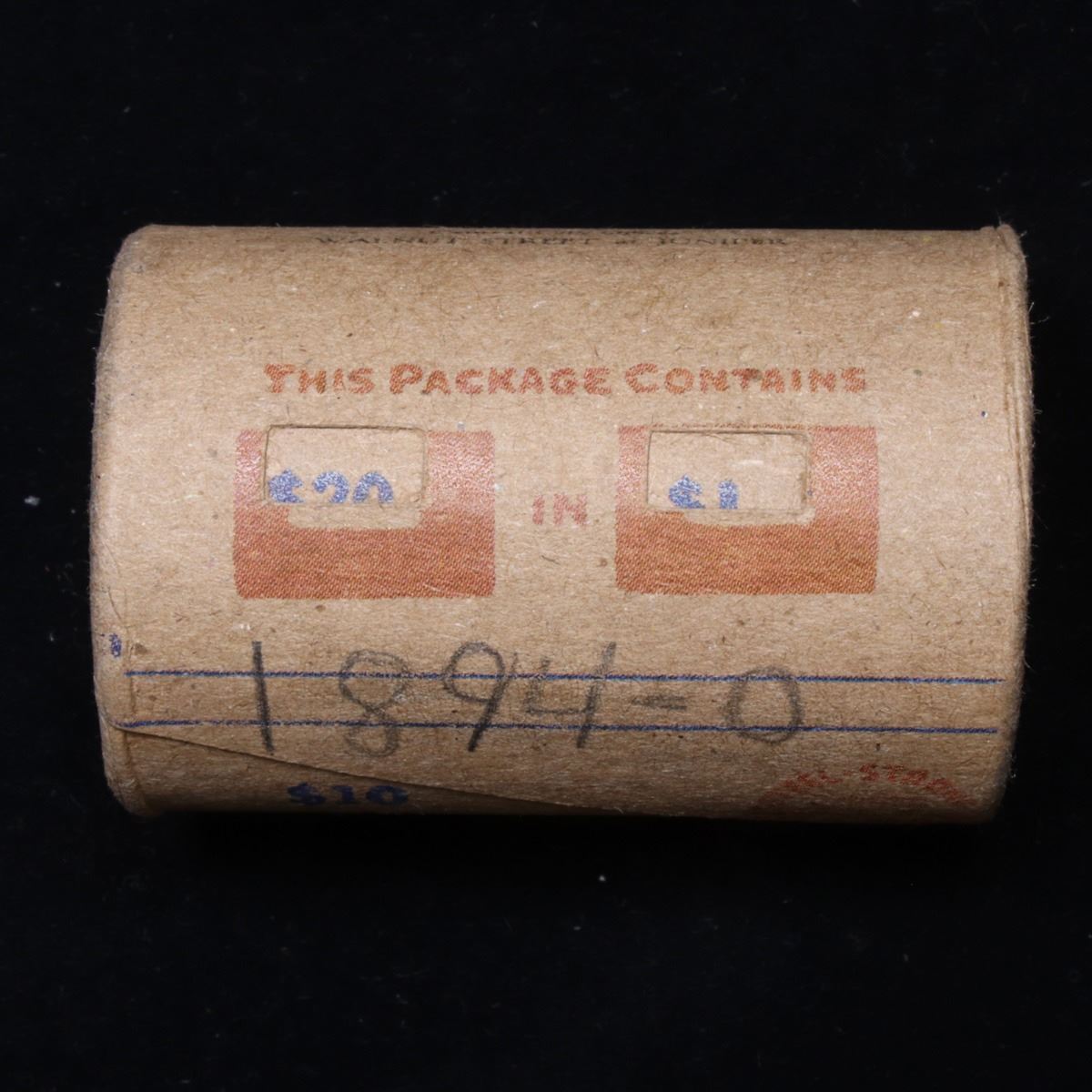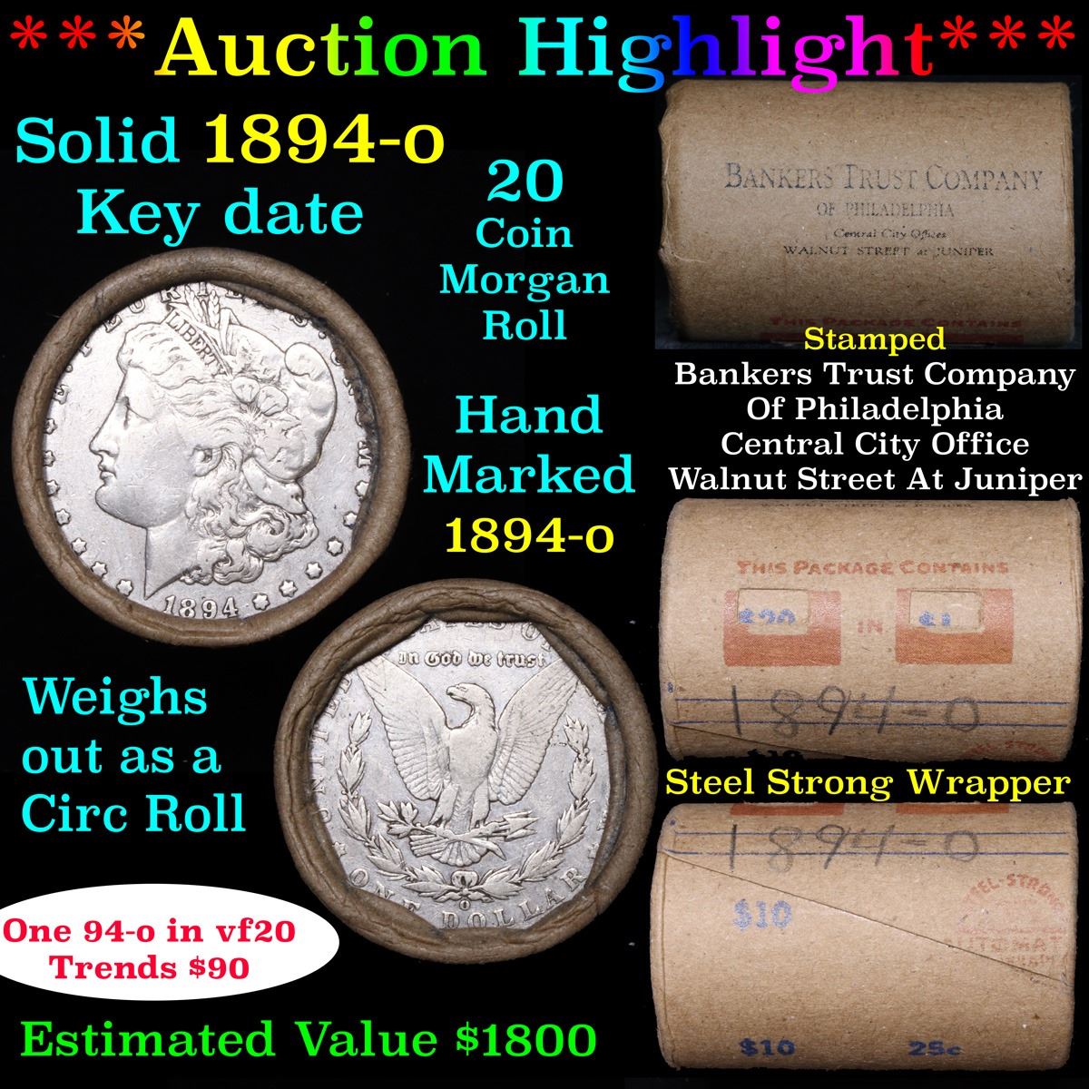 ***Auction Highlight*** Full solid Key date 1894-o Morgan silver dollar roll, 20 coins. This roll is held in an old Steel strong wrapper, patented 1921, stamped "Bankers Trust Company of Philadelphia, Walnut Street at Juniper. This roll contains 20, 1894-o Morgan silver Dollars. The coins may range from circulated to uncirculated. Any condition is possible. We have weighed the roll and can assure you that it is 20 Silver Dollars, that all 20 are 1894-o and that it is not an uncirculated roll as the weight comes in slightly under the 534.60 grams that a fully uncirculated roll would weigh. We recently Acquired a large Estate Hoard of solid date Rolls. Trends lists au50 at $185, xf40 at $135, vf20 at $90, f12 at $60, vg8 at $55, g4 at $45.