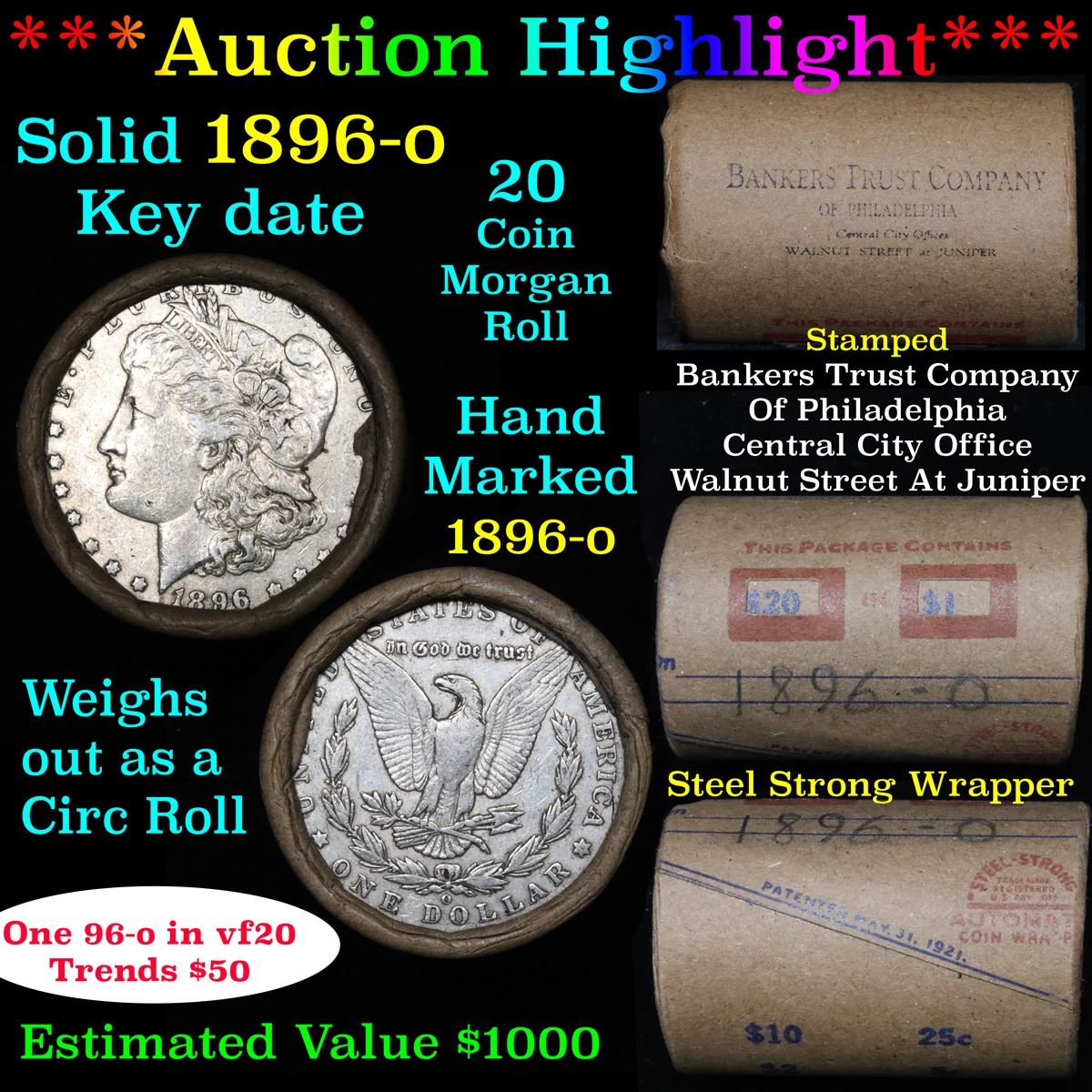 ***Auction Highlight*** Full solid Key date 1896-o Morgan silver dollar roll, 20 coins . .. This roll is held in an old Steel strong wrapper, patented 1921, stamped "Bankers Trust Company of Philadelphia, Walnut Street at Juniper. This roll contains 20, 1896-o Morgan silver Dollars. The coins may range from circulated to uncirculated. Any condition is possible. We have weighed the roll and can assure you that it is 20 Silver Dollars, that all 20 are 1896-o and that it is not an uncirculated roll as the weight comes in slightly under the 534.60 grams that a fully uncirculated roll would weigh. We recently Acquired a large Estate Hoard of solid date Rolls. Trends lists au50 at $120, xf40 at $75, vf20 at $50, f12 at $48, vg8 at $45, g4 at $42.