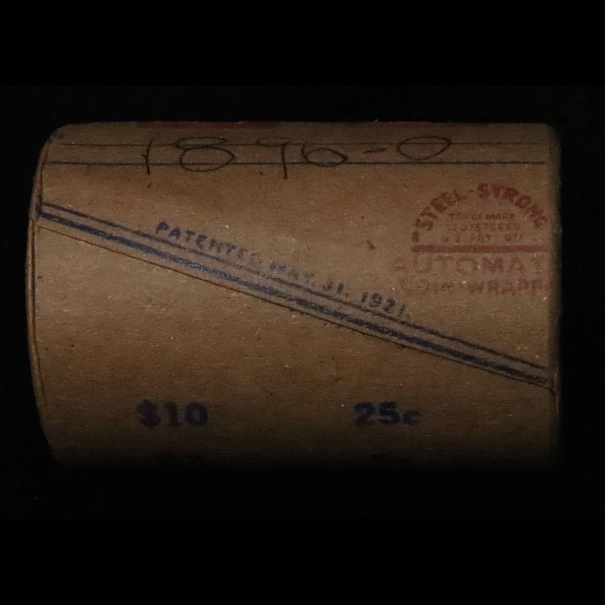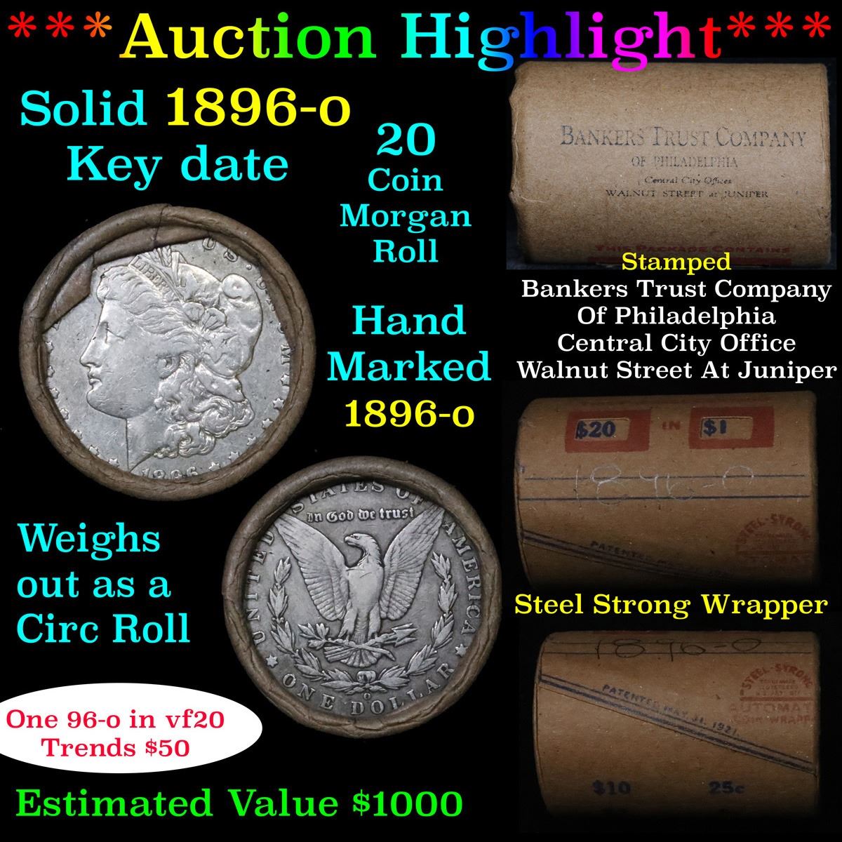 ***Auction Highlight*** Full solid Key date 1896-o Morgan silver dollar roll, 20 coins. This roll is held in an old Steel strong wrapper, patented 1921, stamped "Bankers Trust Company of Philadelphia, Walnut Street at Juniper. This roll contains 20, 1896-o Morgan silver Dollars. The coins may range from circulated to uncirculated. Any condition is possible. We have weighed the roll and can assure you that it is 20 Silver Dollars, that all 20 are 1896-o and that it is not an uncirculated roll as the weight comes in slightly under the 534.60 grams that a fully uncirculated roll would weigh. We recently Acquired a large Estate Hoard of solid date Rolls. Trends lists au50 at $120, xf40 at $75, vf20 at $50, f12 at $48, vg8 at $45, g4 at $42.
