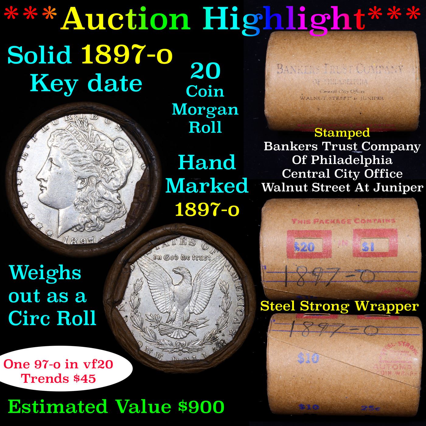 ***Auction Highlight*** Full solid Key date 1897-o Morgan silver dollar roll, 20 coin (fc)
