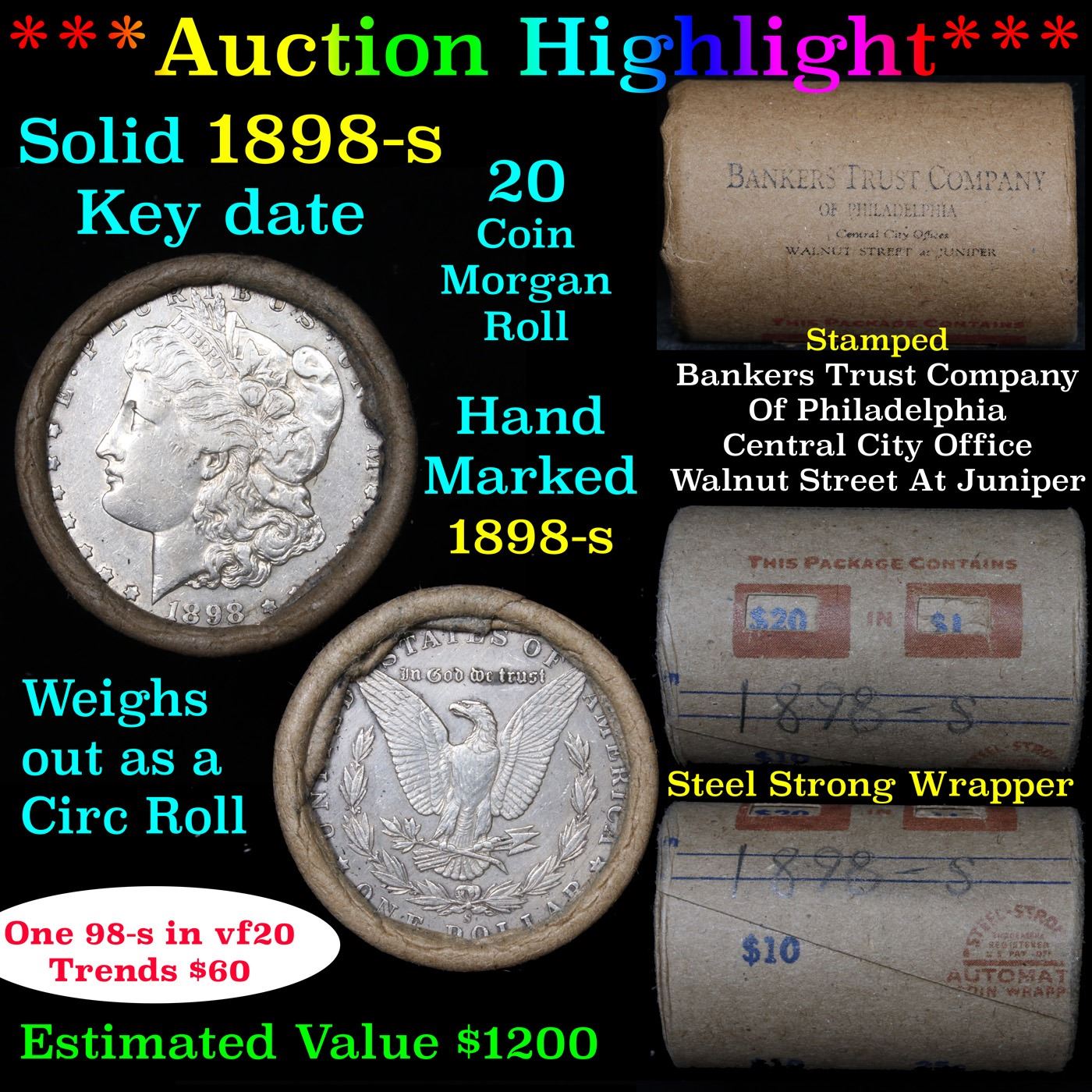 ***Auction Highlight*** Full solid Key date 1898-s Morgan silver dollar roll, 20 coins (fc)