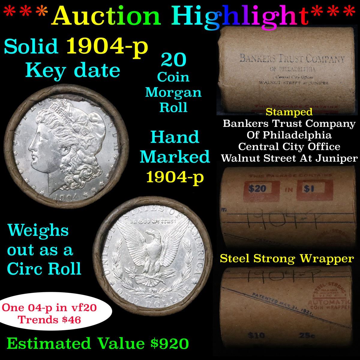 ***Auction Highlight*** Full solid Key date 1904-p Morgan silver dollar roll, 20 coins (fc)