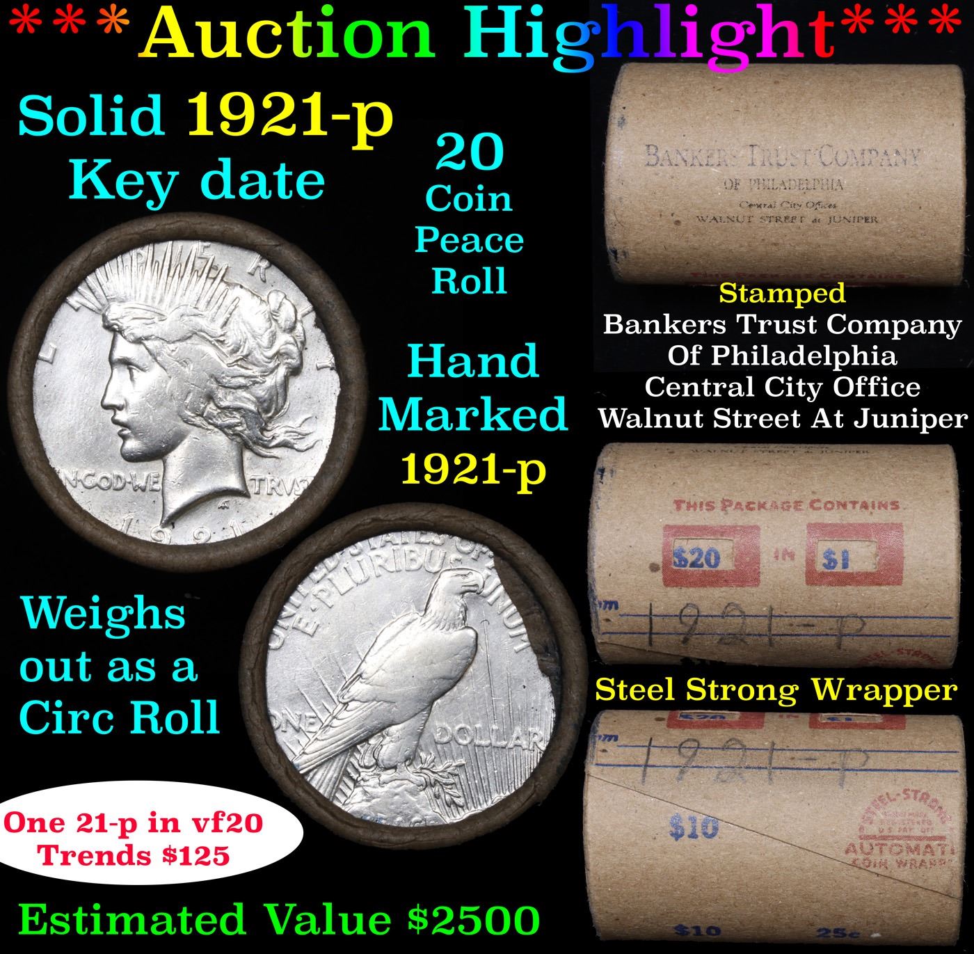 ***Auction Highlight*** Full solid Key date 1921-p Peace silver dollar roll, 20 coins (fc)