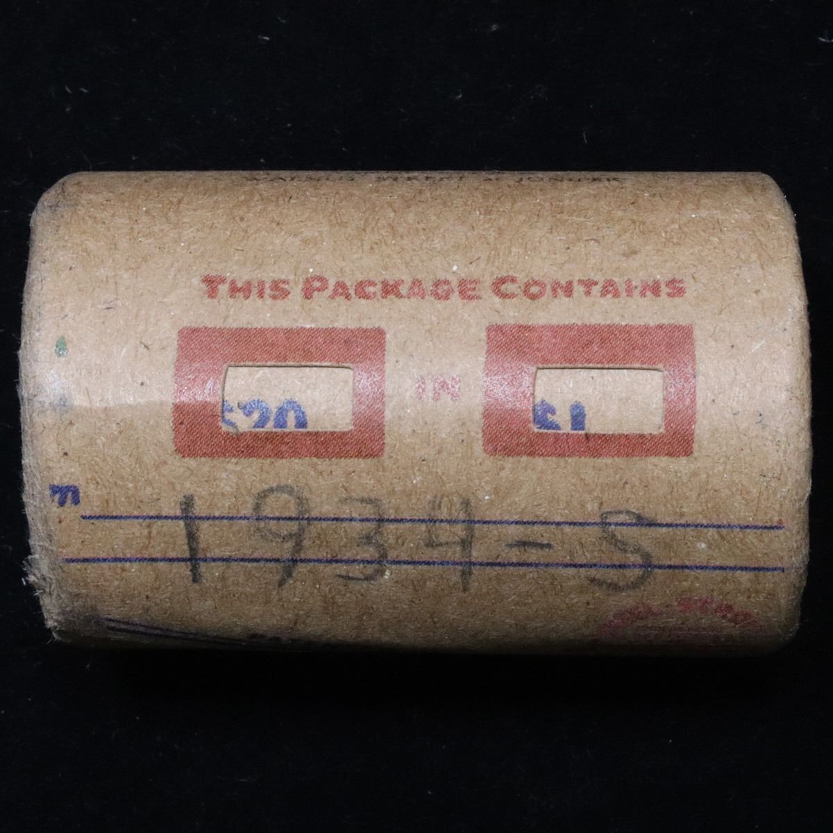 ***Auction Highlight*** Full solid Key date 1934-s Peace silver dollar roll, 20 coins . .. This roll is held in an old Steel strong wrapper, patented 1921, stamped "Bankers Trust Company of Philadelphia, Walnut Street at Juniper. This roll contains 20, 1934-s Peace silver Dollars. The coins may range from circulated to uncirculated. Any condition is possible. We have weighed the roll and can assure you that it is 20 Silver Dollars, that all 20 are 1934-s and that it is not an uncirculated roll as the weight comes in slightly under the 534.60 grams that a fully uncirculated roll would weigh. We recently Acquired a large Estate Hoard of solid date Rolls. Trends lists au50 at $375, xf40 at $180, vf20 at $100, f12 at $65, vg8 at $50, g4 at 40.