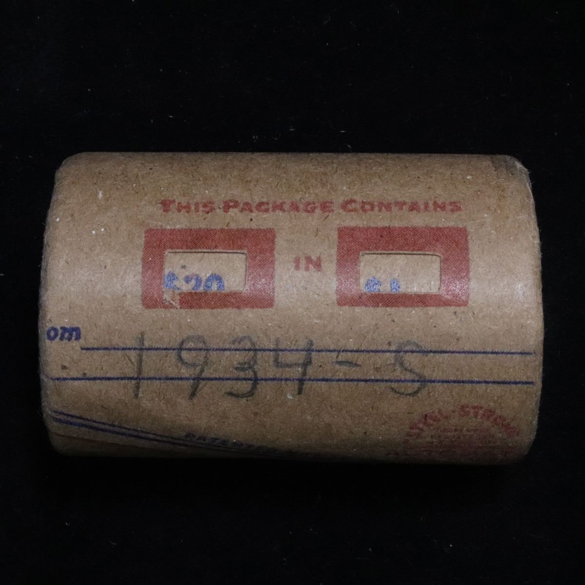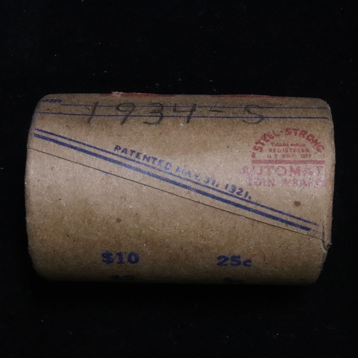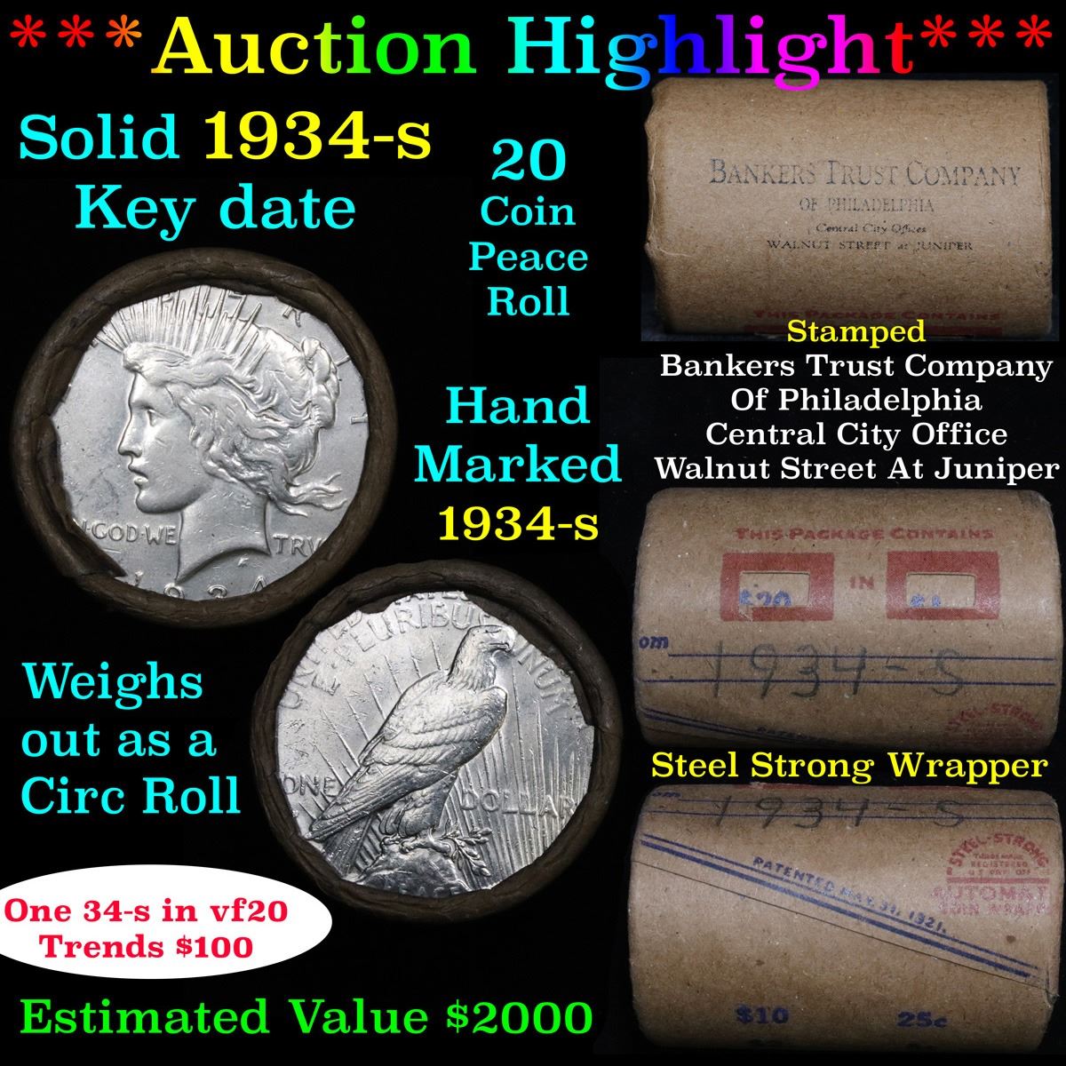 ***Auction Highlight*** Full solid Key date 1934-s Peace silver dollar roll, 20 coins . .. This roll is held in an old Steel strong wrapper, patented 1921, stamped "Bankers Trust Company of Philadelphia, Walnut Street at Juniper. This roll contains 20, 1934-s Peace silver Dollars. The coins may range from circulated to uncirculated. Any condition is possible. We have weighed the roll and can assure you that it is 20 Silver Dollars, that all 20 are 1934-s and that it is not an uncirculated roll as the weight comes in slightly under the 534.60 grams that a fully uncirculated roll would weigh. We recently Acquired a large Estate Hoard of solid date Rolls. Trends lists au50 at $375, xf40 at $180, vf20 at $100, f12 at $65, vg8 at $50, g4 at 40.