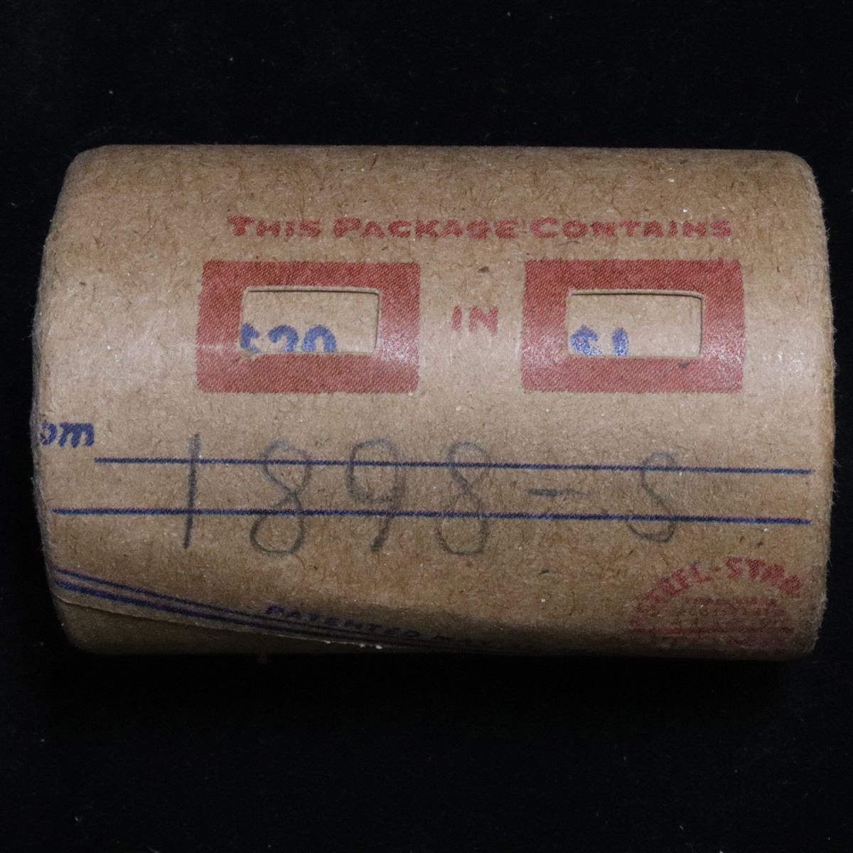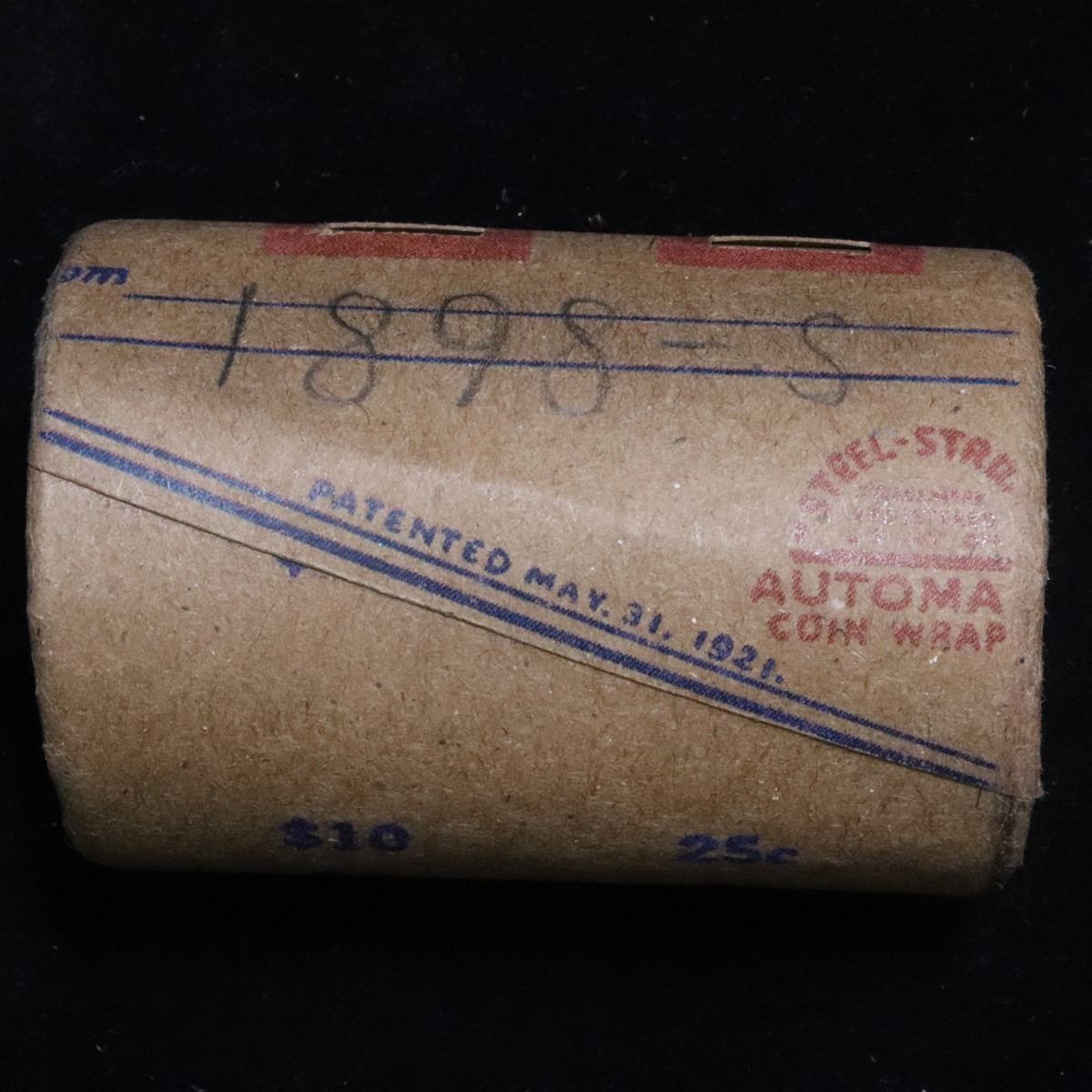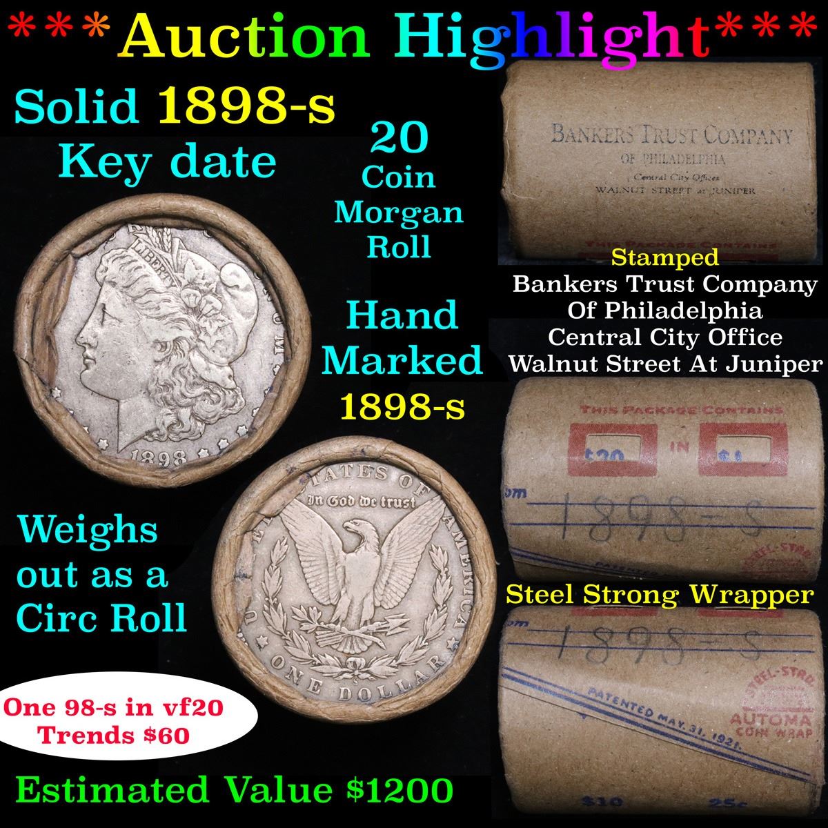 ***Auction Highlight*** Full solid Much Better date 1898-s Morgan silver dollar roll, 20 coins . .. This roll is held in an old Steel strong wrapper, patented 1921, stamped "Bankers Trust Company of Philadelphia, Walnut Street at Juniper. This roll contains 20, 1898-s Morgan silver Dollars. The coins may range from circulated to uncirculated. Any condition is possible. We have weighed the roll and can assure you that it is 20 Silver Dollars, that all 20 are 1898-s and that it is not an uncirculated roll as the weight comes in slightly under the 534.60 grams that a fully uncirculated roll would weigh. We recently Acquired a large Estate Hoard of solid date Rolls. Trends lists au50 at $95, xf40 at $75, vf20 at $60, f12 at $52, vg8 at $50, g4 at $45.
