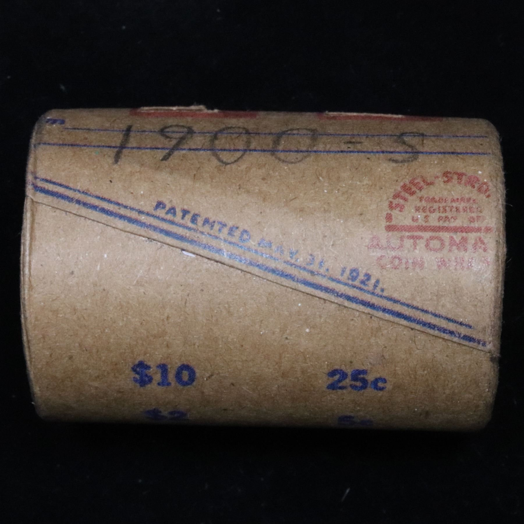 ***Auction Highlight*** Full solid Much Better date 1900-s Morgan silver dollar roll, 20 coins . .. This roll is held in an old Steel strong wrapper, patented 1921, stamped "Bankers Trust Company of Philadelphia, Walnut Street at Juniper. This roll contains 20, 1900-s Morgan silver Dollars. The coins may range from circulated to uncirculated. Any condition is possible. We have weighed the roll and can assure you that it is 20 Silver Dollars, that all 20 are 1900-s and that it is not an uncirculated roll as the weight comes in slightly under the 534.60 grams that a fully uncirculated roll would weigh. We recently Acquired a large Estate Hoard of solid date Rolls. Trends lists au50 at $90, xf40 at $70, vf20 at $50, f12 at $43, vg8 at $41, g4 at $33.