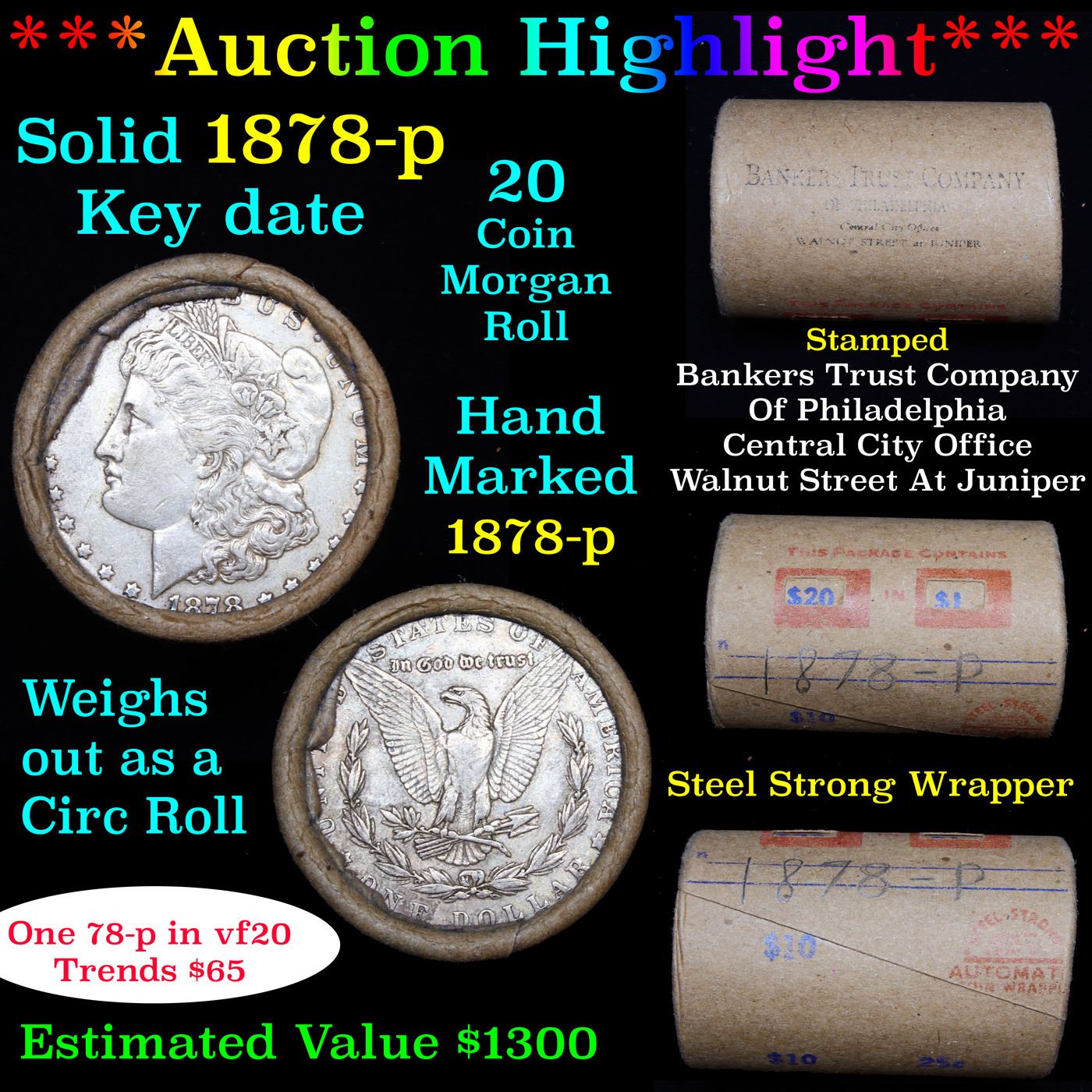 ***Auction Highlight*** Full solid date 1878-p Morgan silver dollar roll, 20 coins. This roll is held in an old Steel strong wrapper, patented 1921, stamped "Bankers Trust Company of Philadelphia, Walnut Street at Juniper. This roll contains 20, 1878-p Morgan silver Dollars. The coins may range from circulated to uncirculated. Any condition is possible. We have weighed the roll and can assure you that it is 20 Silver Dollars, that all 20 are 1878-p and that it is not an uncirculated roll as the weight comes in slightly under the 534.60 grams that a fully uncirculated roll would weigh. We recently Acquired a large Estate Hoard of solid date Rolls Trends au50 $75 xf40 $70, vf20 $65, f15 $45, vg $40, g $35. Estimated Value $1300