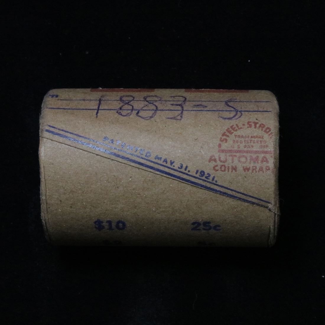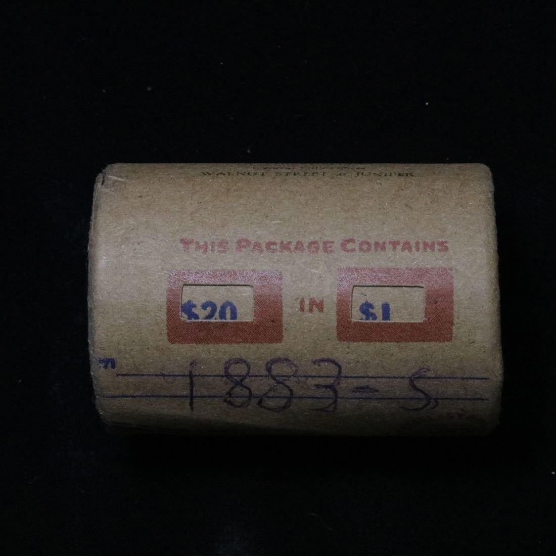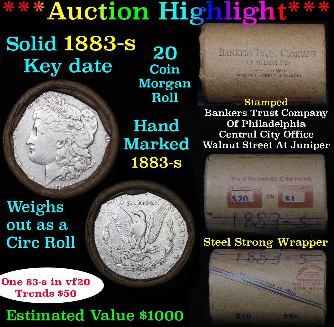 ***Auction Highlight*** Full solid date 1883-s Morgan silver dollar roll, 20 coins . This roll is held in an old Steel strong wrapper, patented 1921, stamped "Bankers Trust Company of PhiladelphiaÓ, Walnut Street at Juniper. This roll contains 20, 1883-s Morgan silver Dollars. The coins may range from circulated to uncirculated. Any condition is possible. We have weighed the roll and can assure you that it is 20 Silver Dollars, that all 20 are 1883-s and that it is not an uncirculated roll as the weight comes in slightly under the 534.60 grams that a fully uncirculated roll would weigh. We recently Acquired a large Estate Hoard of solid date Rolls. Trends lists au50 at $115, xf40 at $75, vf20 at $50, f12 at $45, vg8 at $40, g4 at $35.