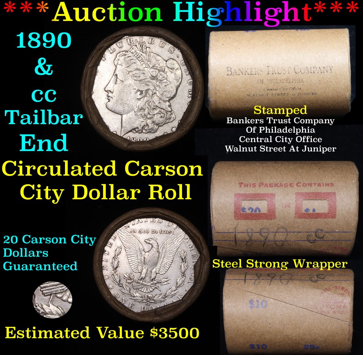 ***Auction Highlight*** Full solid date 1890-cc Morgan silver $1 roll, 20 coins, 'Tailbar' end (fc)