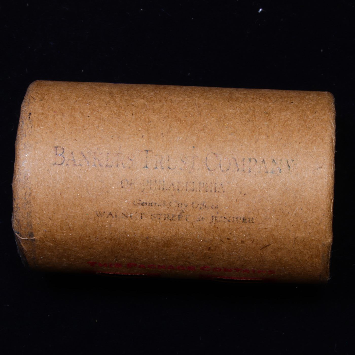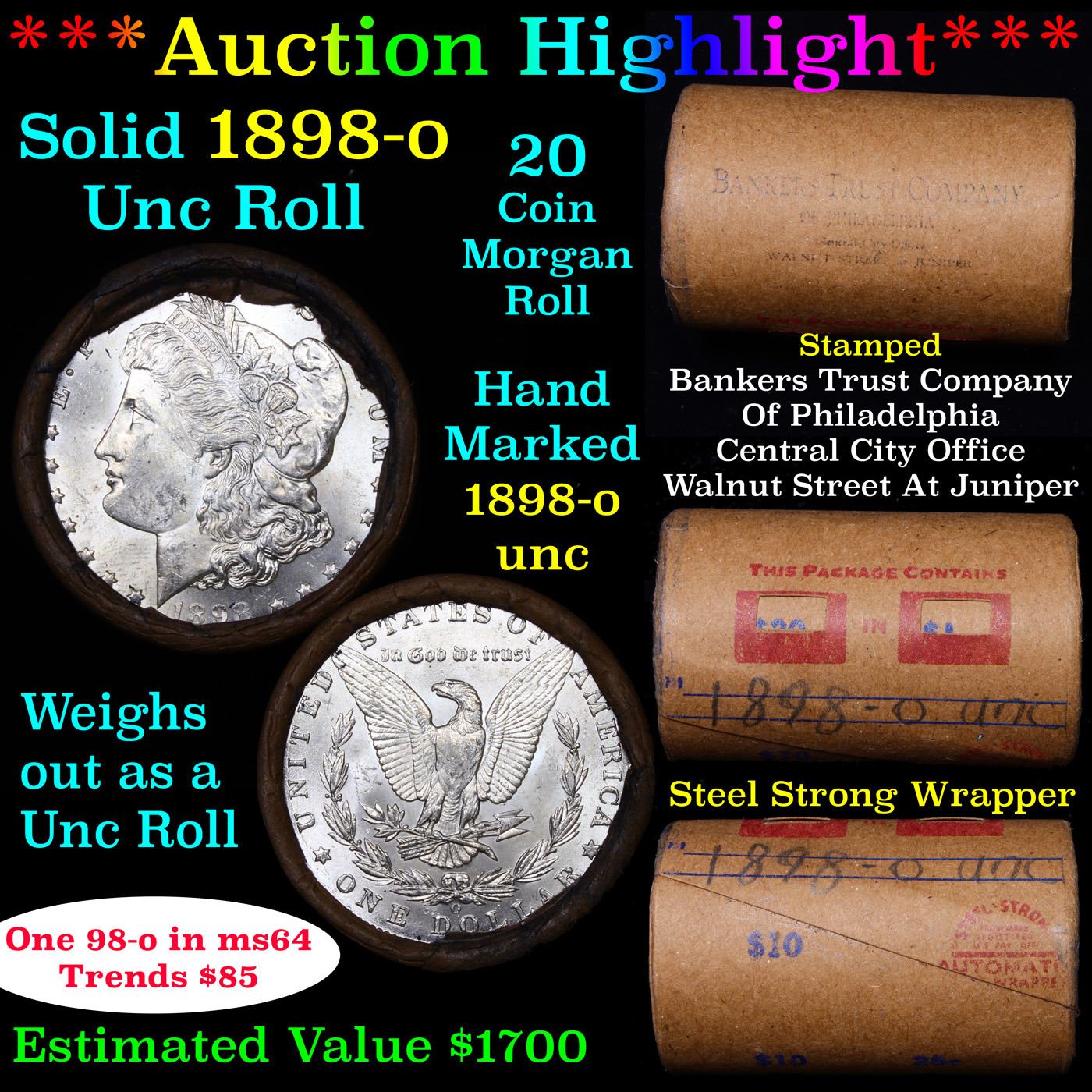 ***Auction Highlight*** Full solid date 1898-o Uncirculated Morgan silver dollar roll, 20 coins. This roll is held in an old Steel strong wrapper, patented 1921, stamped "Bankers Trust Company of Philadelphia, Walnut Street at Juniper. 1898-o Uncirculated Morgan Dollar Roll, Superb Ends. Weighs Perfectly as an Uncirculated Roll. Trends in ms64 is $85 and ms63 is $75. One ms66 is $290 and one ms65 is $140.