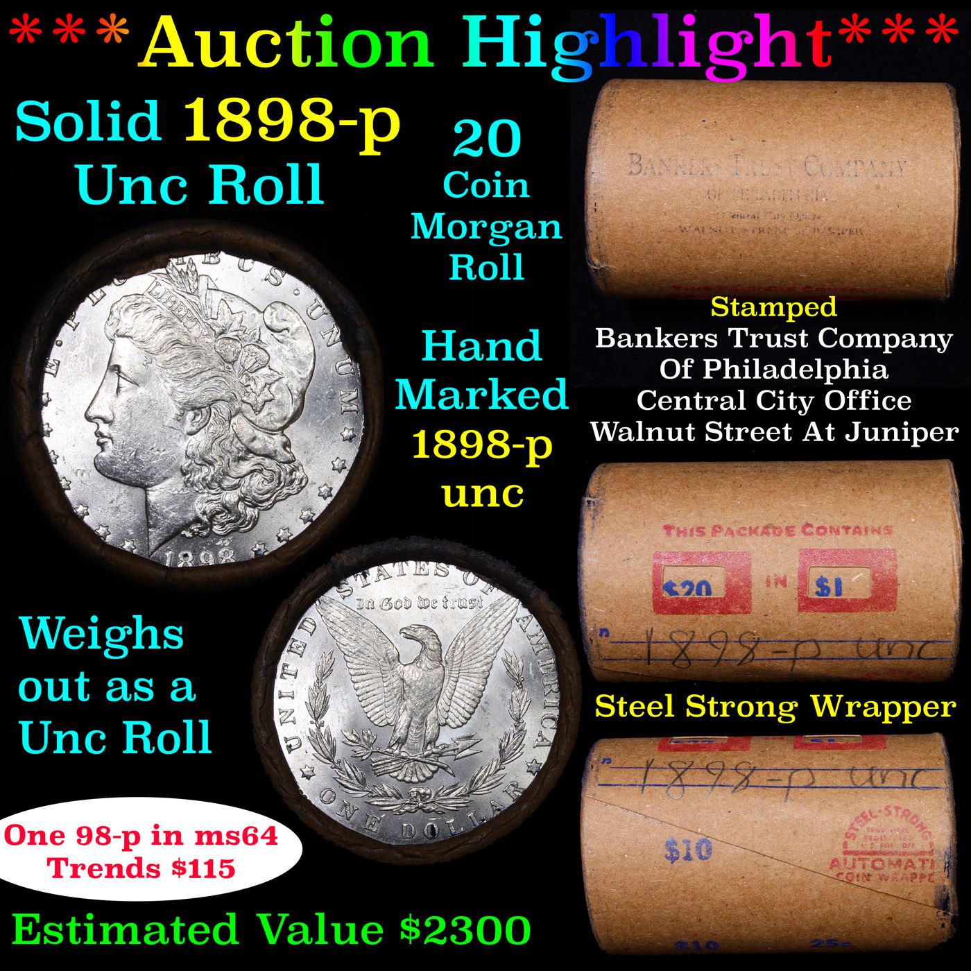 ***Auction Highlight*** Full solid date 1898-p Uncirculated Morgan silver dollar roll, 20 coins. This roll is held in an old Steel strong wrapper, patented 1921, stamped "Bankers Trust Company of Philadelphia, Walnut Street at Juniper. This roll contains 20, UNCIRCULATED 1898-p Morgan silver Dollars. The coins may range from Unc to Gem++ with the average being ms64. This is a PQ original bank roll hand marked 1898-p Unc. We have weighed the roll and can assure you that it weighs perfectly at 534.60 grams and is an UNCIRCULATED roll and that all 20 coins are 1883-o. We recently Acquired a large Estate Hoard of solid date Rolls. Trends lists ms64 at $115.