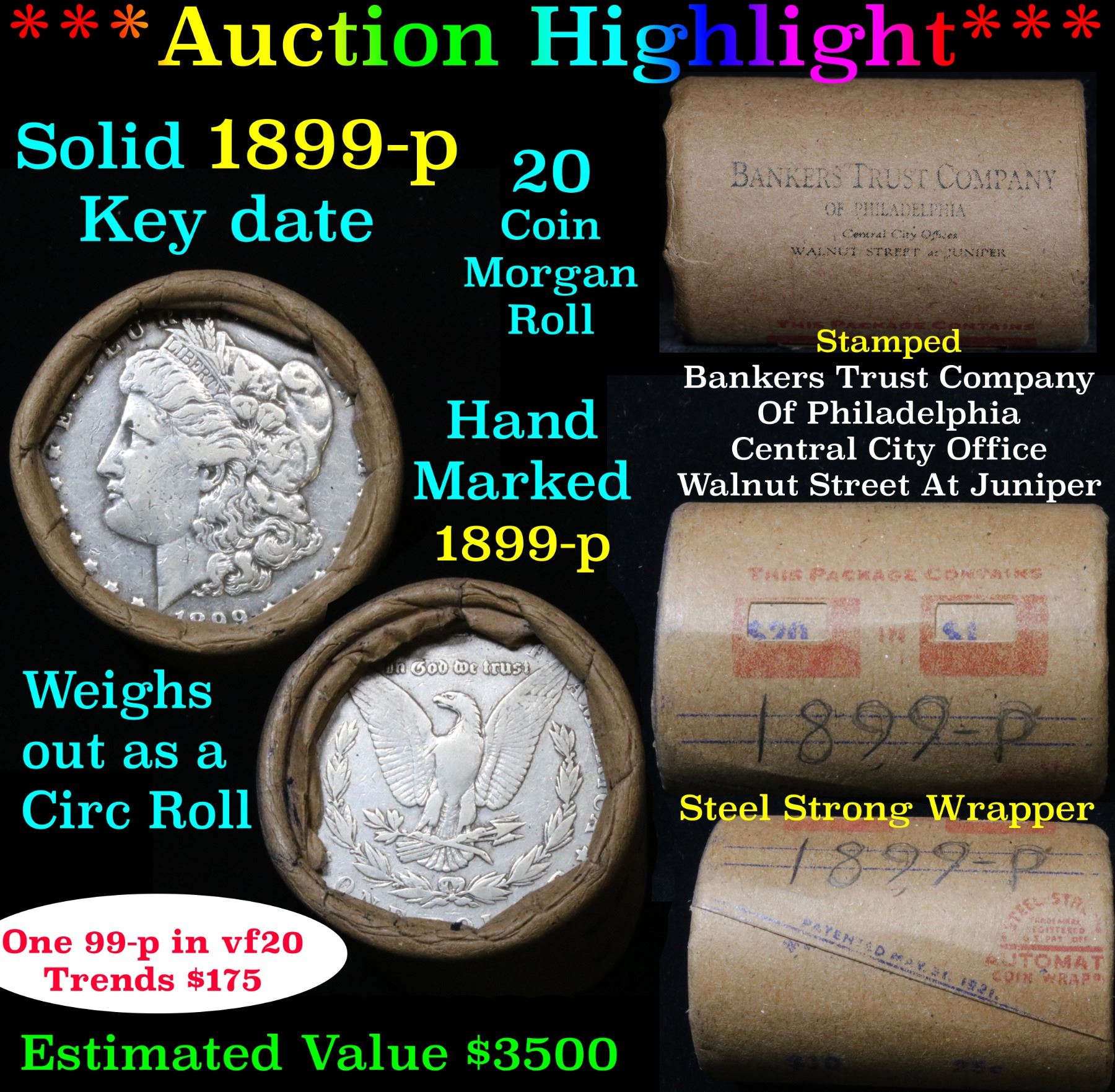 ***Auction Highlight*** Full solid date 1899-p Morgan silver dollar roll, 20 coins . This roll is held in an old Steel strong wrapper, patented 1921, stamped "Bankers Trust Company of PhiladelphiaÓ, Walnut Street at Juniper. This roll contains 20, 1899-p Morgan silver Dollars. The coins may range from circulated to uncirculated. Any condition is possible. We have weighed the roll and can assure you that it is 20 Silver Dollars, that all 20 are 1899-p and that it is not an uncirculated roll as the weight comes in slightly under the 534.60 grams that a fully uncirculated roll would weigh. We recently Acquired a large Estate Hoard of solid date Rolls. Trends lists au50 at $200, xf40 at $190, vf20 at $175, f12 at $155, vg8 at $135, g4 at $125, and ag at $95.