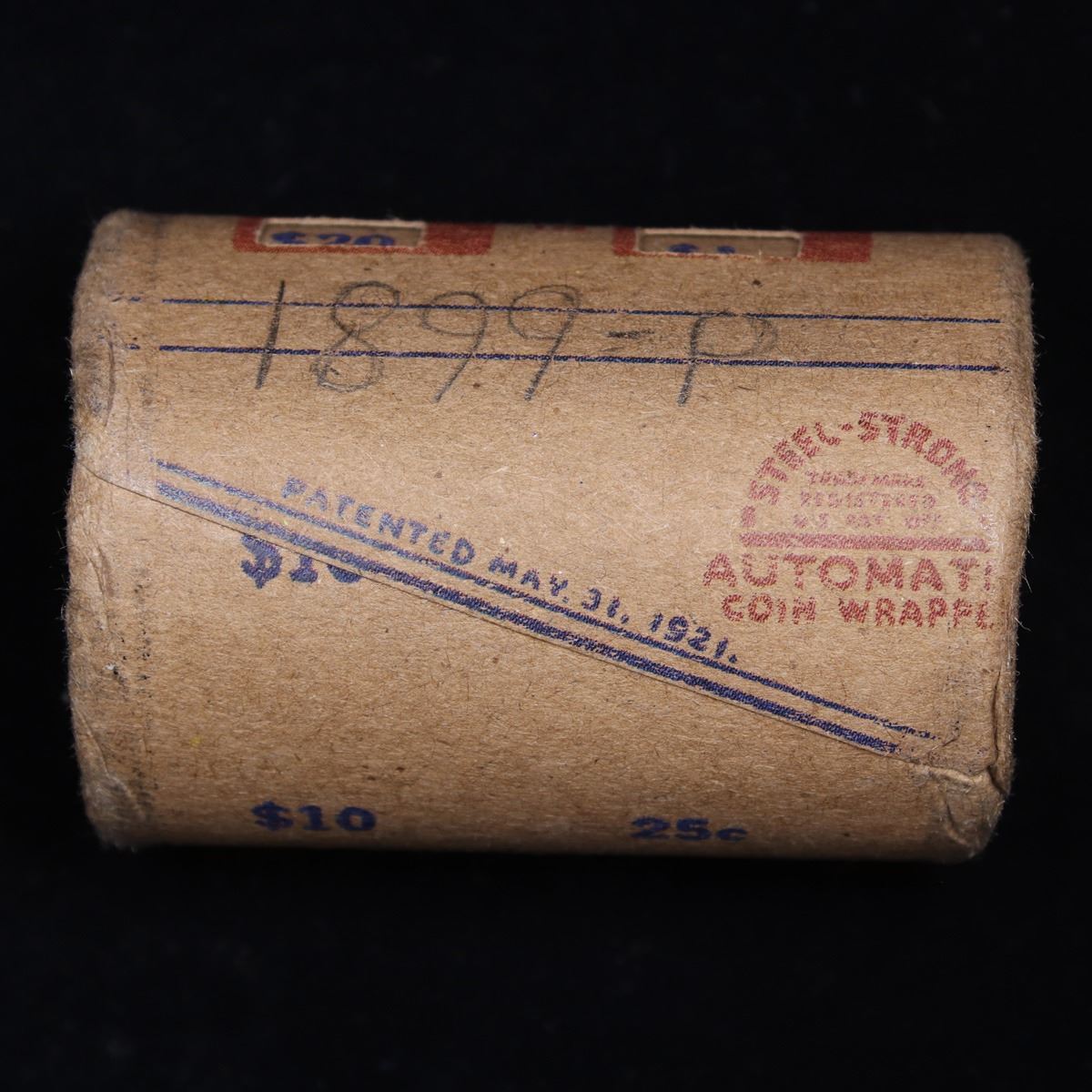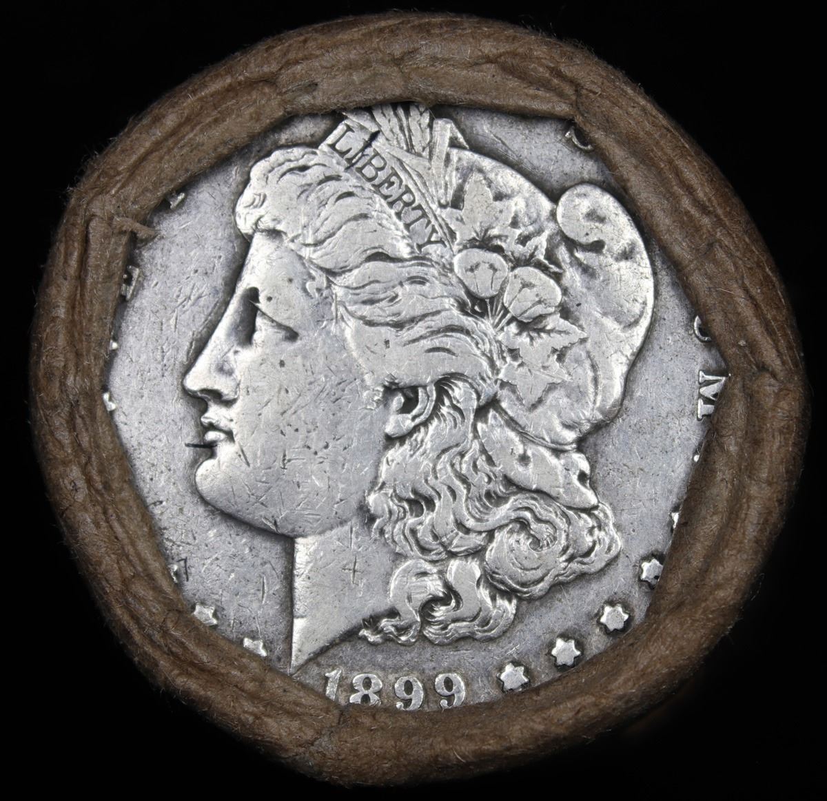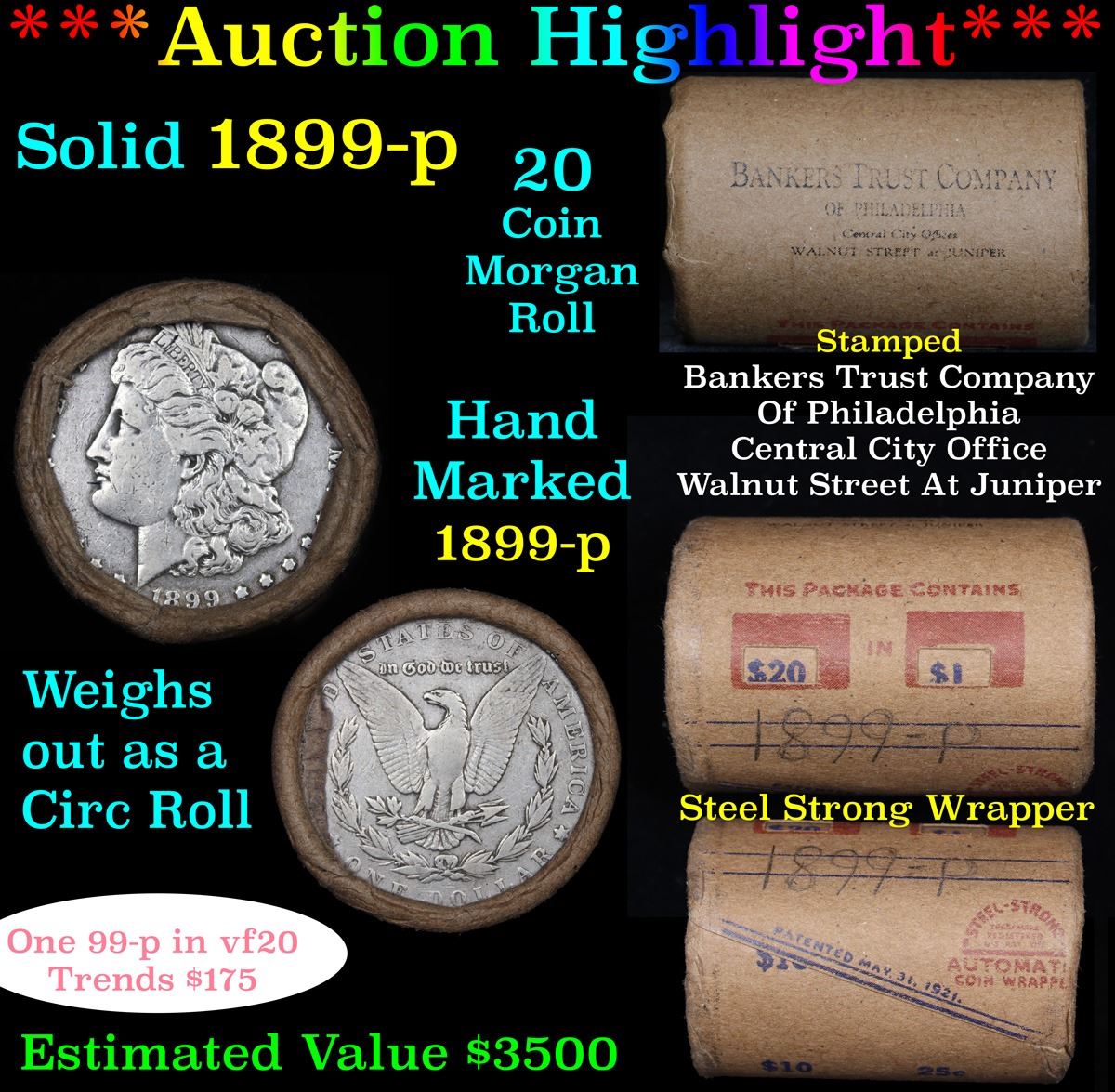 ***Auction Highlight*** Full solid date 1899-p Morgan silver dollar roll, 20 coins . This roll is held in an old Steel strong wrapper, patented 1921, stamped "Bankers Trust Company of PhiladelphiaÓ, Walnut Street at Juniper. This roll contains 20, Key Date 1899-p Morgan silver Dollars. The coins may range from circulated to uncirculated. Any condition is possible. We have weighed the roll and can assure you that it is 20 Silver Dollars, that all 20 are 1899-p and that it is not an uncirculated roll as the weight comes in slightly under the 534.60 grams that a fully uncirculated roll would weigh. We recently Acquired a large Estate Hoard of solid date Rolls. Trends lists au50 at $200, xf40 at $190, vf20 at $175, f12 at $155, vg8 at $135, g4 at $125, and ag at $95.
