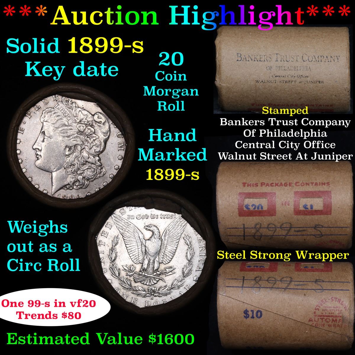 ***Auction Highlight*** Full solid date 1899-s Morgan silver dollar roll, 20 coins.        This roll is held in an old Steel strong wrapper, patented 1921, stamped "Bankers Trust Company of Philadelphia, Walnut Street at Juniper.  This roll contains 20, 1899-s Morgan silver Dollars. The coins may range from circulated to uncirculated. Any condition is possible. We have weighed the roll and can assure you that it is 20 Silver Dollars, that all 20 are 1899-s and that it is not an uncirculated roll as the weight comes in slightly under the 534.60 grams that a fully uncirculated roll would weigh.  We recently Acquired a large Estate Hoard of solid date Rolls. Trends lists au50 at $145, xf40 at $95, vf20 at $80, f12 at $55, vg8 at $50, g4 at $45.