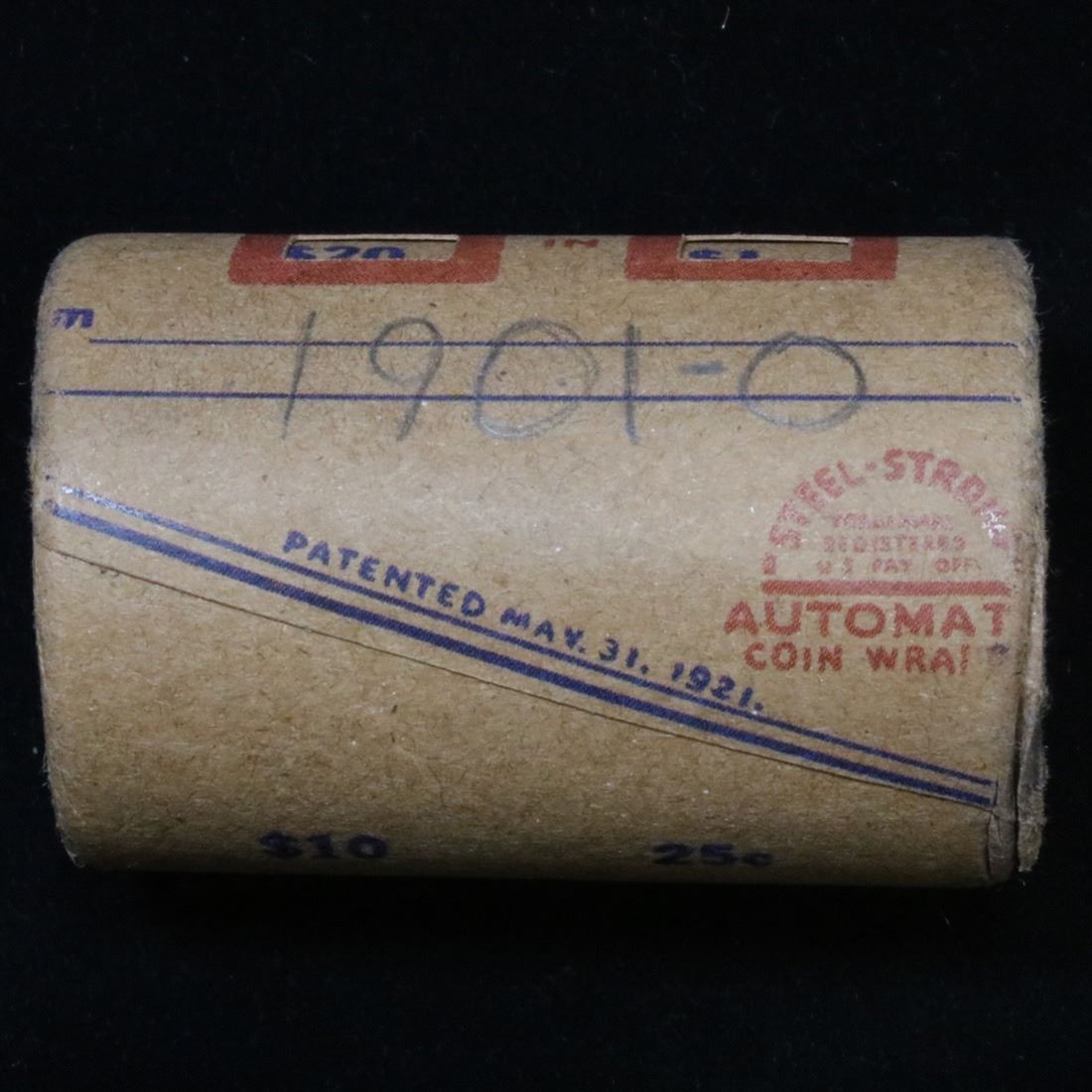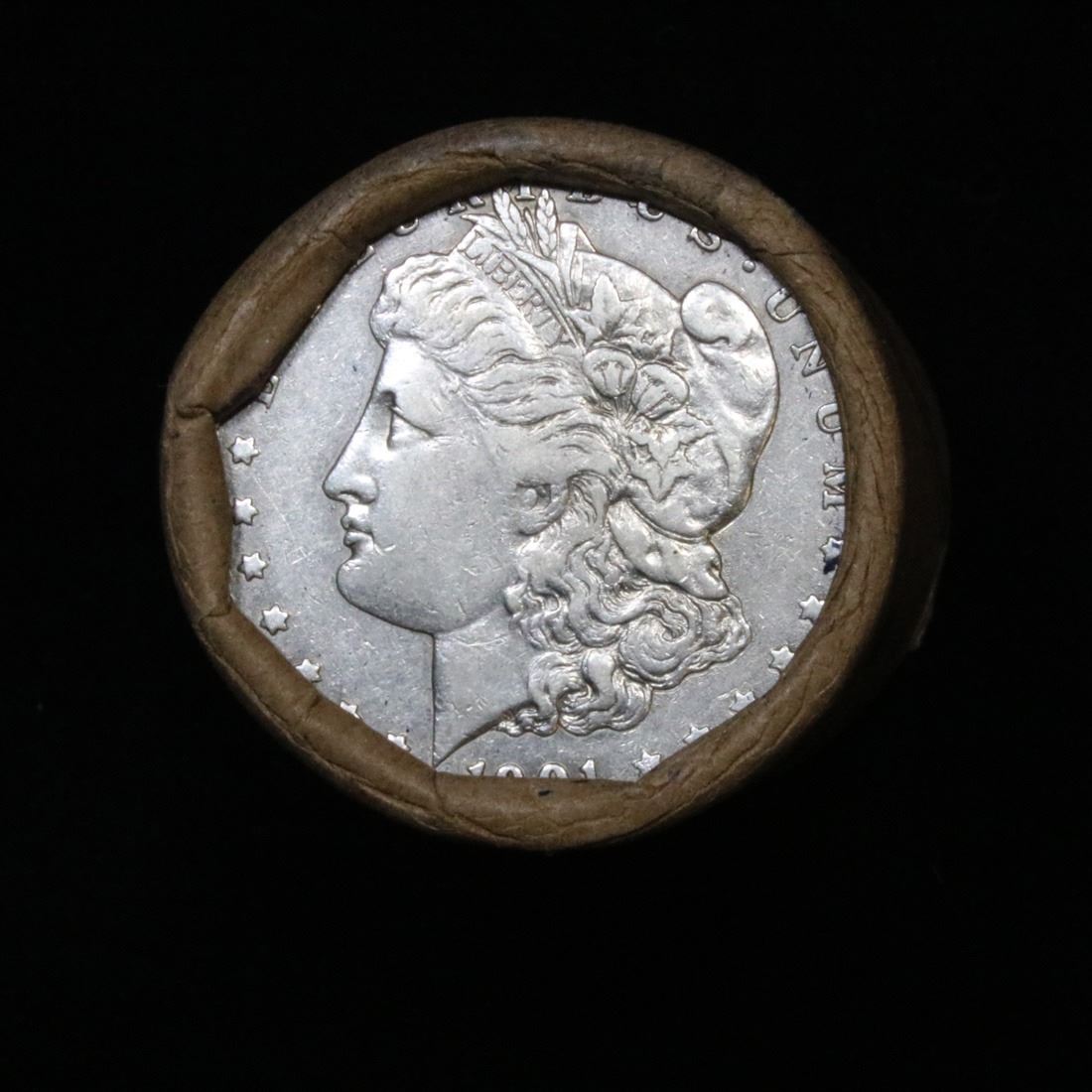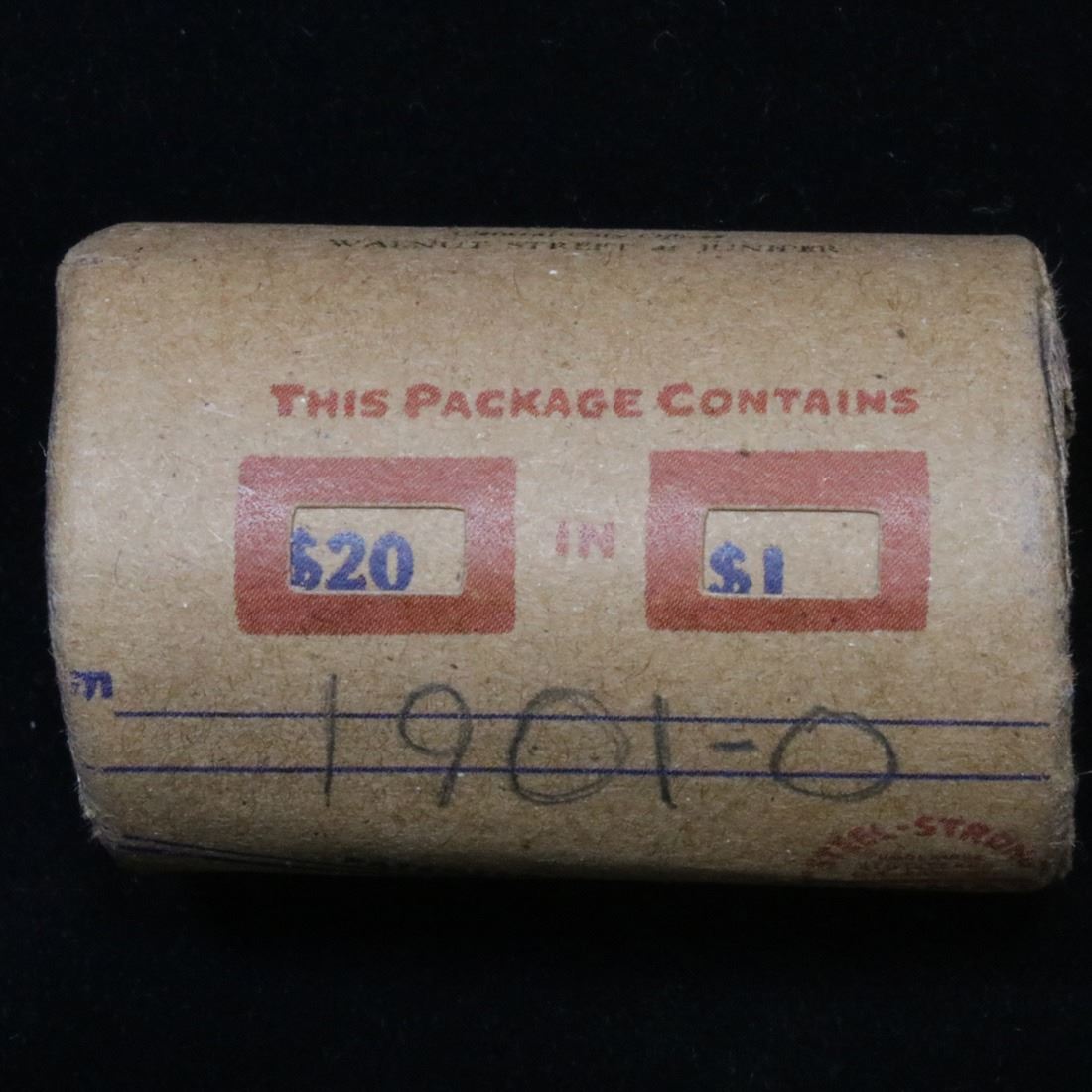***Auction Highlight*** Full solid date 1901-o Morgan silver dollar roll, 20 coins . This roll is held in an old Steel strong wrapper, patented 1921, stamped "Bankers Trust Company of Philadelphia”, Walnut Street at Juniper. This roll contains 20, 1901-o Morgan silver Dollars. The coins may range from circulated to uncirculated. Any condition is possible. We have weighed the roll and can assure you that it is 20 Silver Dollars, that all 20 are 1901-o and that it is not an uncirculated roll as the weight comes in slightly under the 534.60 grams that a fully uncirculated roll would weigh. We recently Acquired a large Estate Hoard of solid date Rolls. Trends lists au50 at $35, xf40 at $32, vf20 at $31, f12 at $30, vg8 at $28, g4 at $24.