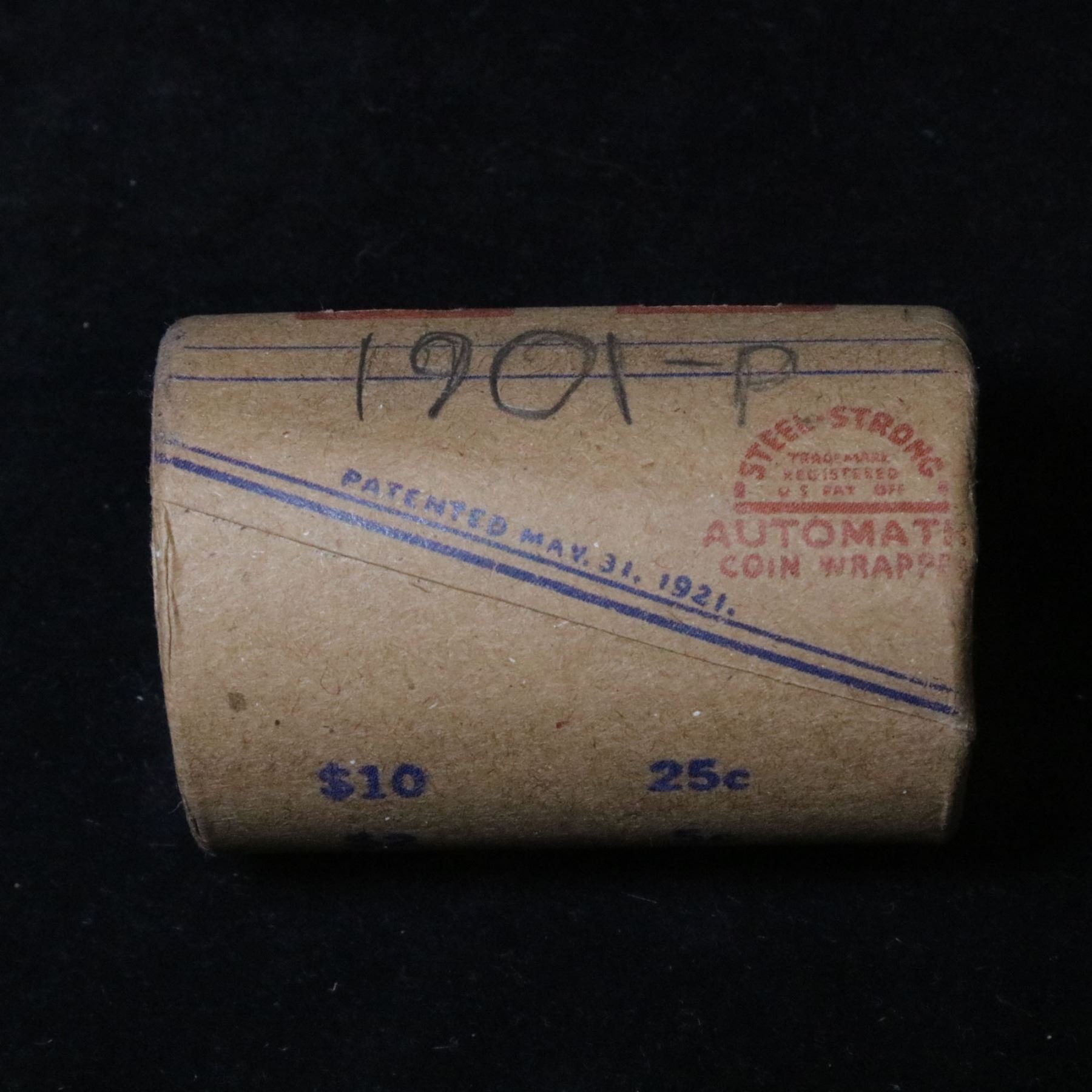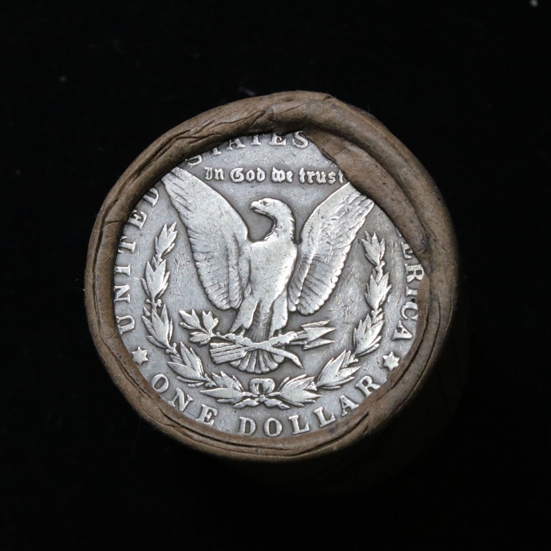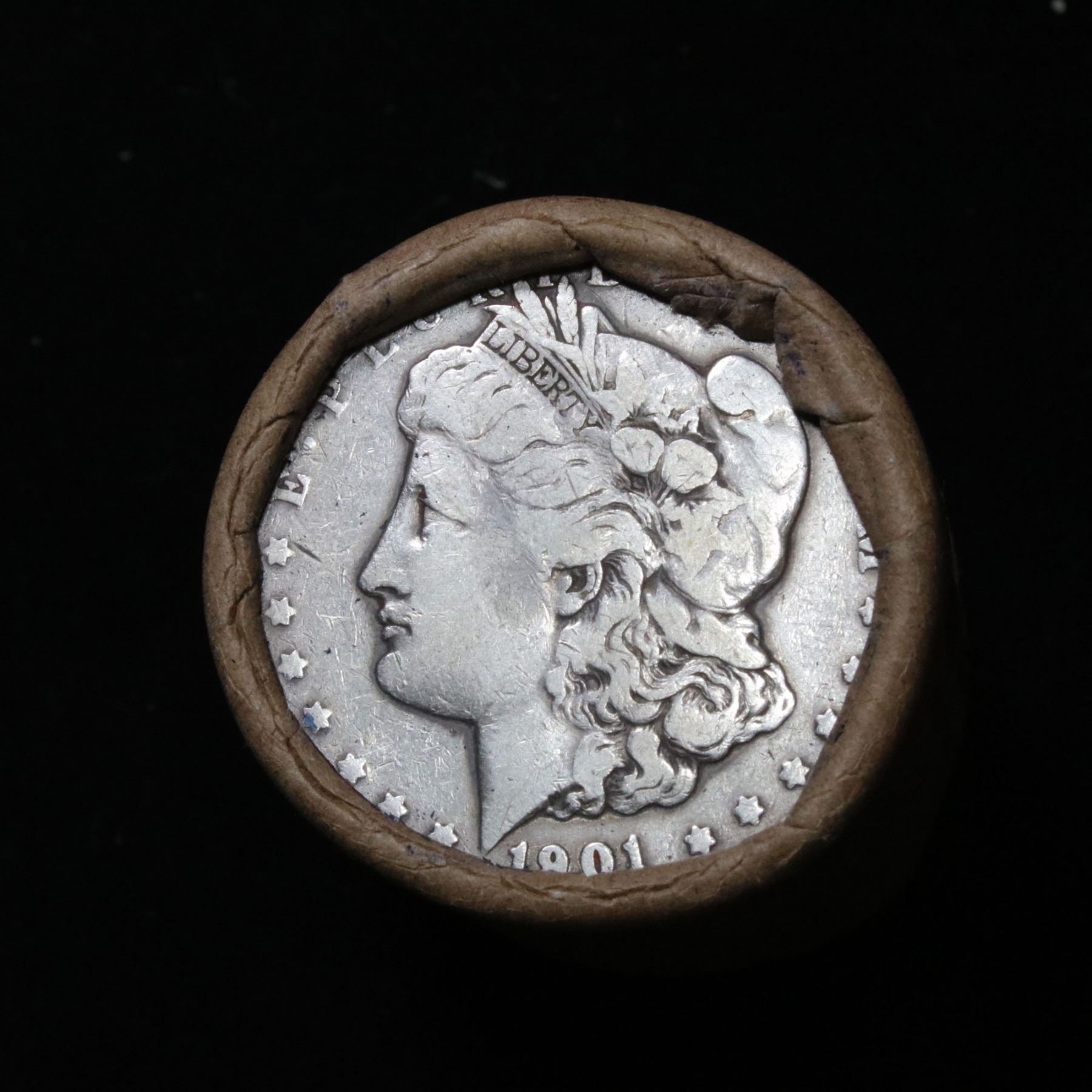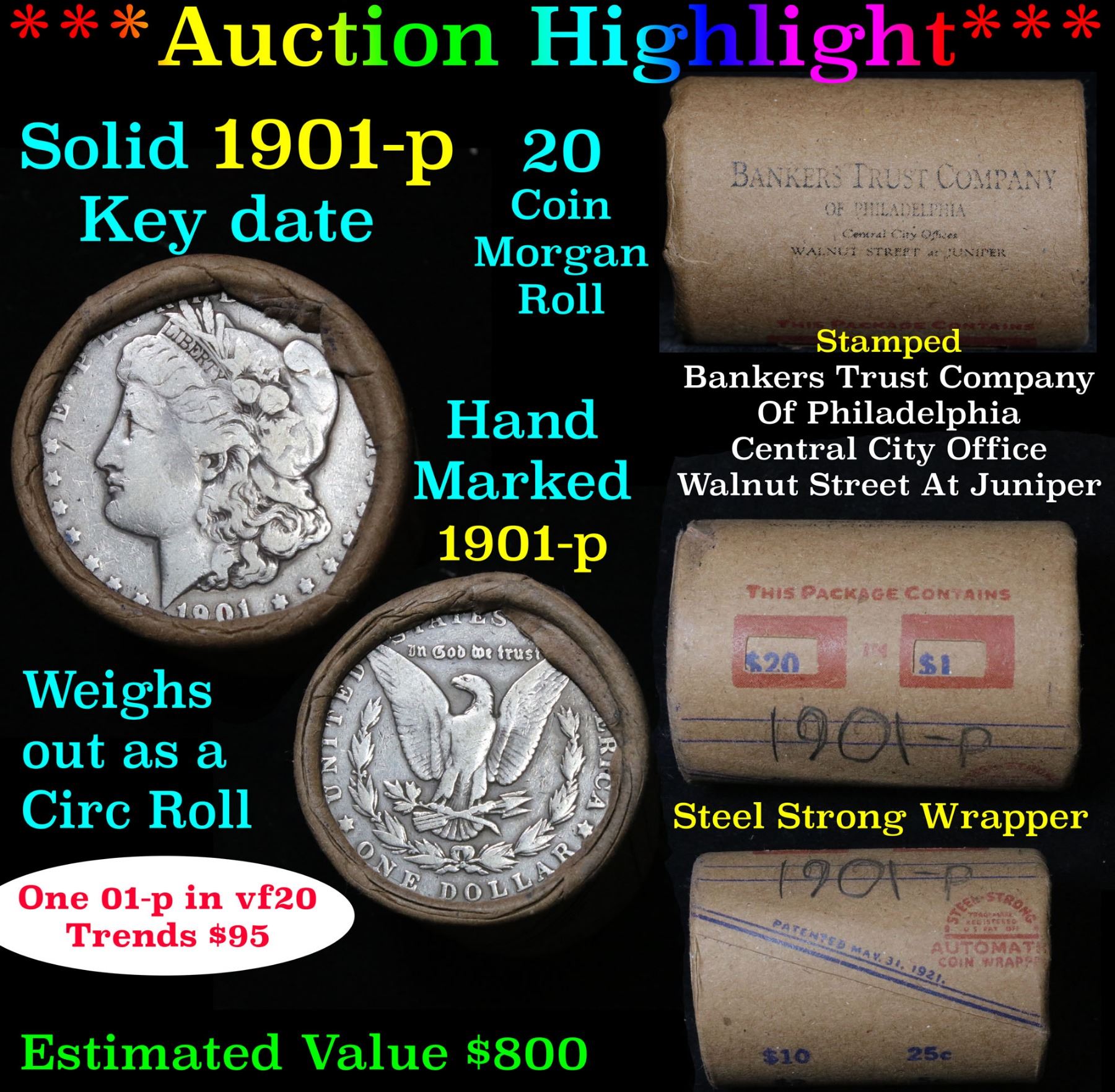 ***Auction Highlight*** Full solid date 1901-p Morgan silver dollar roll, 20 coins . 0 0 This roll is held in an old Steel strong wrapper, patented 1921, stamped "Bankers Trust Company of PhiladelphiaÓ, Walnut Street at Juniper. This roll contains 20, 1901-p Morgan silver Dollars. The coins may range from circulated to uncirculated. Any condition is possible. We have weighed the roll and can assure you that it is 20 Silver Dollars, that all 20 are 1901-p and that it is not an uncirculated roll as the weight comes in slightly under the 534.60 grams that a fully uncirculated roll would weigh. We recently Acquired a large Estate Hoard of solid date Rolls. Trends lists au50 at $250, xf40 at $115, vf20 at $95, f12 at $57, vg8 at $50, g4 at $42.