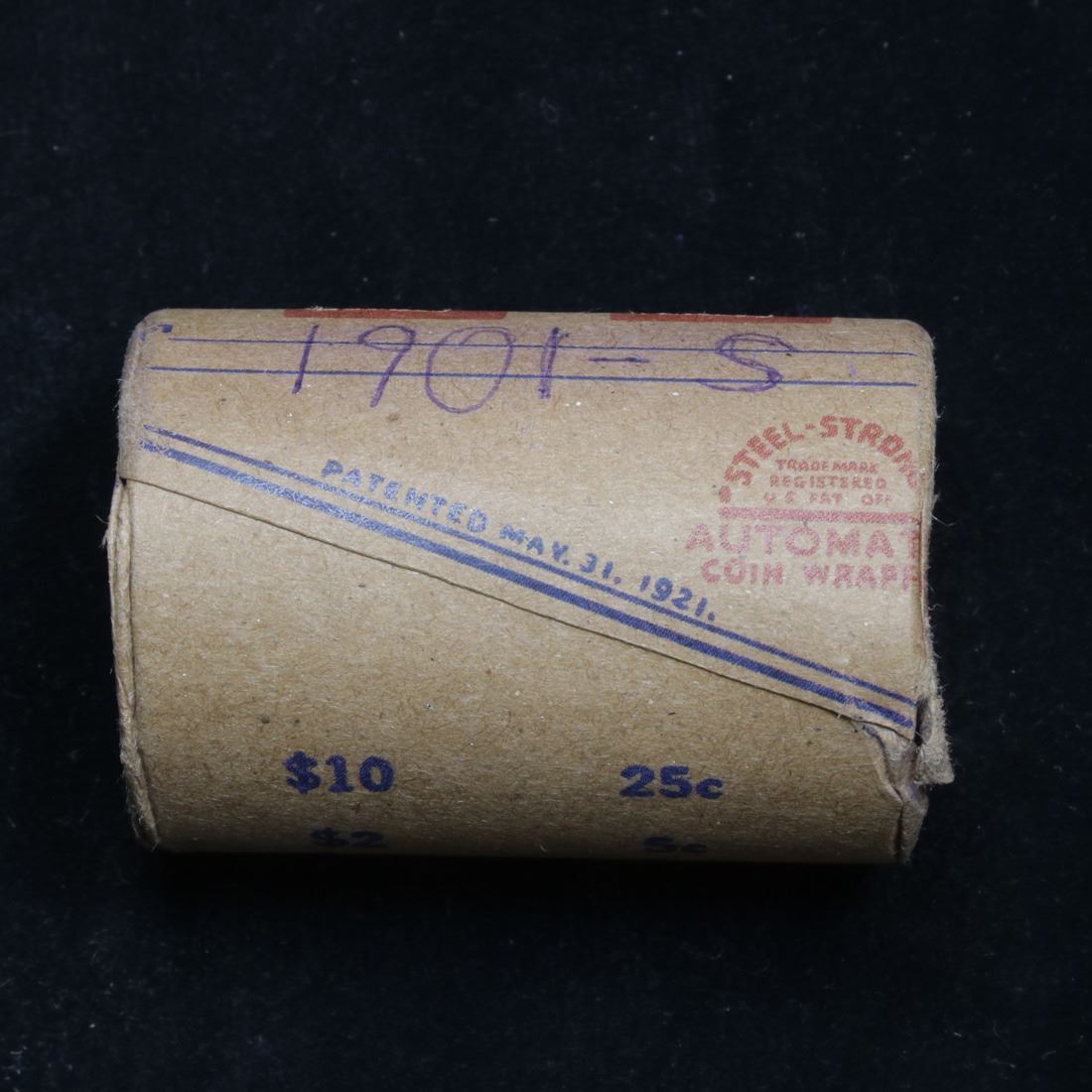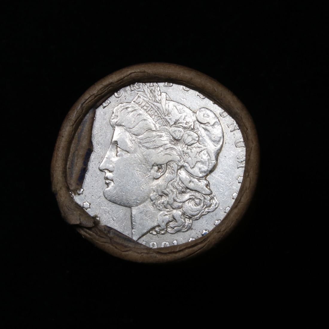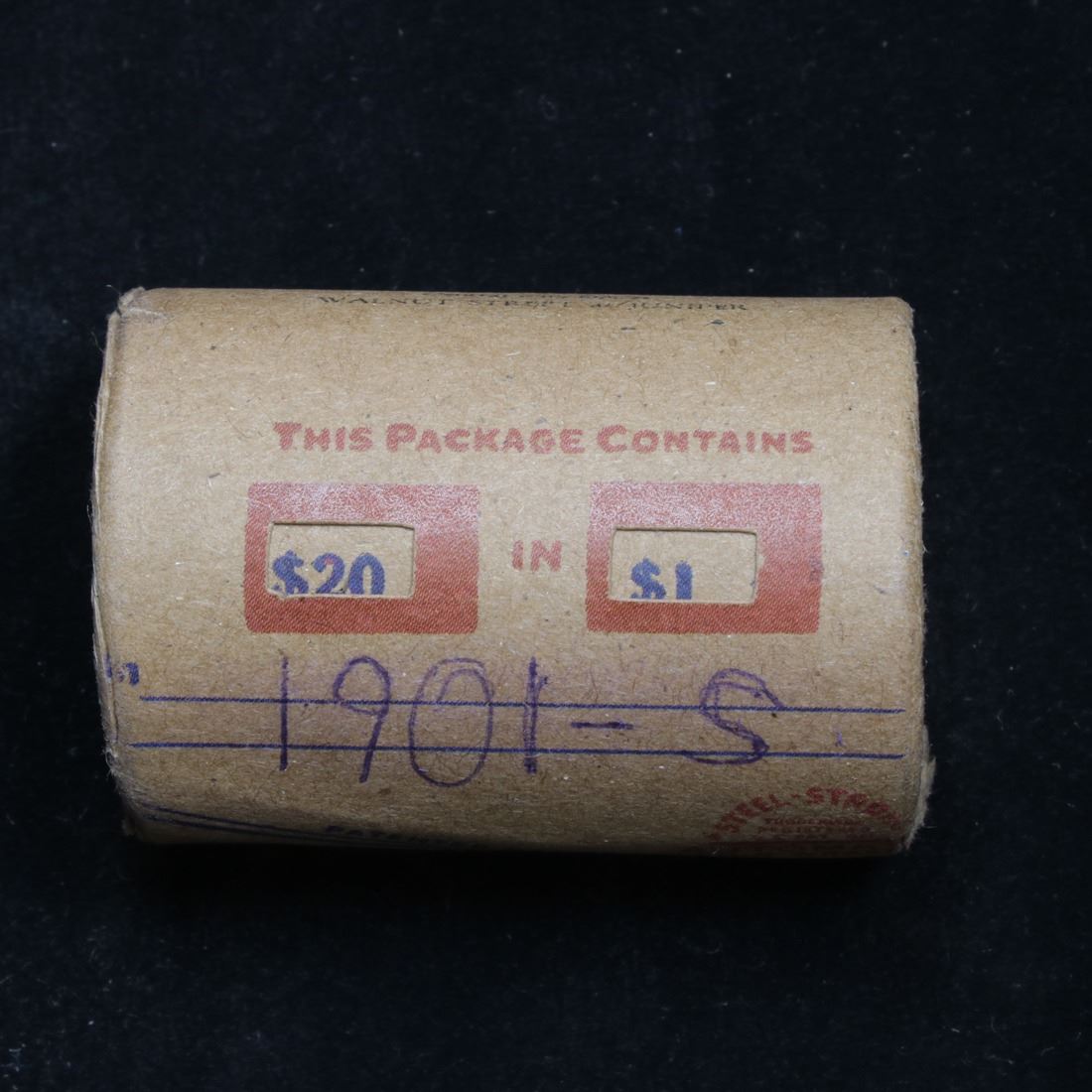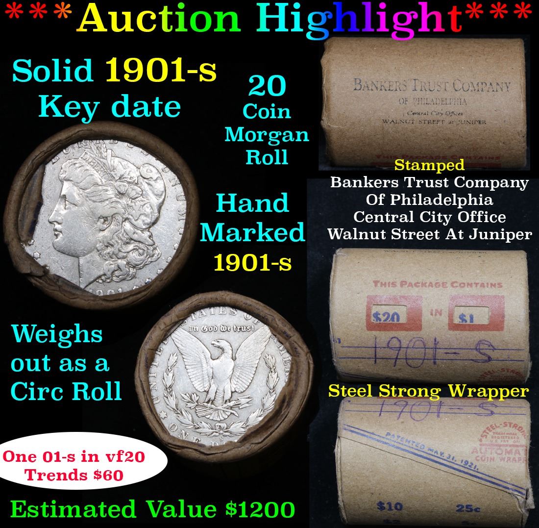 ***Auction Highlight*** Full solid date 1901-s Morgan silver dollar roll, 20 coins . This roll is held in an old Steel strong wrapper, patented 1921, stamped "Bankers Trust Company of PhiladelphiaÓ, Walnut Street at Juniper. This roll contains 20, 1901-s Morgan silver Dollars. The coins may range from circulated to uncirculated. Any condition is possible. We have weighed the roll and can assure you that it is 20 Silver Dollars, that all 20 are 1901-s and that it is not an uncirculated roll as the weight comes in slightly under the 534.60 grams that a fully uncirculated roll would weigh. We recently Acquired a large Estate Hoard of solid date Rolls. Trends lists au50 at $215, xf40 at $77, vf20 at $60, f12 at $50, vg8 at $46, g4 at $42, and ag at $29.