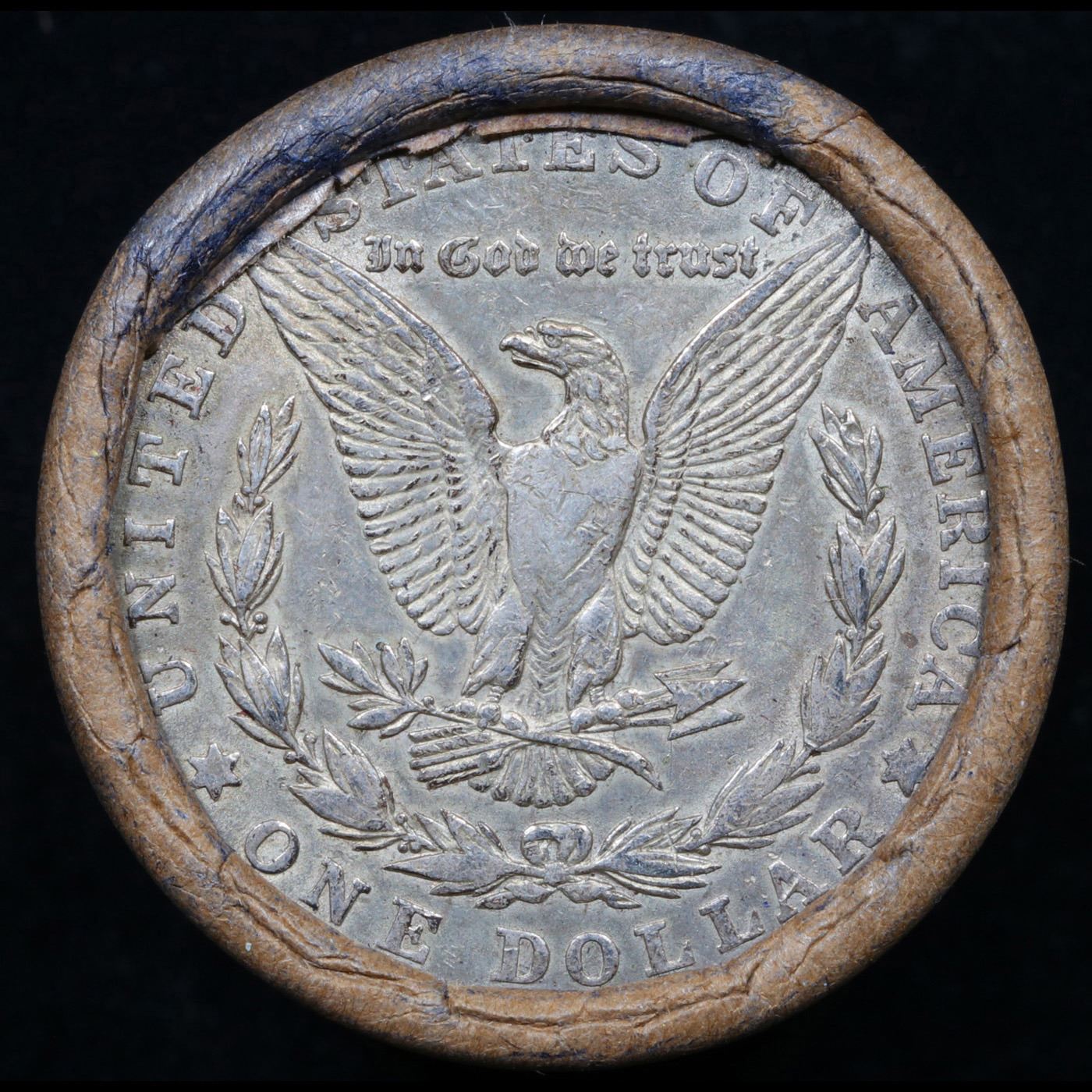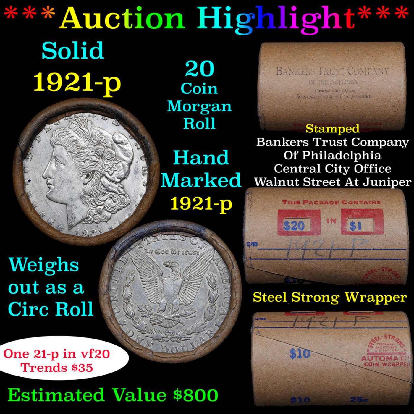 ***Auction Highlight*** Full solid date 1921-p Morgan silver $1 roll, 20 coins. . This roll is held in an old Steel strong wrapper, patented 1921, stamped "Bankers Trust Company of Philadelphia, Walnut Street at Juniper. This roll contains 20, 1921-p Morgan silver Dollars. The coins may range from circulated to uncirculated. Any condition is possible. We have weighed the roll and can assure you that it is 20 Silver Dollars, that all 20 are 1921-p and that it is not an uncirculated roll as the weight comes in slightly under the 534.60 grams that a fully uncirculated roll would weigh. We recently Acquired a large Estate Hoard of solid date Rolls. Trends lists au50 at $50, xf40 at $45, vf20 at $45, f12 at $45, vg8 at $40, g4 at $40.
