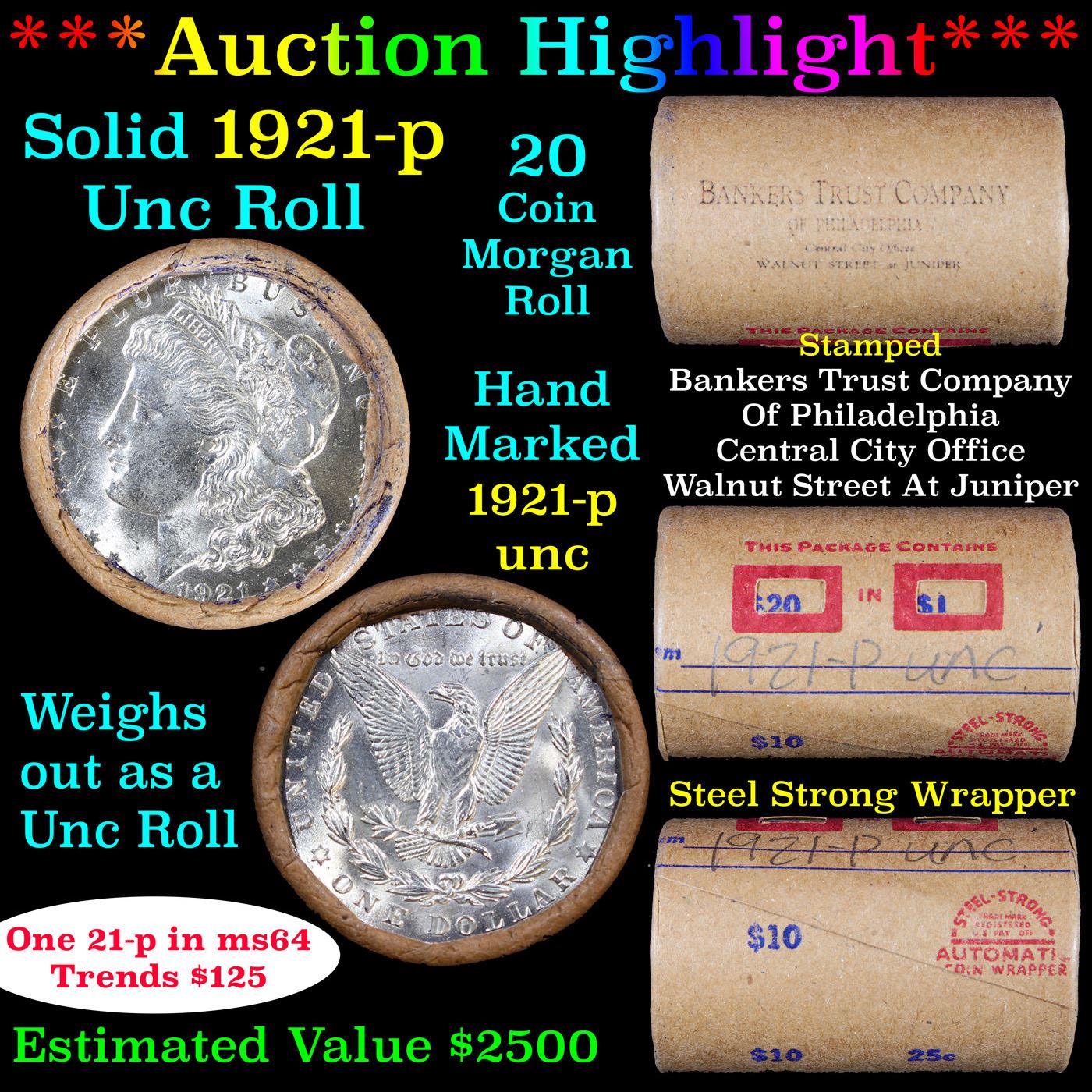 ***Auction Highlight*** Full solid date 1921-p Uncirculated Morgan silver dollar roll, 20 coins. This roll is held in an old Steel strong wrapper, patented 1921, stamped "Bankers Trust Company of Philadelphia, Walnut Street at Juniper. This roll contains 20, UNCIRCULATED 1921-p Morgan silver Dollars. The coins may range from Unc to Gem++ with the average being ms64. This is a PQ original bank roll hand marked 1921-p Unc. We have weighed the roll and can assure you that it weighs perfectly at 534.60 grams and is an UNCIRCULATED roll and that all 20 coins are 1921-p. We recently Acquired a large Estate Hoard of solid date Rolls. Trends lists ms64 at $120.