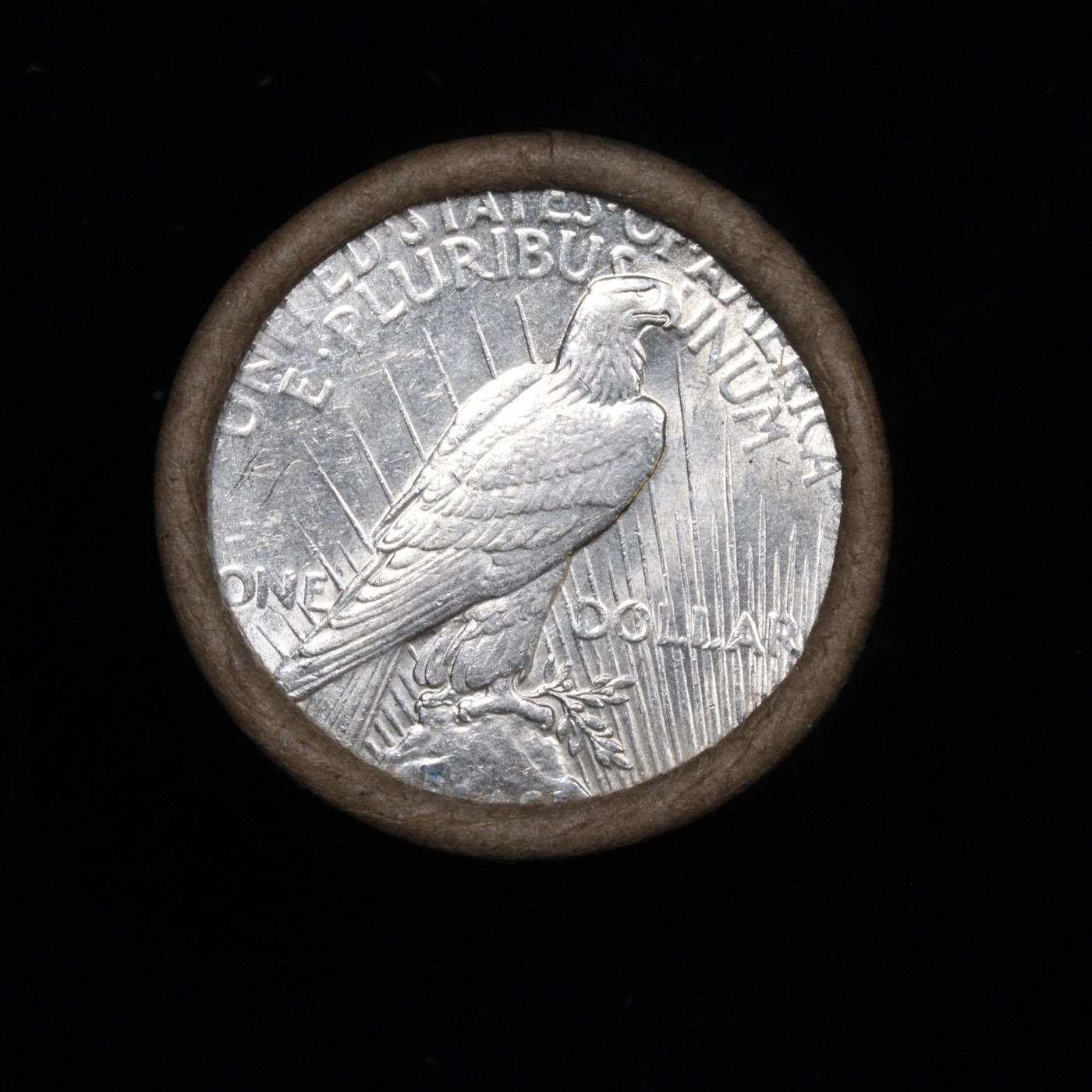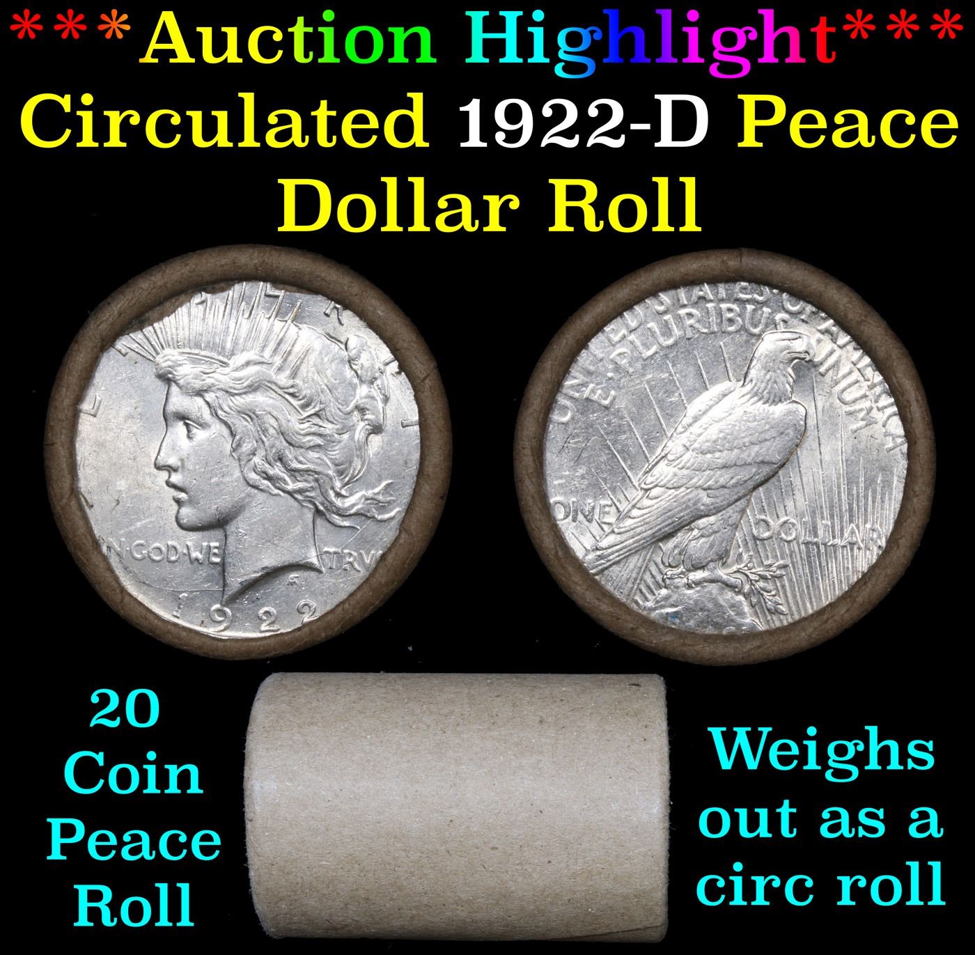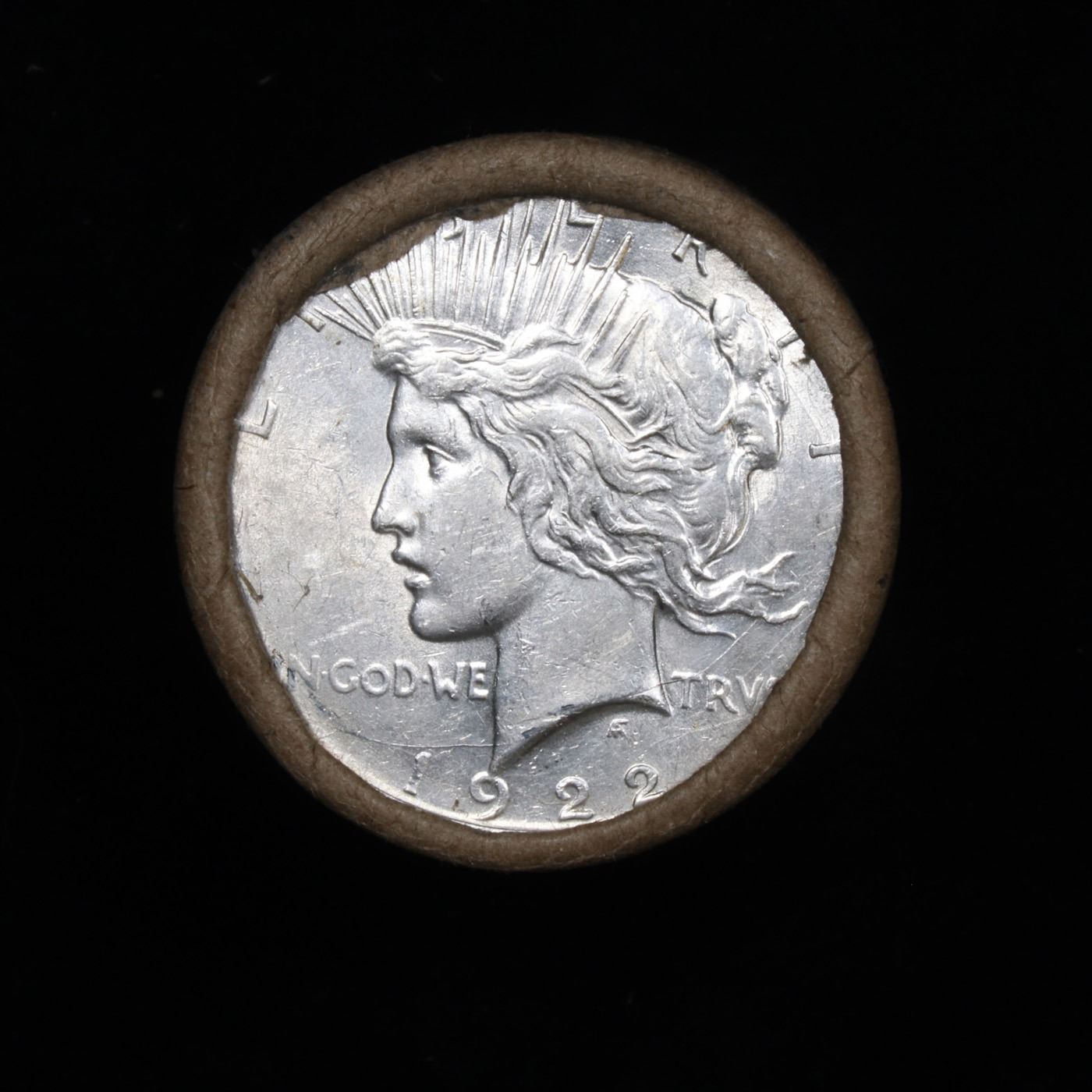 ***Auction Highlight*** Full solid date 1922-d Peace silver dollar roll. Full solid date 1922-d Peace silver dollar roll, 20 coins Grades. This roll is held in an old Steel strong wrapper This roll contains 20, 1922-d Pease silver Dollars. The coins may range from circulated to uncirculated. Any condition is possible. We have weighed the roll and can assure you that it is 20 Silver Dollars, that all 20 are 1922-d and that it is not an uncirculated roll as the weight comes in slightly under the 534.60 grams that a fully uncirculated roll would weigh. We recently Acquired a large Estate Hoard of solid date Rolls.