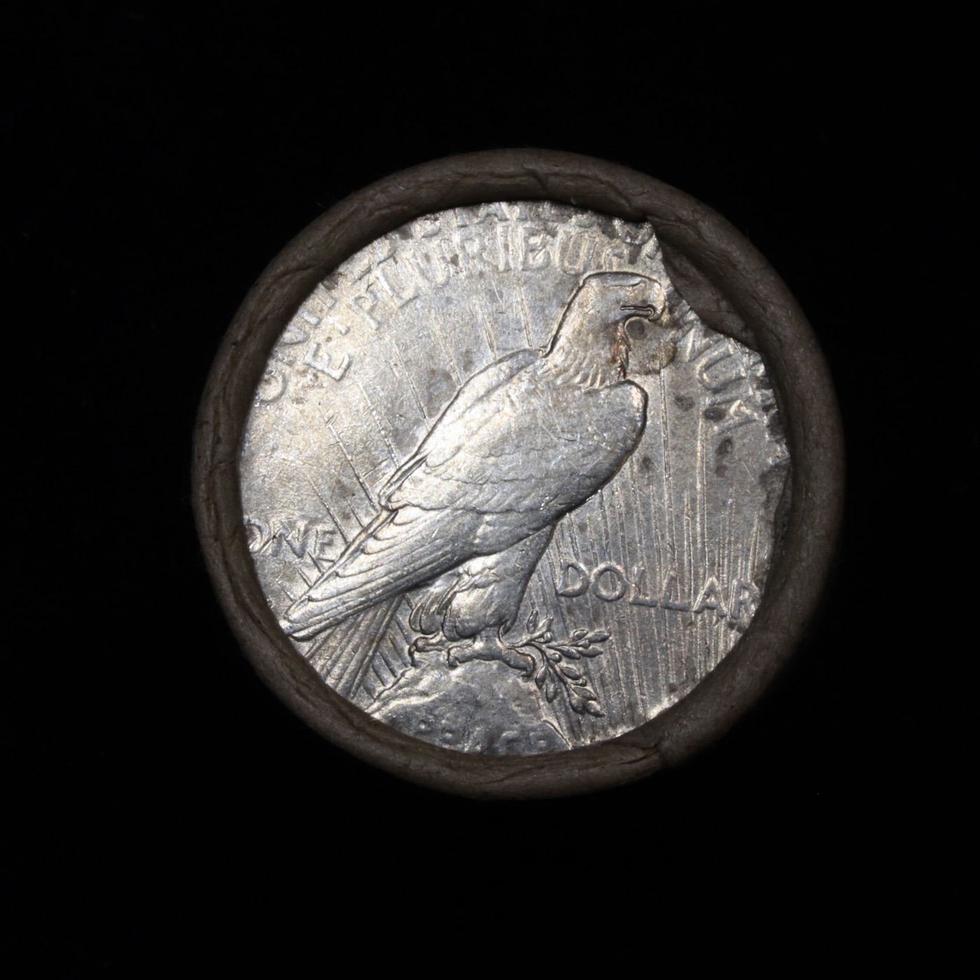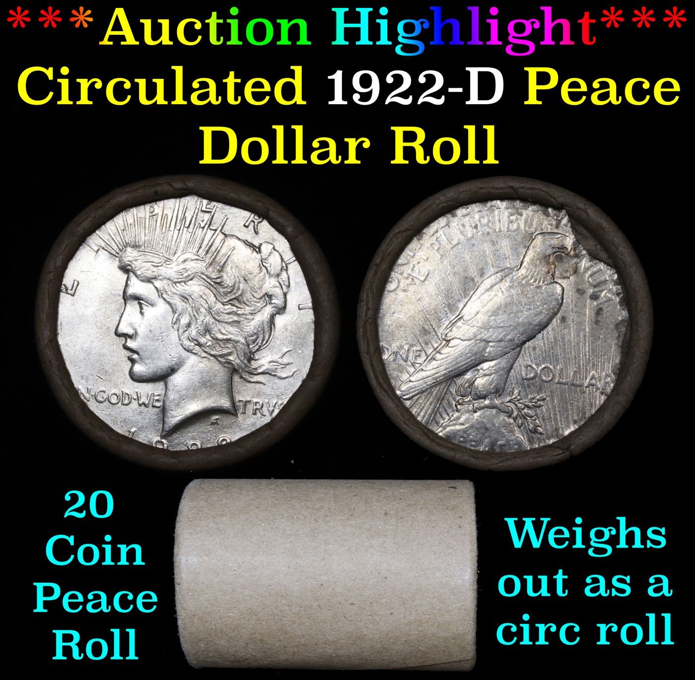 ***Auction Highlight*** Full solid date 1922-d Peace silver dollar roll. Full solid date 1922-d Peace silver dollar roll, 20 coins Grades. This roll is held in an old Steel strong wrapper This roll contains 20, 1922-d Pease silver Dollars. The coins may range from circulated to uncirculated. Any condition is possible. We have weighed the roll and can assure you that it is 20 Silver Dollars, that all 20 are 1922-d and that it is not an uncirculated roll as the weight comes in slightly under the 534.60 grams that a fully uncirculated roll would weigh. We recently Acquired a large Estate Hoard of solid date Rolls.