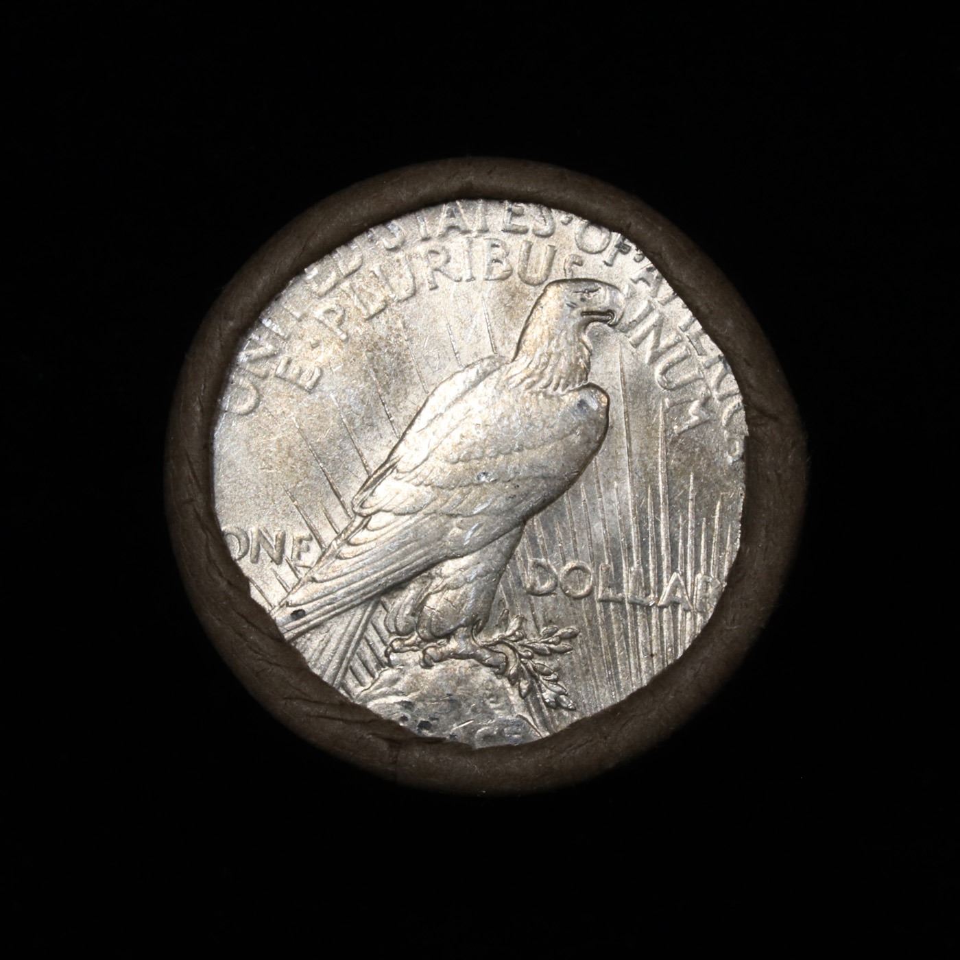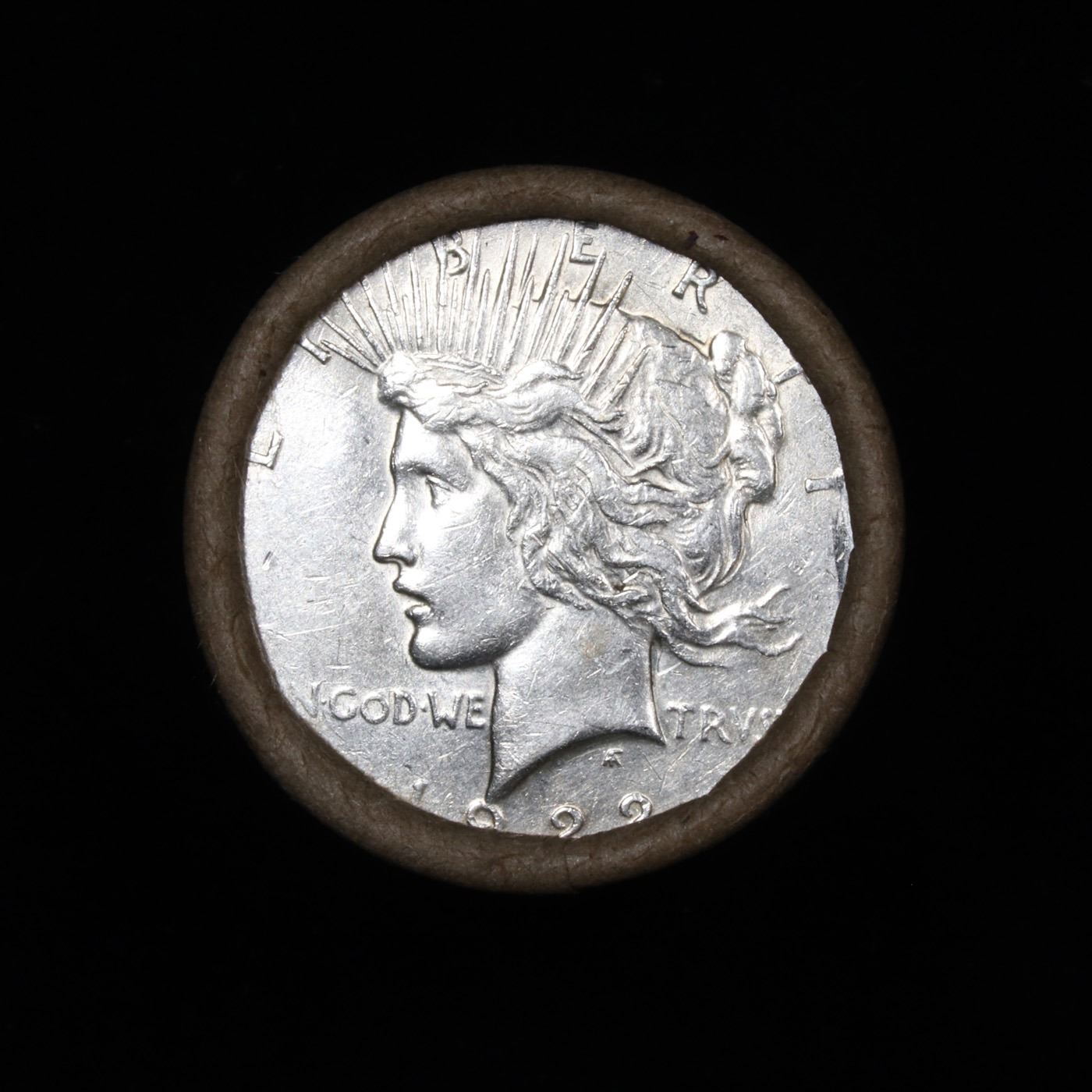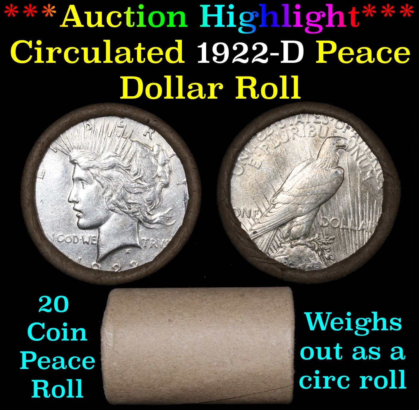 ***Auction Highlight*** Full solid date 1922-d Peace silver dollar roll. Full solid date 1922-d Peace silver dollar roll, 20 coins Grades. This roll is held in an old generic brown wrapper. This roll contains 20, 1922-d Pease silver Dollars. The coins may range from circulated to uncirculated. Any condition is possible. We have weighed the roll and can assure you that it is 20 Silver Dollars, that all 20 are 1922-d and that it is not an uncirculated roll as the weight comes in slightly under the 534.60 grams that a fully uncirculated roll would weigh. We recently Acquired a large Estate Hoard of solid date Rolls.