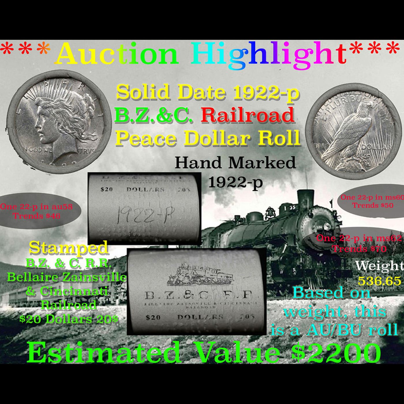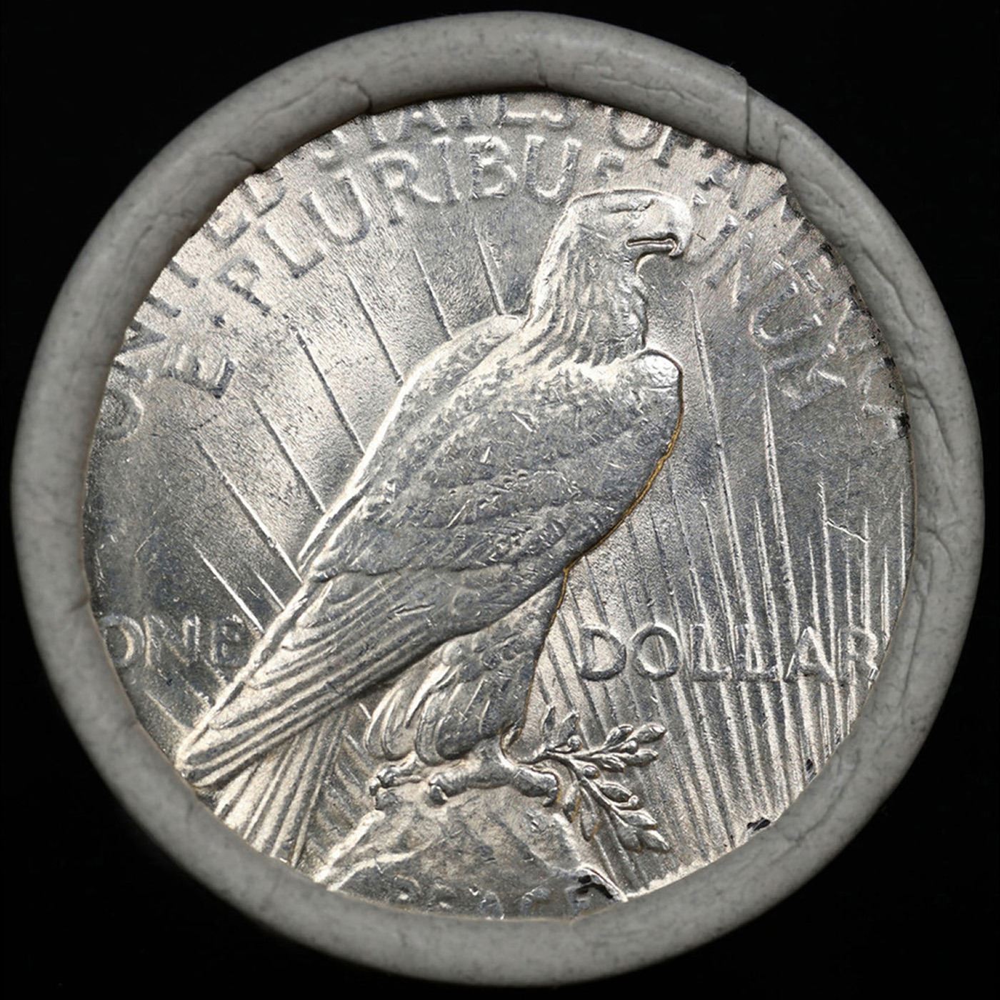 ***Auction Highlight*** Full solid date 1922-p Au/Bu Slider Peace silver dollar roll, 20 coins. Up For Auction Is a Very Near Solid Uncirculated Peace Dollar Roll In an old Bellaire Zainsvill & Cincinnati Railroad wrapper with Tight Shotgun Ends. This roll contains 20, Au/Bu Slider 1923-p Peace silver Dollars. This Roll is filled with Virtually all Uncirculated Silver Dollars. This is how we determined that. A Uncirculated Peace Dollar a Weights 26.73 Grams. So 20 of them would weigh, 534.6 Grams. Our Uncirculated Roll Weighs 536.7 Grams, so the Wrappers weigh 2.1 Grams. The Roll at hand weighs 536.65 Grams. Deducting the Wrapper Weight of 2.1 Grams, the average coin in this roll weights 26.72 Grams. Your going to find in this roll a lot of Uncirculated coins and a few sliders. This is a Very Near Solid roll of Uncirculated Peace Dollars.