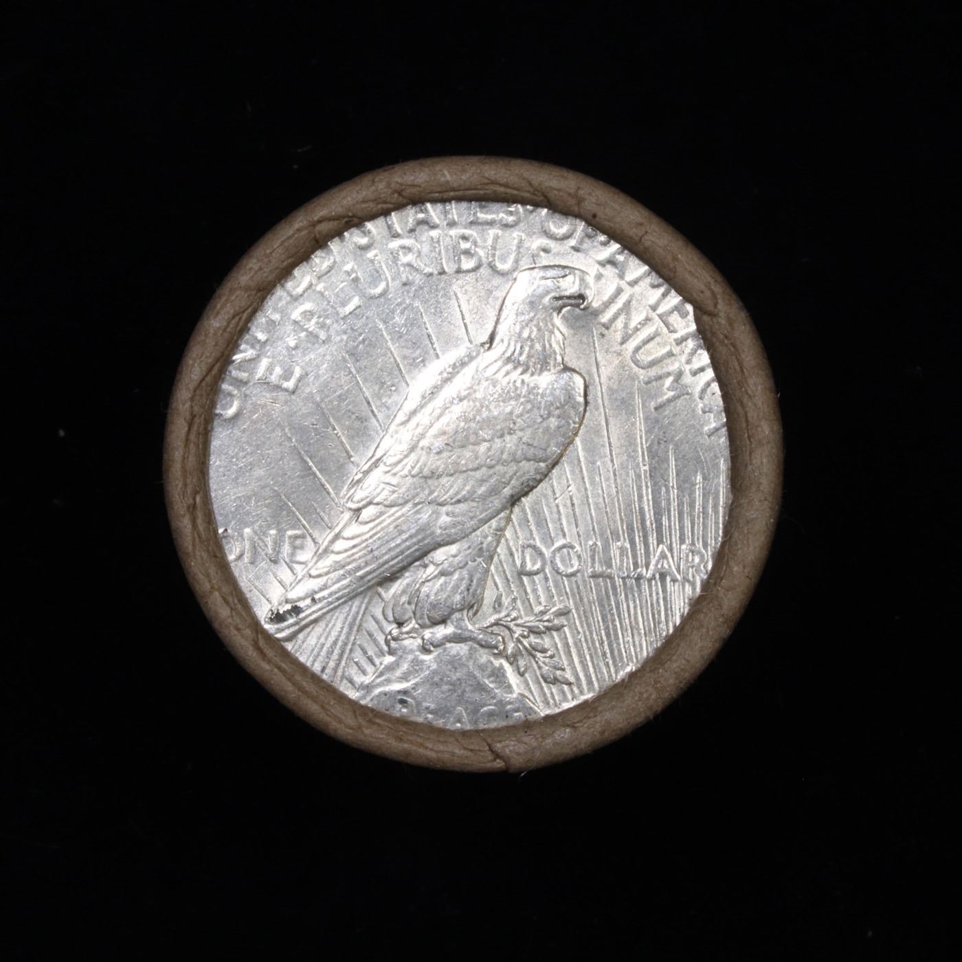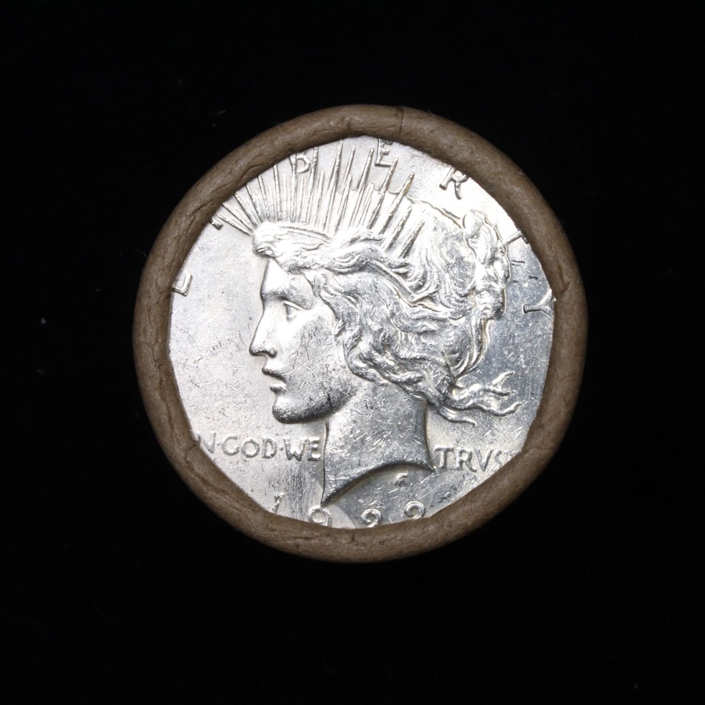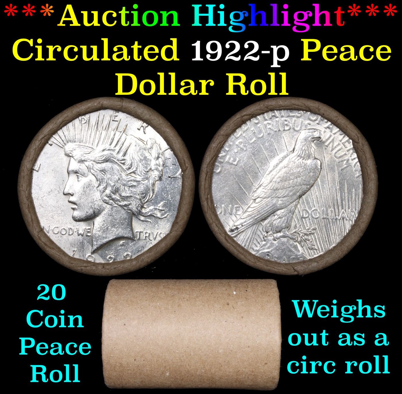 ***Auction Highlight*** Full solid date 1922-p Peace silver dollar roll. Full solid date 1922-p Peace silver dollar roll, 20 coins Grades. This roll is held in an old generic brown wrapper. This roll contains 20, 1922-p Pease silver Dollars. The coins may range from circulated to uncirculated. Any condition is possible. We have weighed the roll and can assure you that it is 20 Silver Dollars, that all 20 are 1922-p and that it is not an uncirculated roll as the weight comes in slightly under the 534.60 grams that a fully uncirculated roll would weigh. We recently Acquired a large Estate Hoard of solid date Rolls.