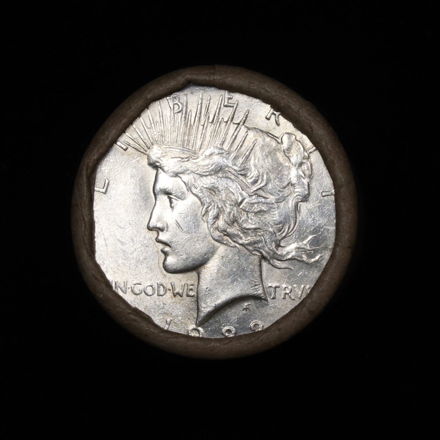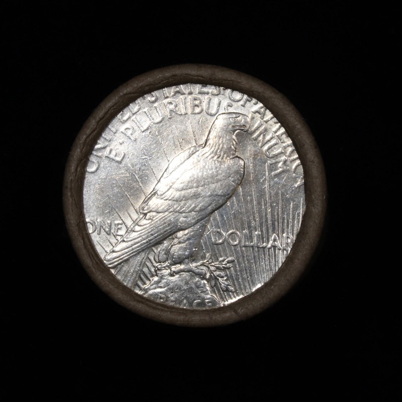 ***Auction Highlight*** Full solid date 1922-p Peace silver dollar roll. Full solid date 1922-p Peace silver dollar roll, 20 coins Grades. This roll is held in an old generic brown wrapper. This roll contains 20, 1922-p Pease silver Dollars. The coins may range from circulated to uncirculated. Any condition is possible. We have weighed the roll and can assure you that it is 20 Silver Dollars, that all 20 are 1922-p and that it is not an uncirculated roll as the weight comes in slightly under the 534.60 grams that a fully uncirculated roll would weigh. We recently Acquired a large Estate Hoard of solid date Rolls.