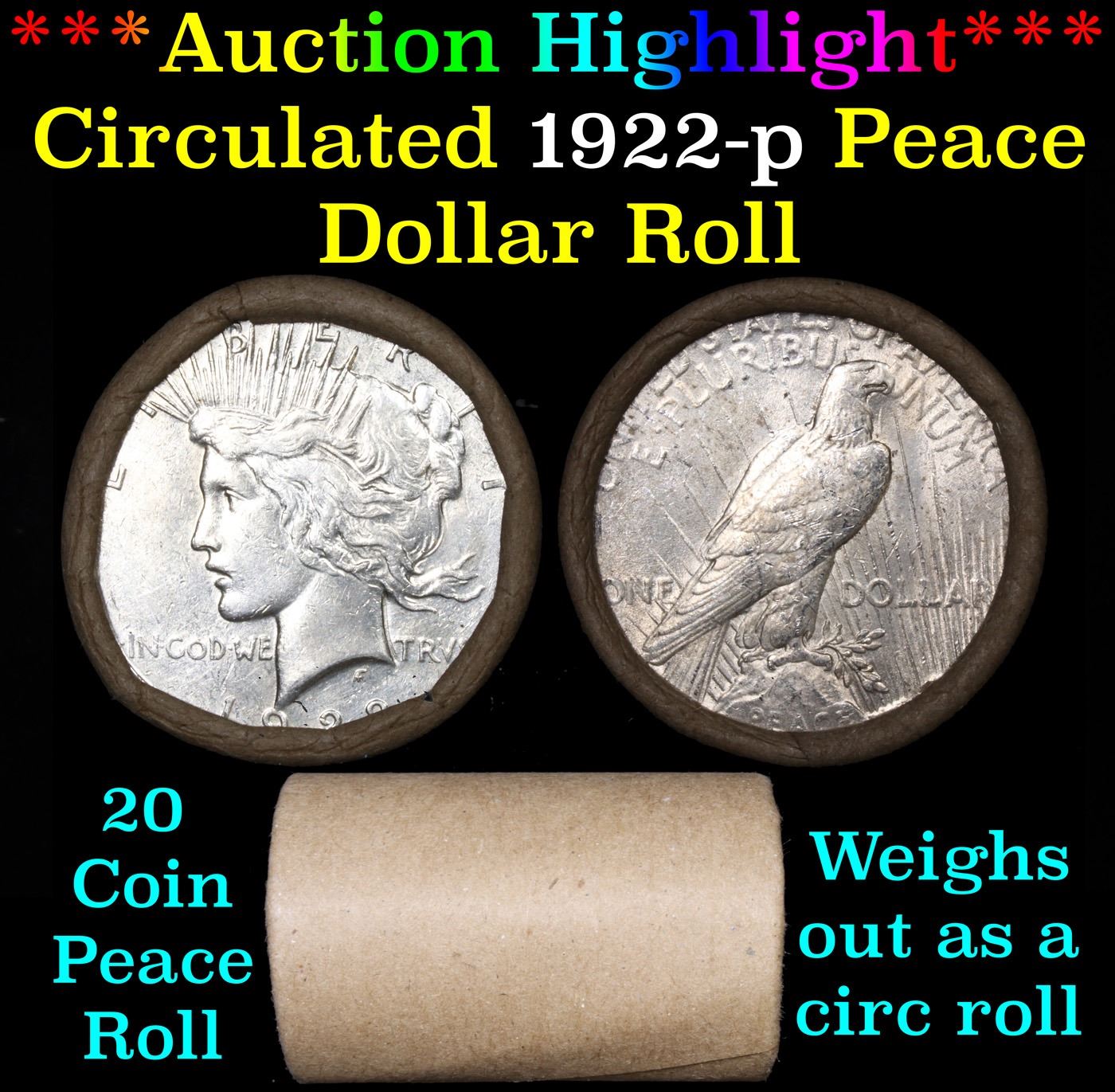 ***Auction Highlight*** Full solid date 1922-p Peace silver dollar roll. Full solid date 1922-p Peace silver dollar roll, 20 coins Grades. This roll is held in an old generic brown wrapper. This roll contains 20, 1922-p Pease silver Dollars. The coins may range from circulated to uncirculated. Any condition is possible. We have weighed the roll and can assure you that it is 20 Silver Dollars, that all 20 are 1922-p and that it is not an uncirculated roll as the weight comes in slightly under the 534.60 grams that a fully uncirculated roll would weigh. We recently Acquired a large Estate Hoard of solid date Rolls.