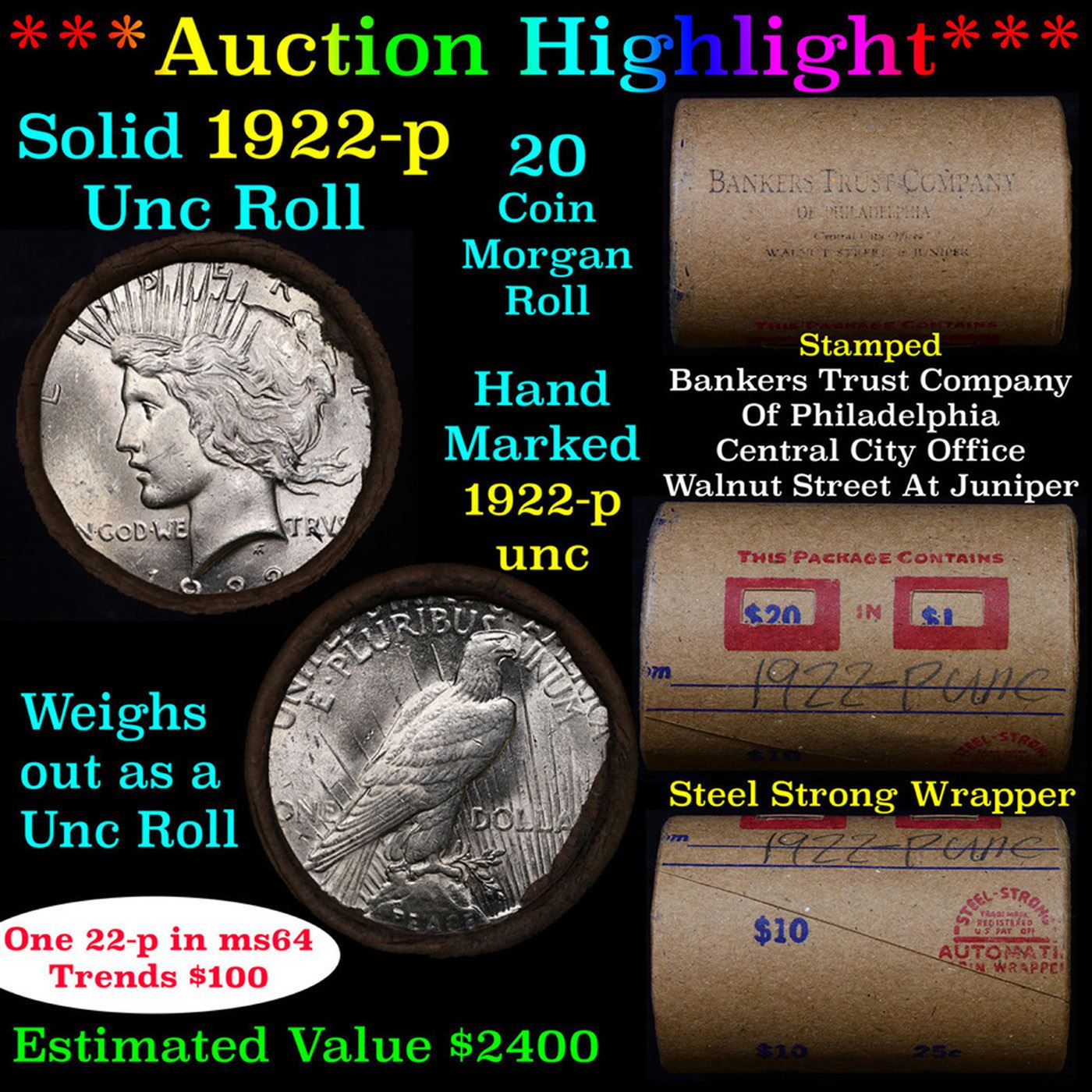 ***Auction Highlight*** Full solid date 1922-p Uncirculated Peace silver dollar roll, 20 coins. This roll is held in an old Steel strong wrapper, patented 1921, stamped "Bankers Trust Company of Philadelphia, Walnut Street at Juniper. 1922-p Uncirculated Peace Dollar Roll, Superb Ends. Weighs Perfectly as an Uncirculated Roll. Trends in ms64 is $110 and ms63 is $90. One ms66 is $725 and one ms65 is $215.