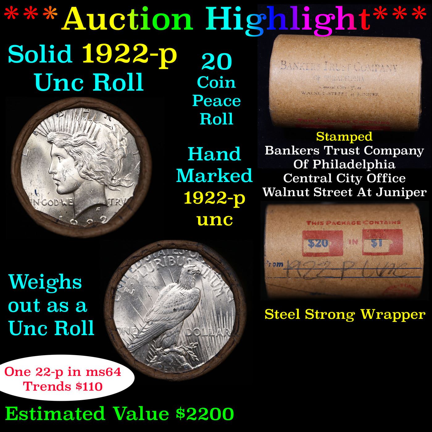 ***Auction Highlight*** Full solid date 1922-p Uncirculated Peace silver dollar roll, 20 coins. This roll is held in an old Steel strong wrapper, patented 1921, stamped "Bankers Trust Company of Philadelphia, Walnut Street at Juniper. 1922-p Uncirculated Peace Dollar Roll, Superb Ends. Weighs Perfectly as an Uncirculated Roll. Trends in ms64 is $110 and ms63 is $90. One ms66 is $725 and one ms65 is $215.
