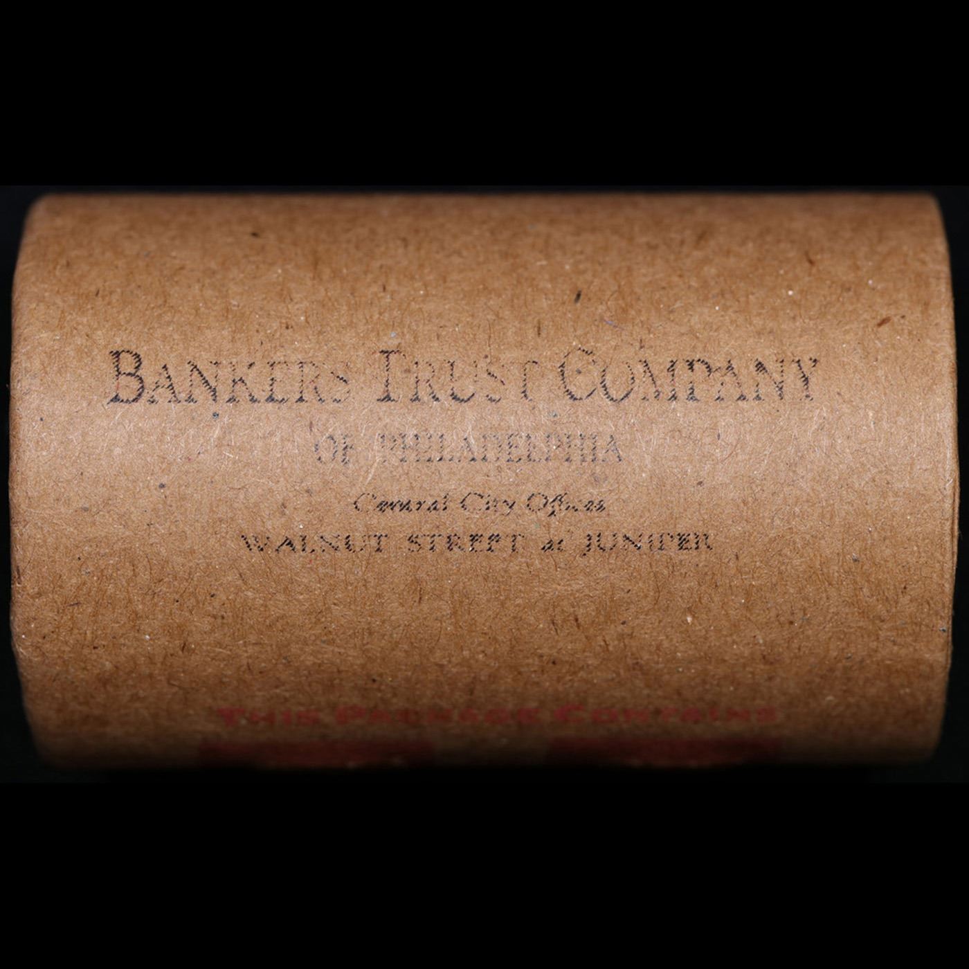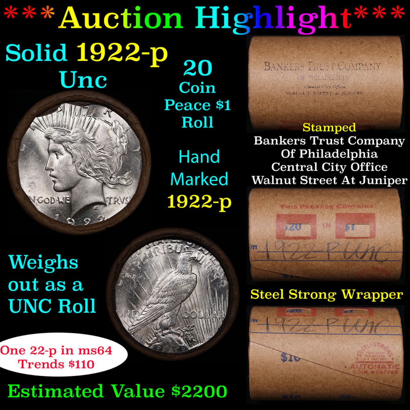 ***Auction Highlight*** Full solid date 1922-p Uncirculated Peace silver dollar roll, 20 coins. This roll is held in an old Steel strong wrapper, patented 1921, stamped "Bankers Trust Company of Philadelphia, Walnut Street at Juniper. 1922-p Uncirculated Peace Dollar Roll, Superb Ends. Weighs Perfectly as an Uncirculated Roll. Trends in ms64 is $110 and ms63 is $90. One ms66 is $725 and one ms65 is $215.