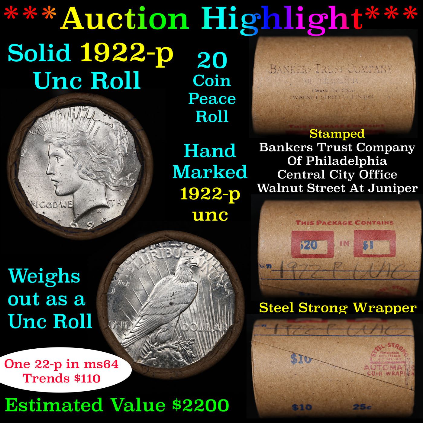 ***Auction Highlight*** Full solid date 1922-p Uncirculated Peace silver dollar roll, 20 coins (fc)