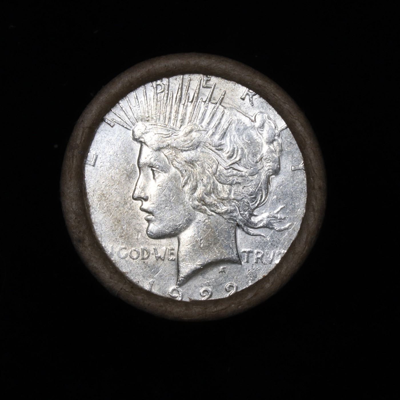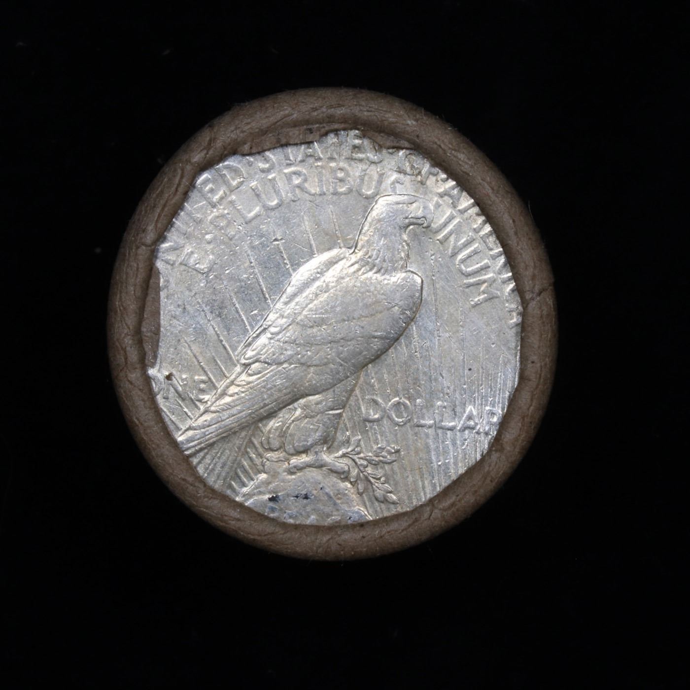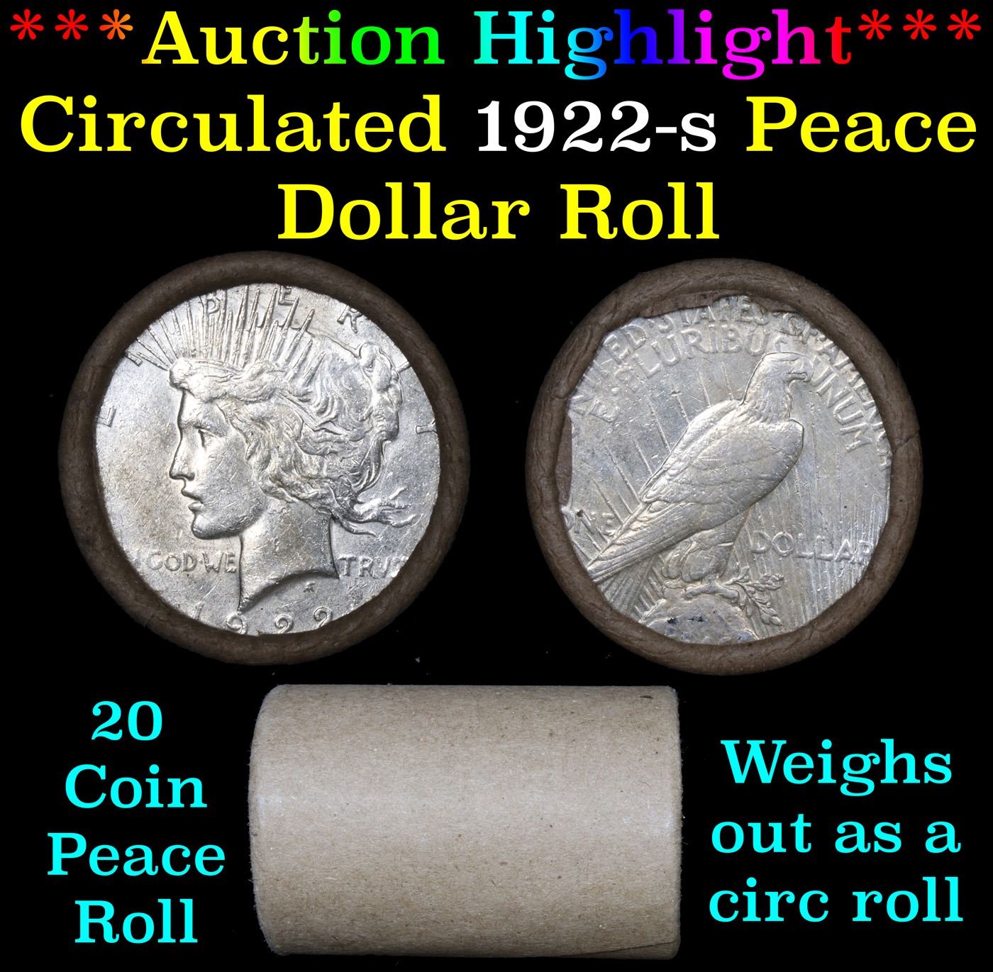 ***Auction Highlight*** Full solid date 1922-s Peace silver dollar roll. Full solid date 1922-s Peace silver dollar roll, 20 coins Grades. This roll is held in an old Steel strong wrapper This roll contains 20, 1922-s Pease silver Dollars. The coins may range from circulated to uncirculated. Any condition is possible. We have weighed the roll and can assure you that it is 20 Silver Dollars, that all 20 are 1922-s and that it is not an uncirculated roll as the weight comes in slightly under the 534.60 grams that a fully uncirculated roll would weigh. We recently Acquired a large Estate Hoard of solid date Rolls.