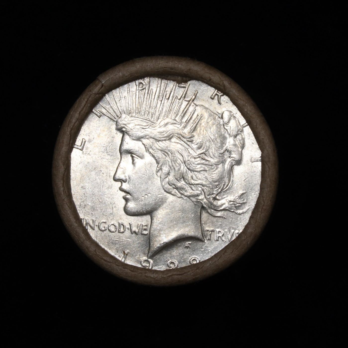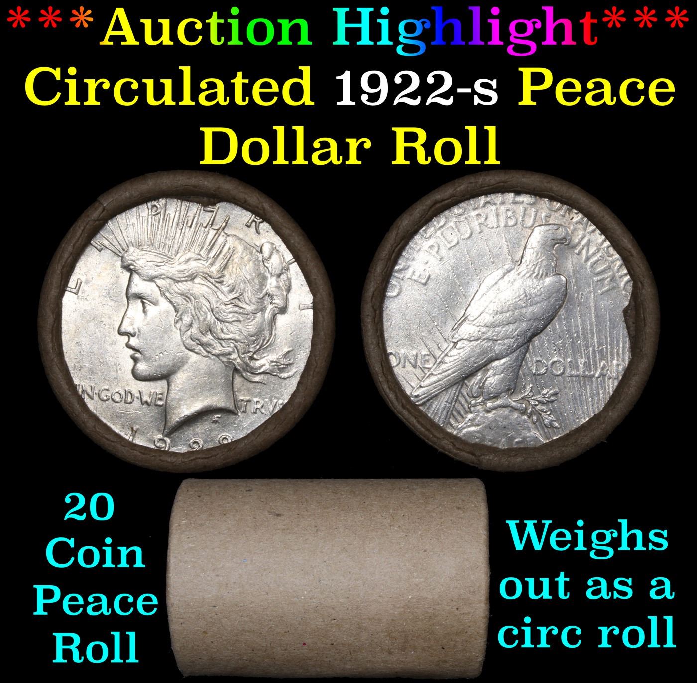 ***Auction Highlight*** Full solid date 1922-s Peace silver dollar roll. Full solid date 1922-s Peace silver dollar roll, 20 coins Grades. This roll is held in an old generic brown wrapper. This roll contains 20, 1922-s Pease silver Dollars. The coins may range from circulated to uncirculated. Any condition is possible. We have weighed the roll and can assure you that it is 20 Silver Dollars, that all 20 are 1922-s and that it is not an uncirculated roll as the weight comes in slightly under the 534.60 grams that a fully uncirculated roll would weigh. We recently Acquired a large Estate Hoard of solid date Rolls.