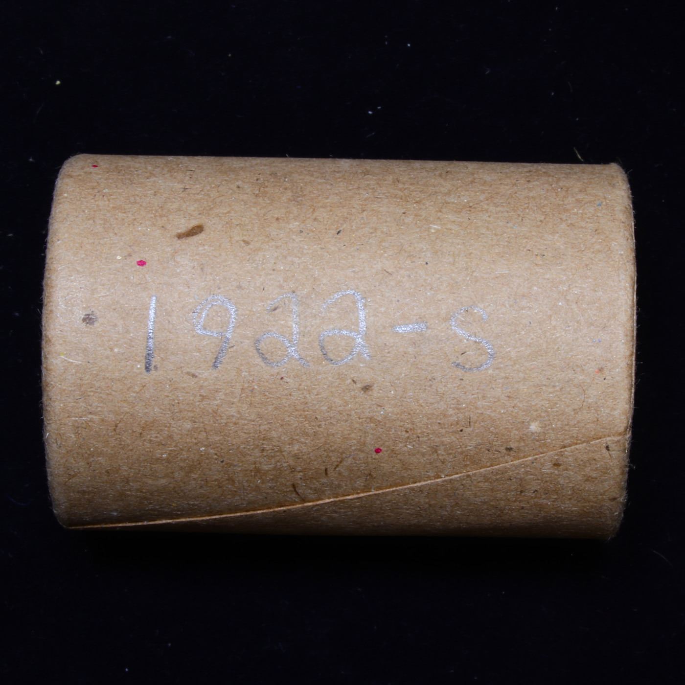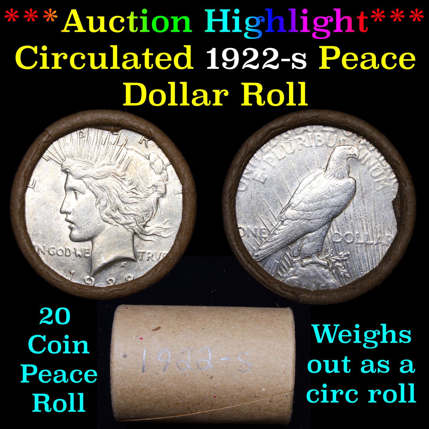 ***Auction Highlight*** Full solid date 1922-s Peace silver dollar roll. Full solid date 1922-s Peace silver dollar roll, 20 coins Grades. This roll is held in an old generic brown wrapper. This roll contains 20, 1922-s Pease silver Dollars. The coins may range from circulated to uncirculated. Any condition is possible. We have weighed the roll and can assure you that it is 20 Silver Dollars, that all 20 are 1922-s and that it is not an uncirculated roll as the weight comes in slightly under the 534.60 grams that a fully uncirculated roll would weigh. We recently Acquired a large Estate Hoard of solid date Rolls.